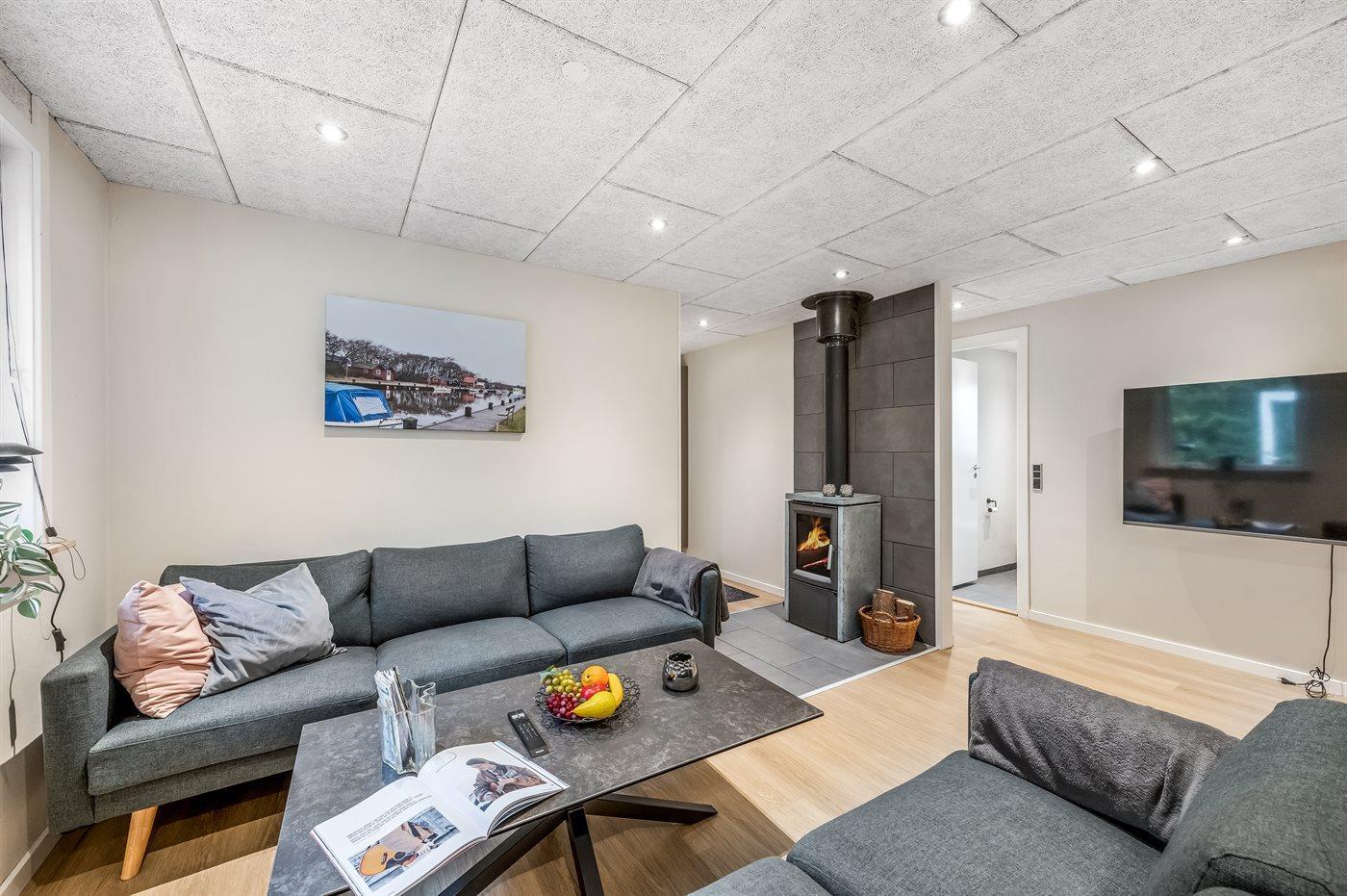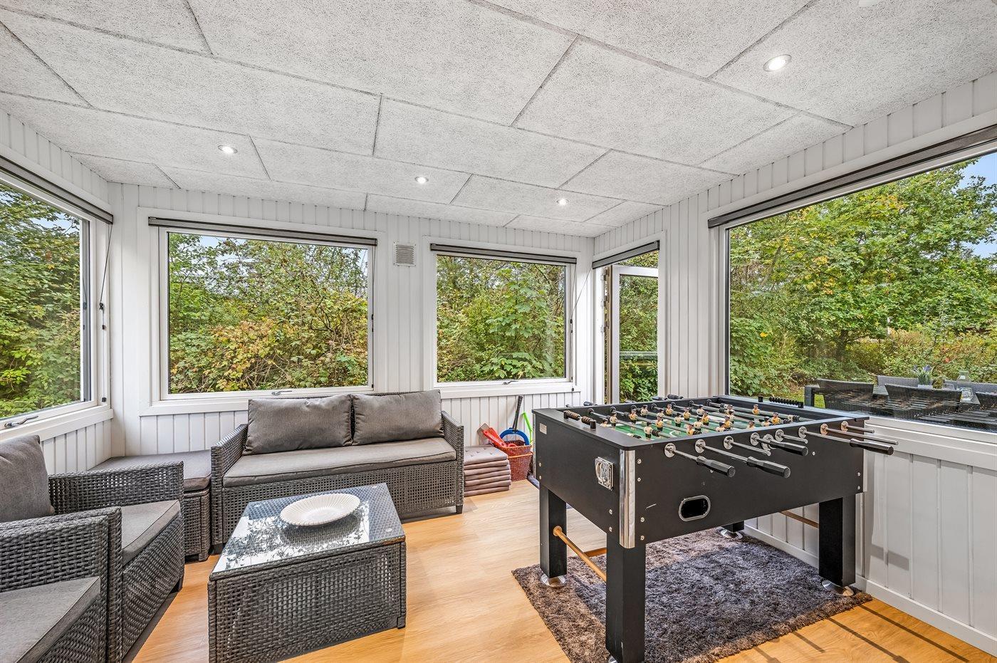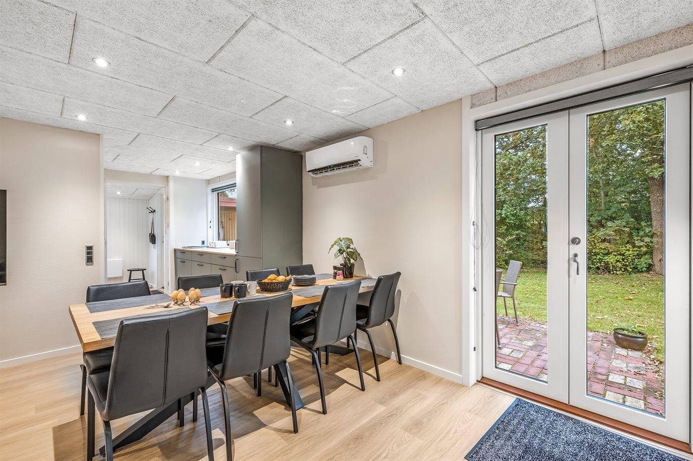 Feriehuset blev totalrenoveret i 2023 og fremstår moderne med kvalitetsmaterialer. Indretningen rummer fire gode værelser samt et lyst og åbent køkken-alrum i forbindelse med stuen. Fra stuen er der adgang til en hyggelig udestue via en stor skydedør, som også leder videre ud til haven.