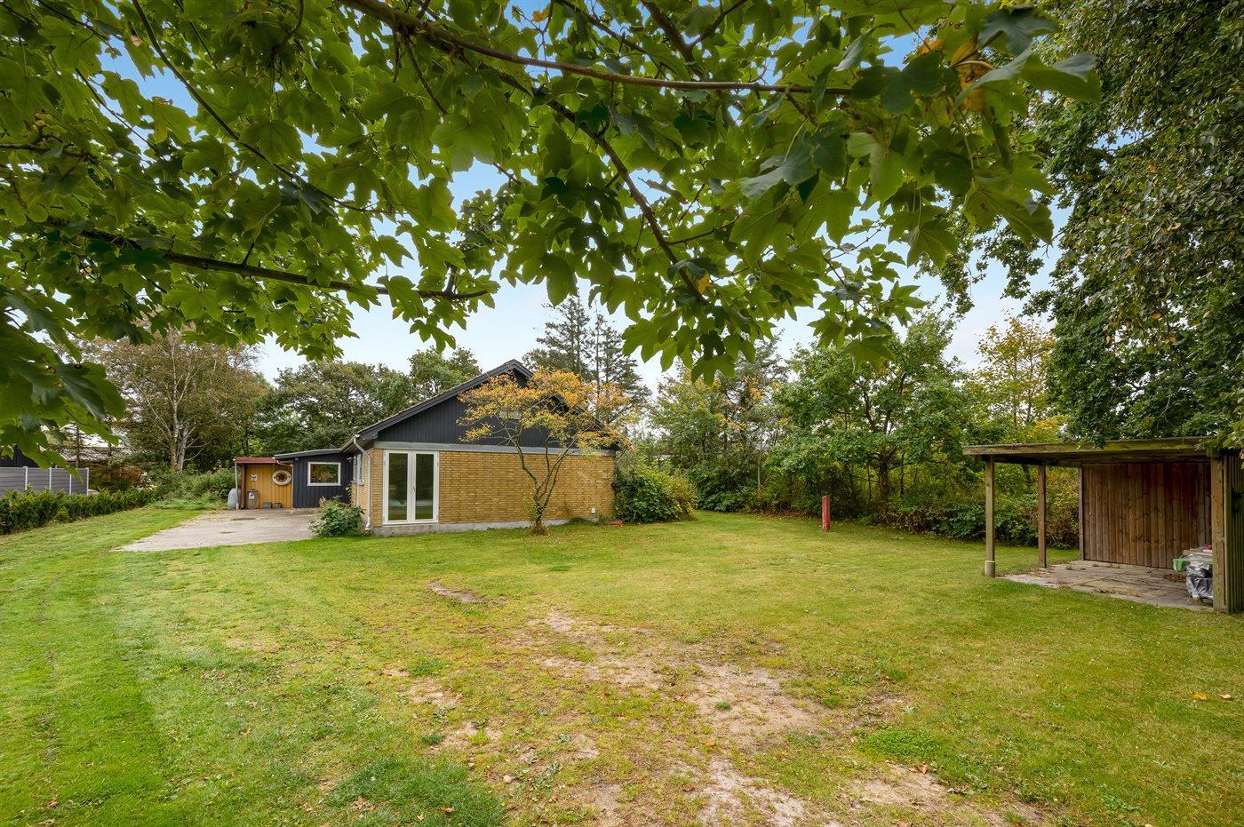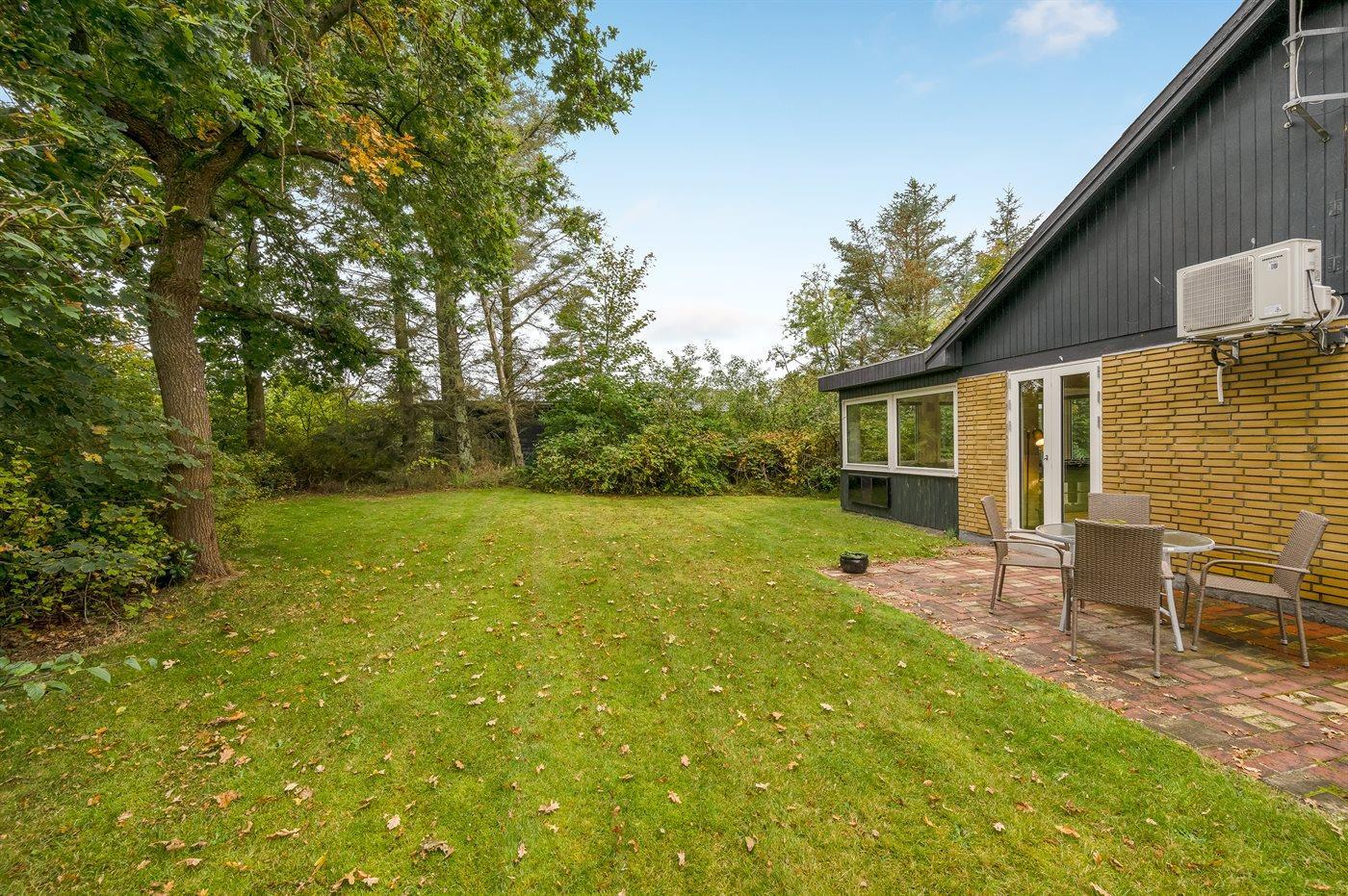 Ferieboligen er beliggende på en 1200 m² stor naturgrund. Der er 300 m til fjorden. Nærmeste forretning er beliggende i en afstand af 850 m. Der er en golfbane i en afstand af 7500 m. Til ferieboligen hører åbent terrasseareal. Ligeledes er der adgang til udestue. Legetårn med gynge og rutchebane. Udendørs sauna. Udendørs bruser. Der er installeret stik til opladning af elbil. Med 11 kW ladeeffekt. Parkering ved ferieboligen.