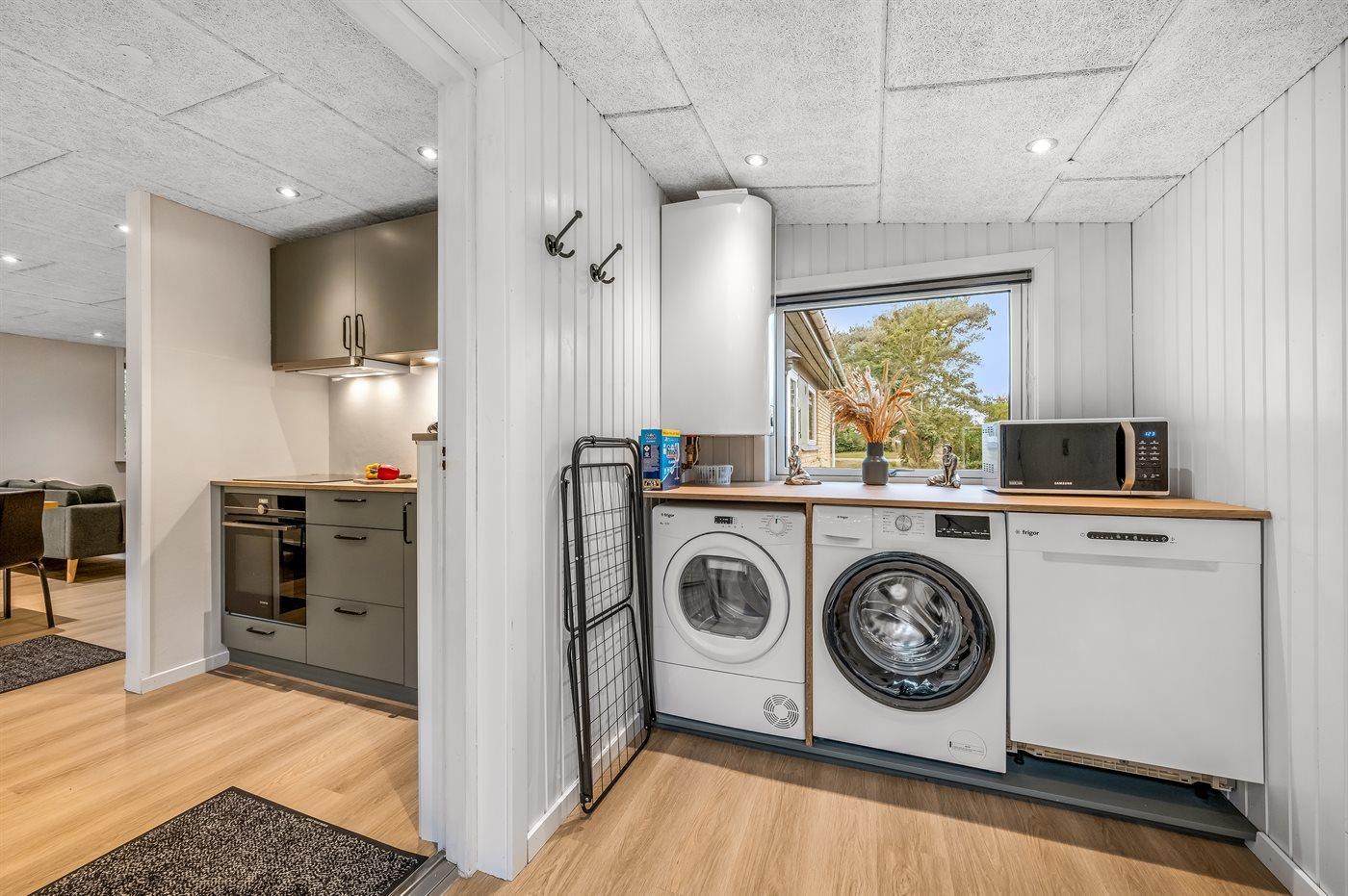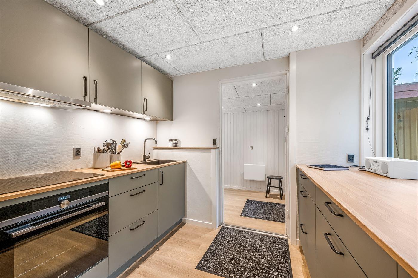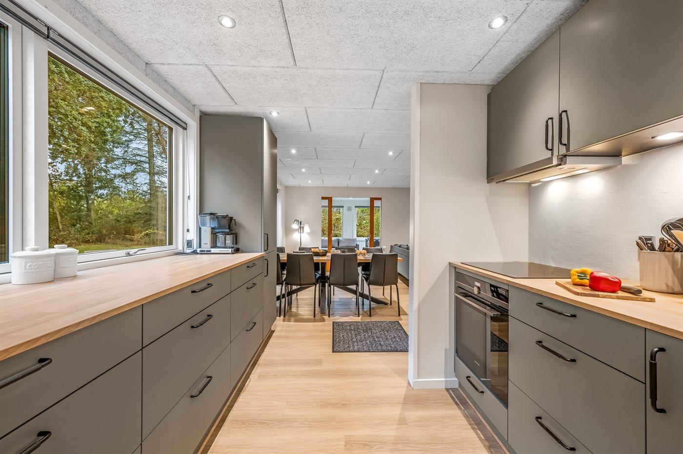 Køkkenet er udstyret med 1 køleskab. Der er 4 induktionskogeplader, varmluftovn, mikrobølgeovn samt opvaskemaskine.