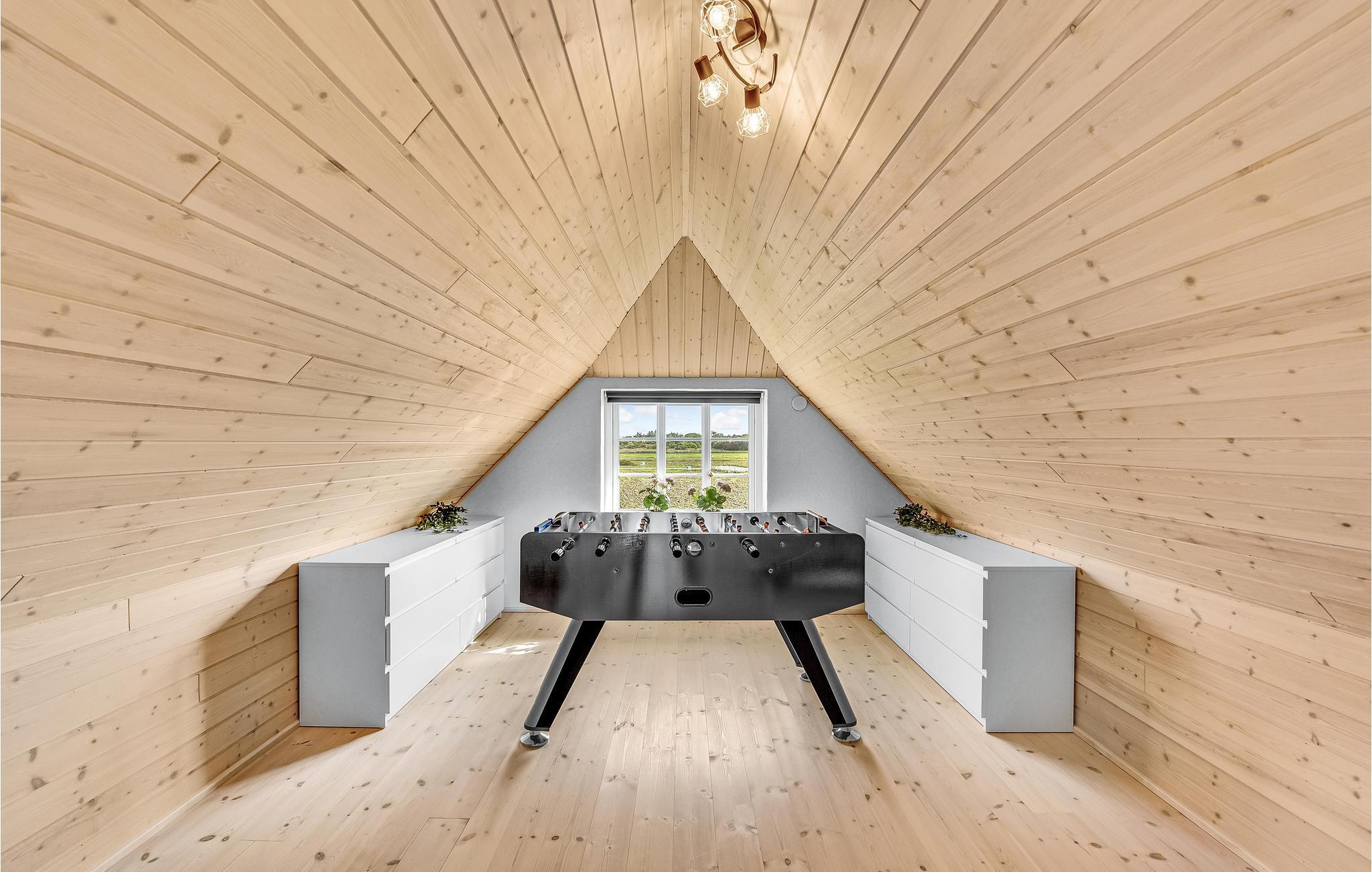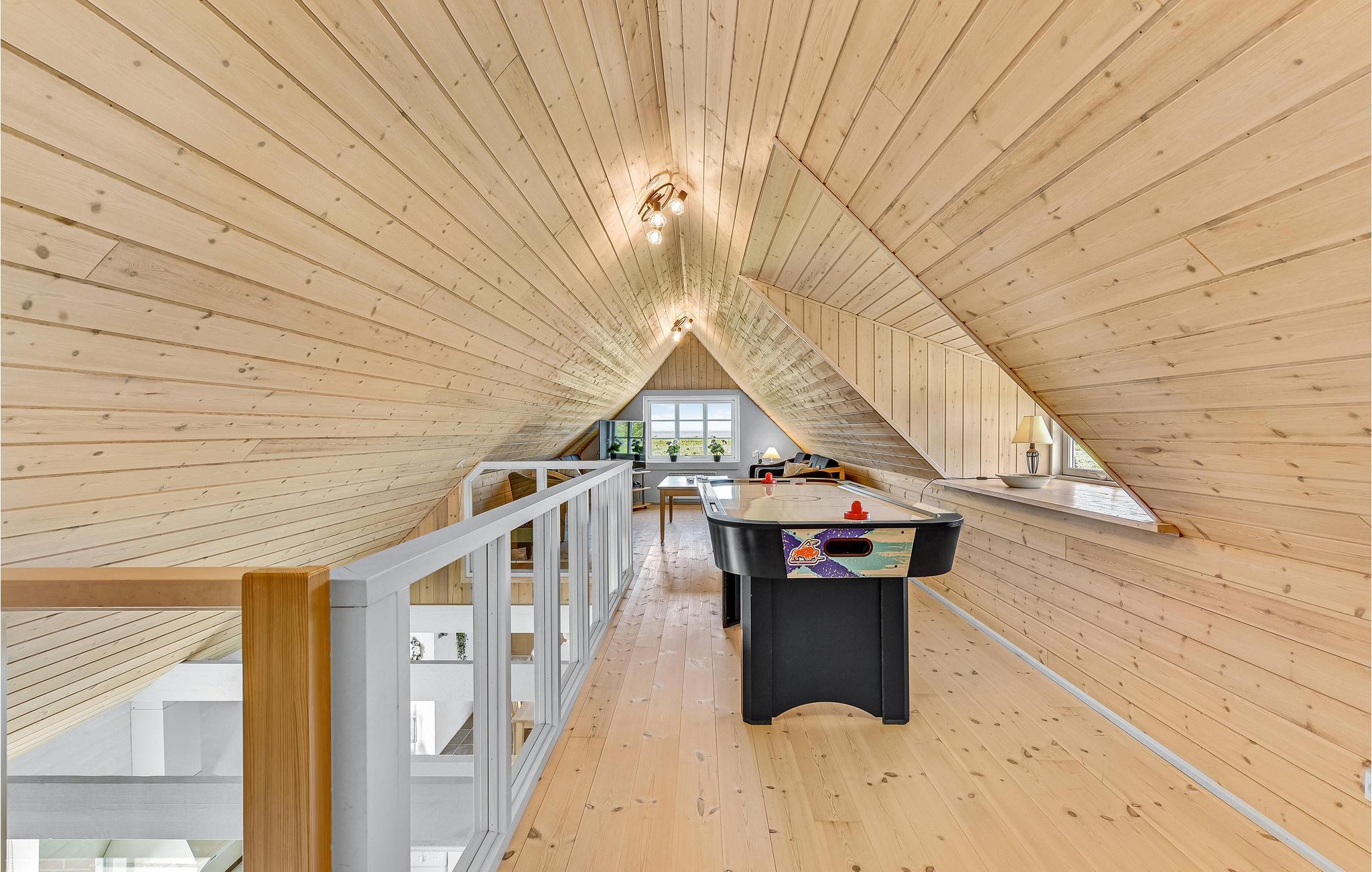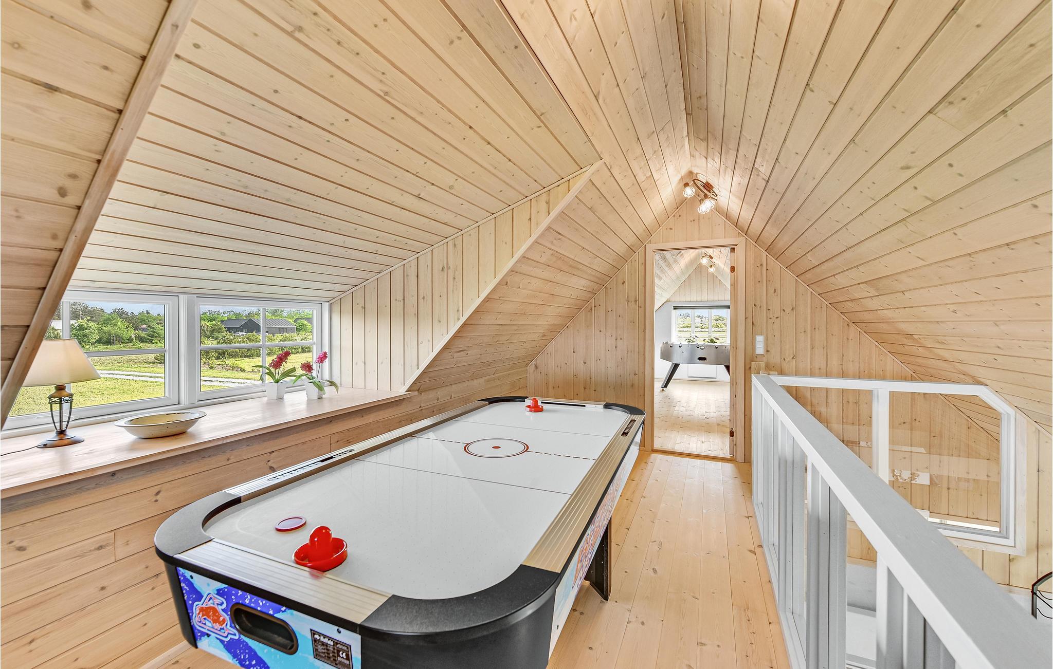 Velkommen til dette rummelige sommerhus, hvor I kan nyde en afslappende ferie med hele familien eller en gruppe venner. Nyd panoramaudsigten over landskabet fra stuen på 1. sal, som tilbyder en vidunderlig udsigt over Ringkøbing Fjord, som I også kan se fra stueetagen. Tilbring mange hyggelige timer ved pejsen eller forkæl krop og sind med velvære og afslapning. Der er både sauna og boblebad inde i huset. Inde i huset finder I desuden et aktivitetsrum med bordfodbold, airhockey og to senge.