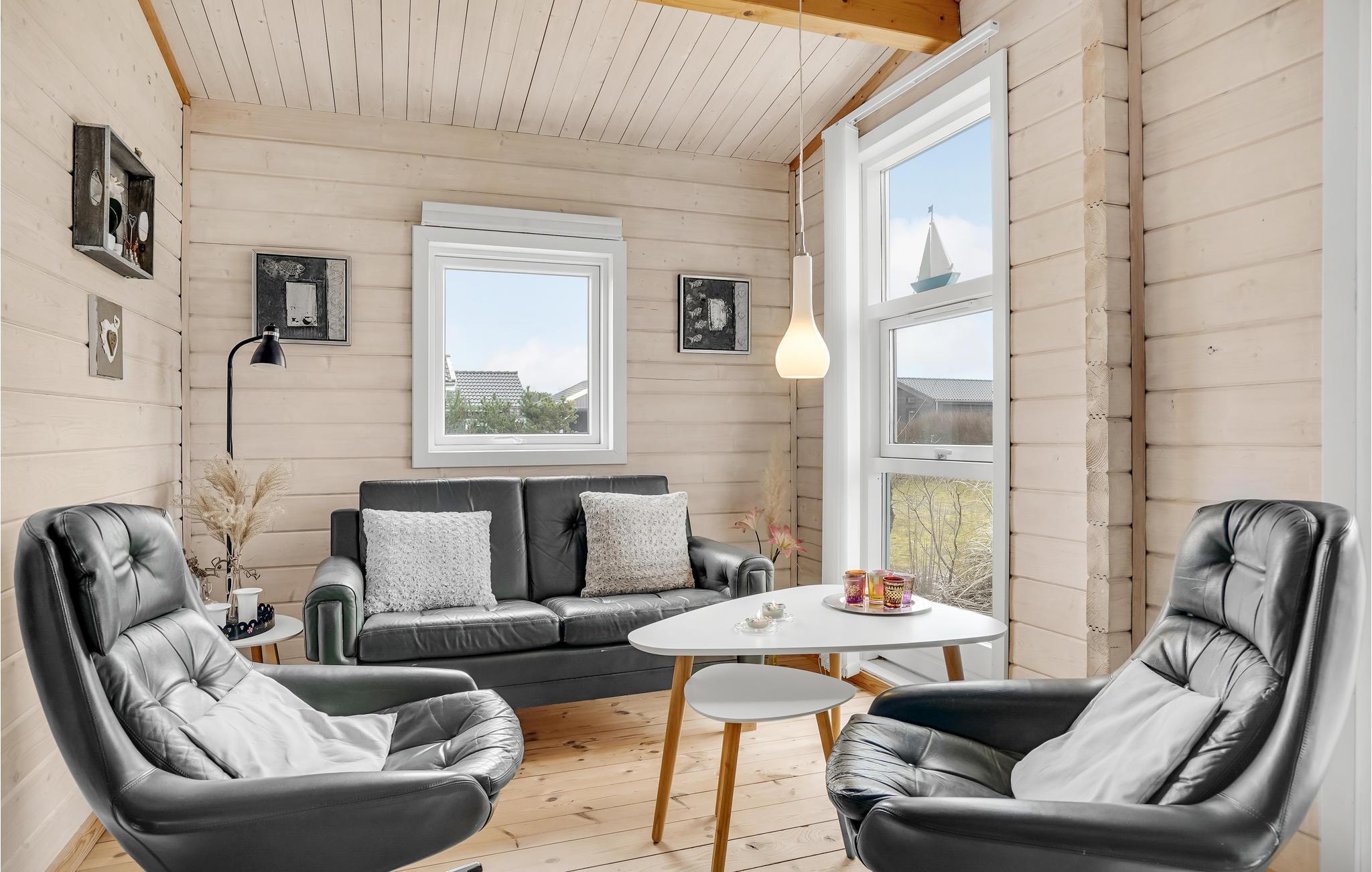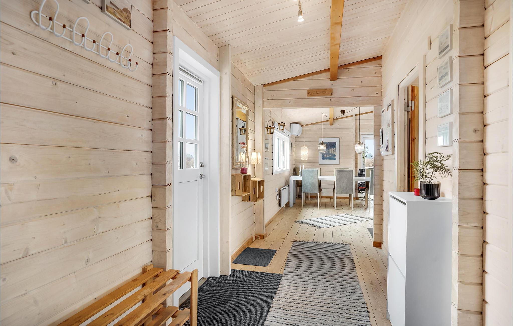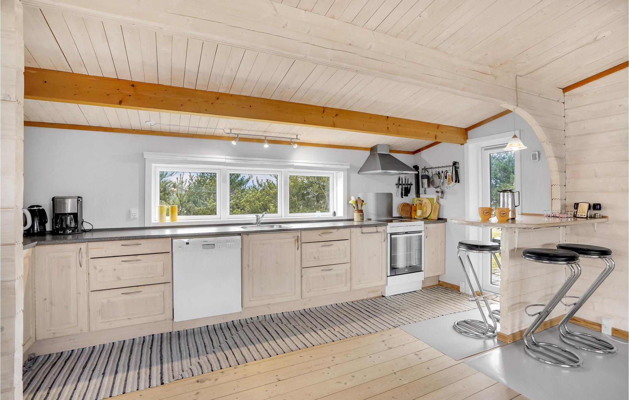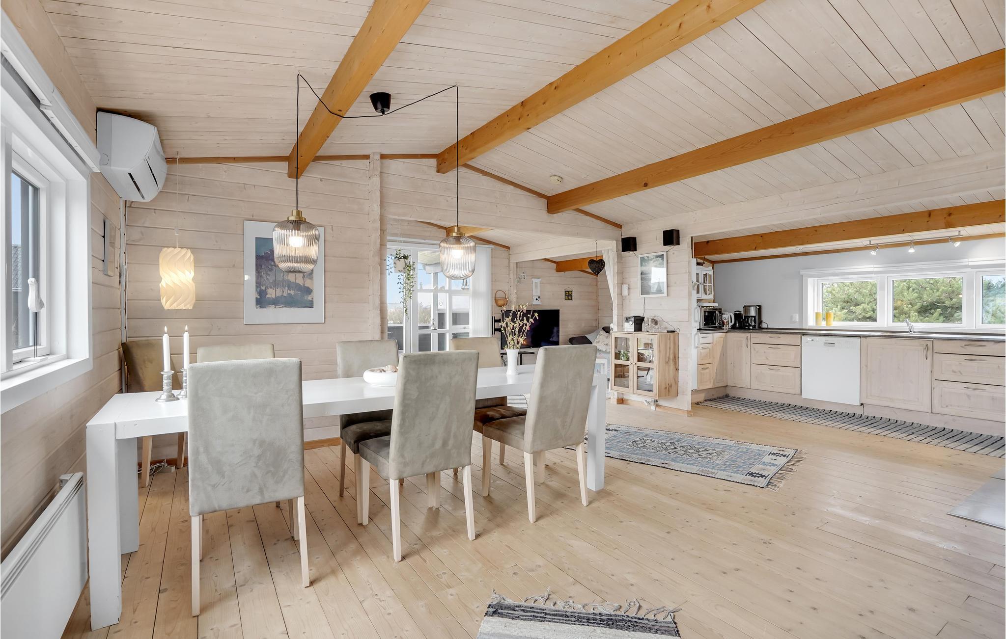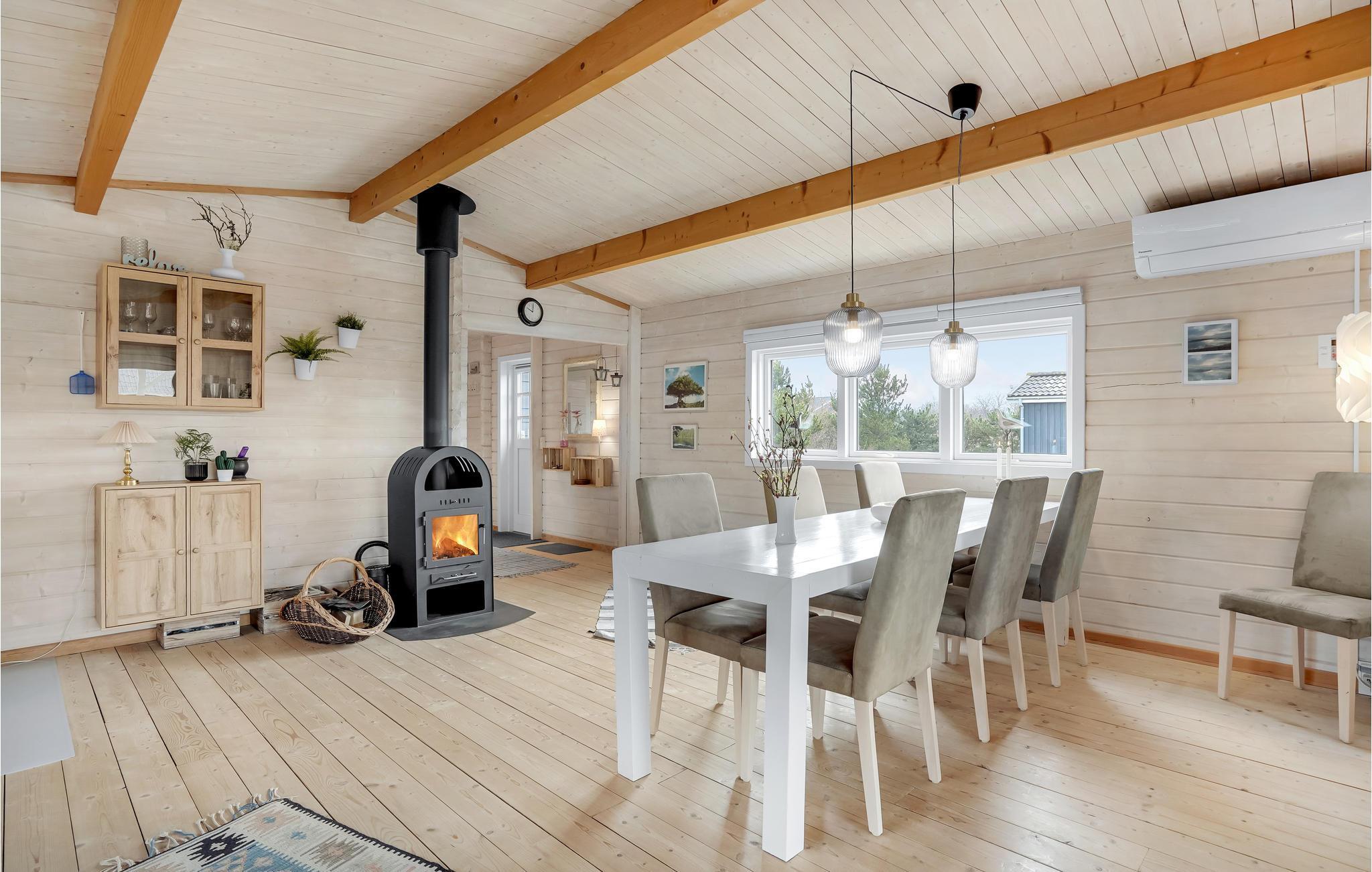Hyggeligt bjælkesommerhus nær Ringkøbing Fjord med moderne køkken, terrasse og flere varmekilder.