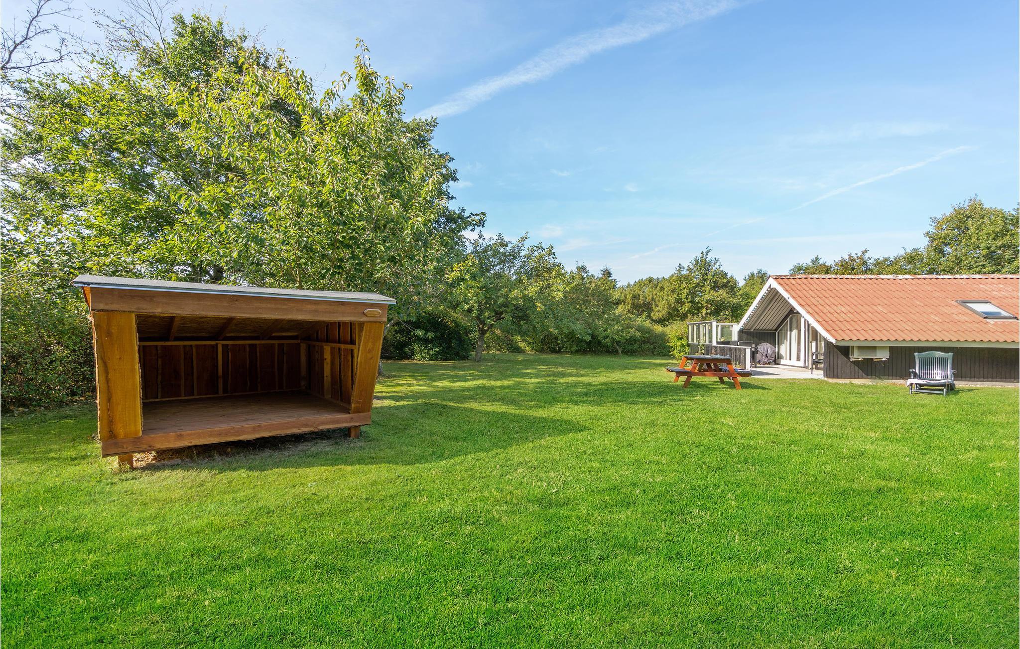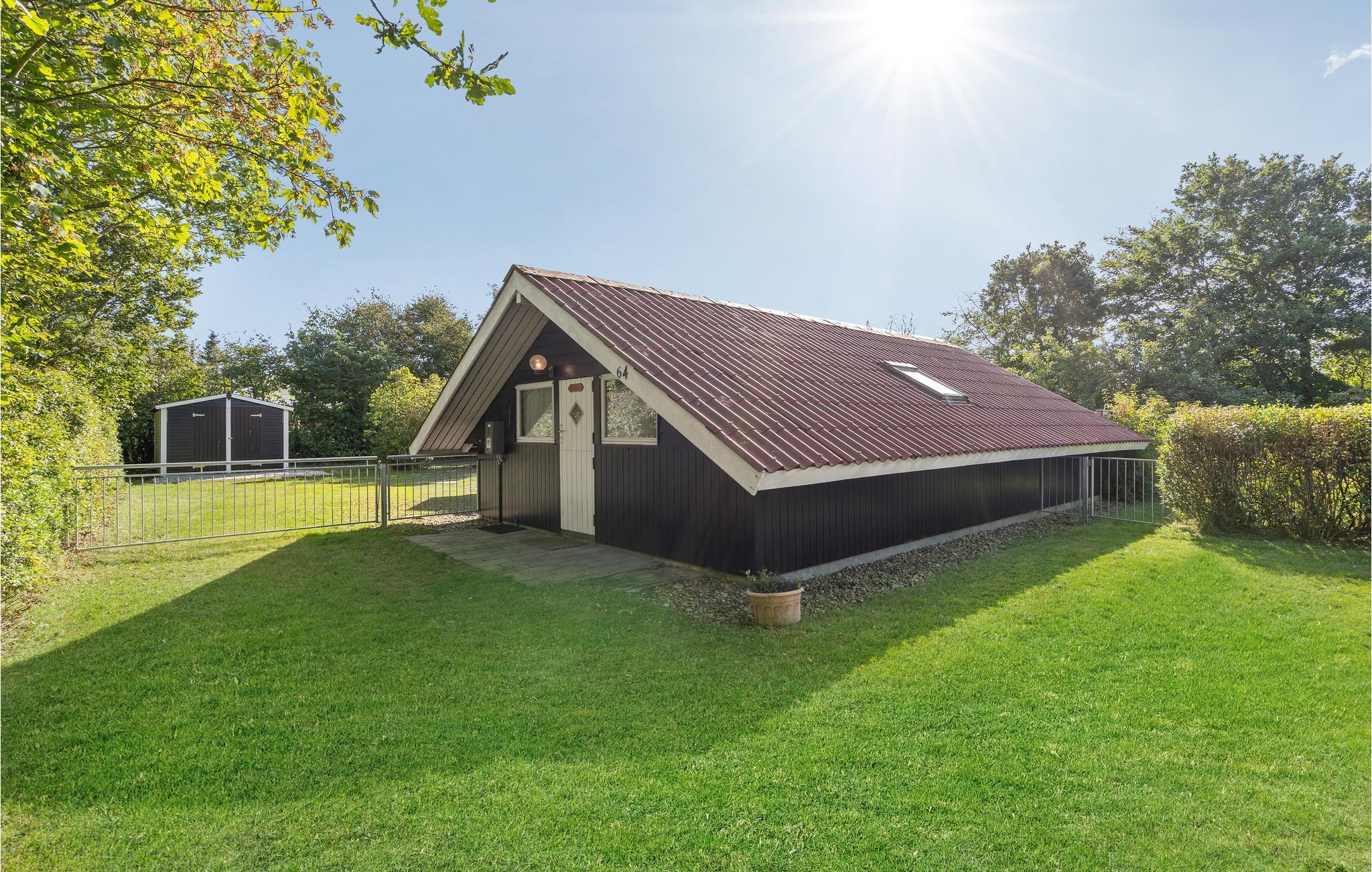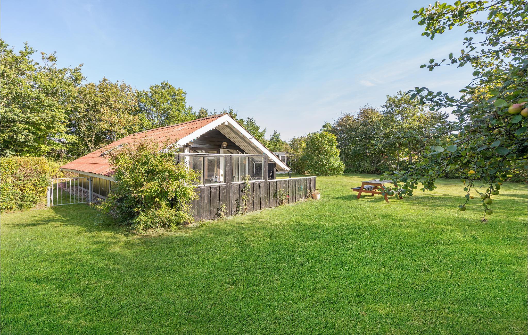 Huset er lyst og velindrettet med et køkken, der ligger i åben forbindelse til stuen, 2 soveværelser og badeværelse med bruser. Fra stuen er der udgang til den delvis overdækkede terrasse, og på den store grund er der god plads til leg og boldspil. I hjørnet af haven er der opsat shelter og bålpads.