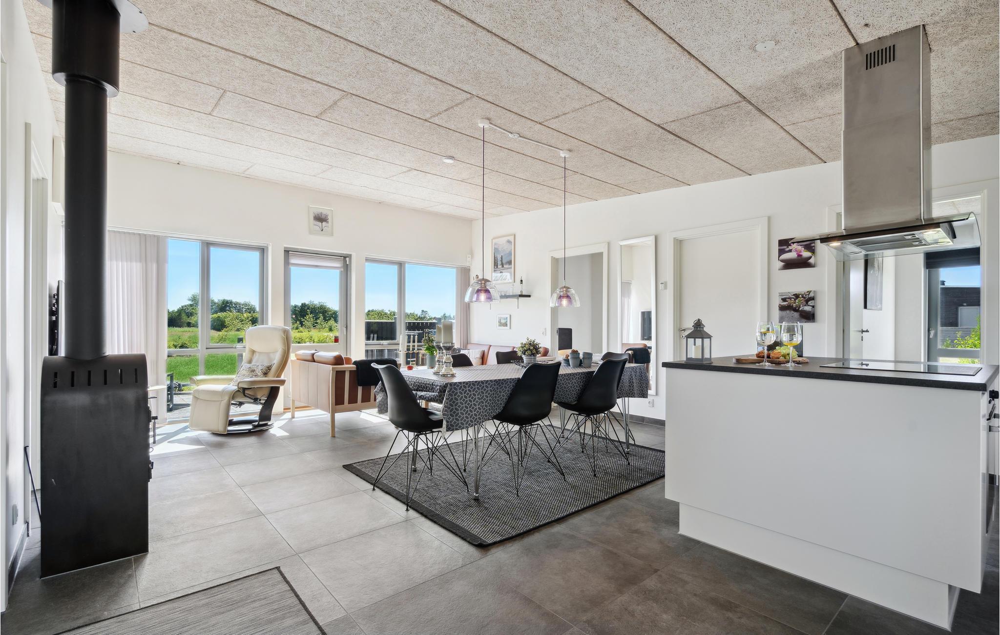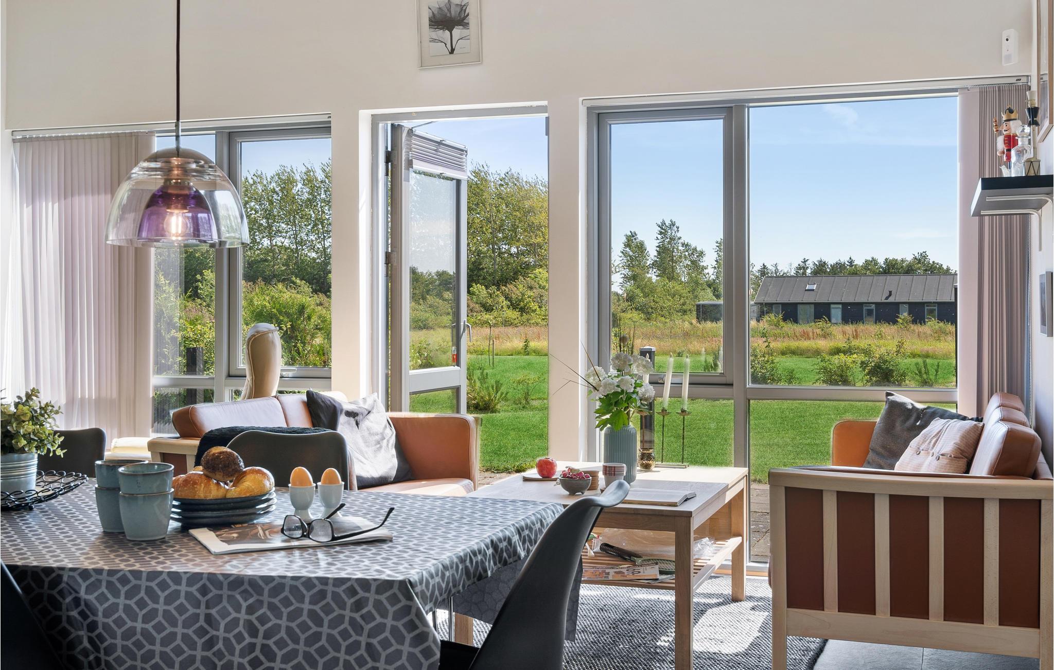Velkommen til dette veludstyrede feriehus, der ligger i Stauning tæt på enge og marker og byder jer indenfor til et behageligt ophold. Med sine lyse rum og moderne indretning er denne bolig det ideelle sted for jer, der søger komfort og nærhed til naturen. Den store vinduesfacade giver et godt lysindfald og en dejlig udsigt over omgivelserne, som I kan se frem til at nyde, mens I er samlet om måltiderne eller slapper af i sofaen. Lyt til den hyggelige knitren fra brændeovnen på kølige aftener, mens I morer jer med jeres yndlingsbrætspil.