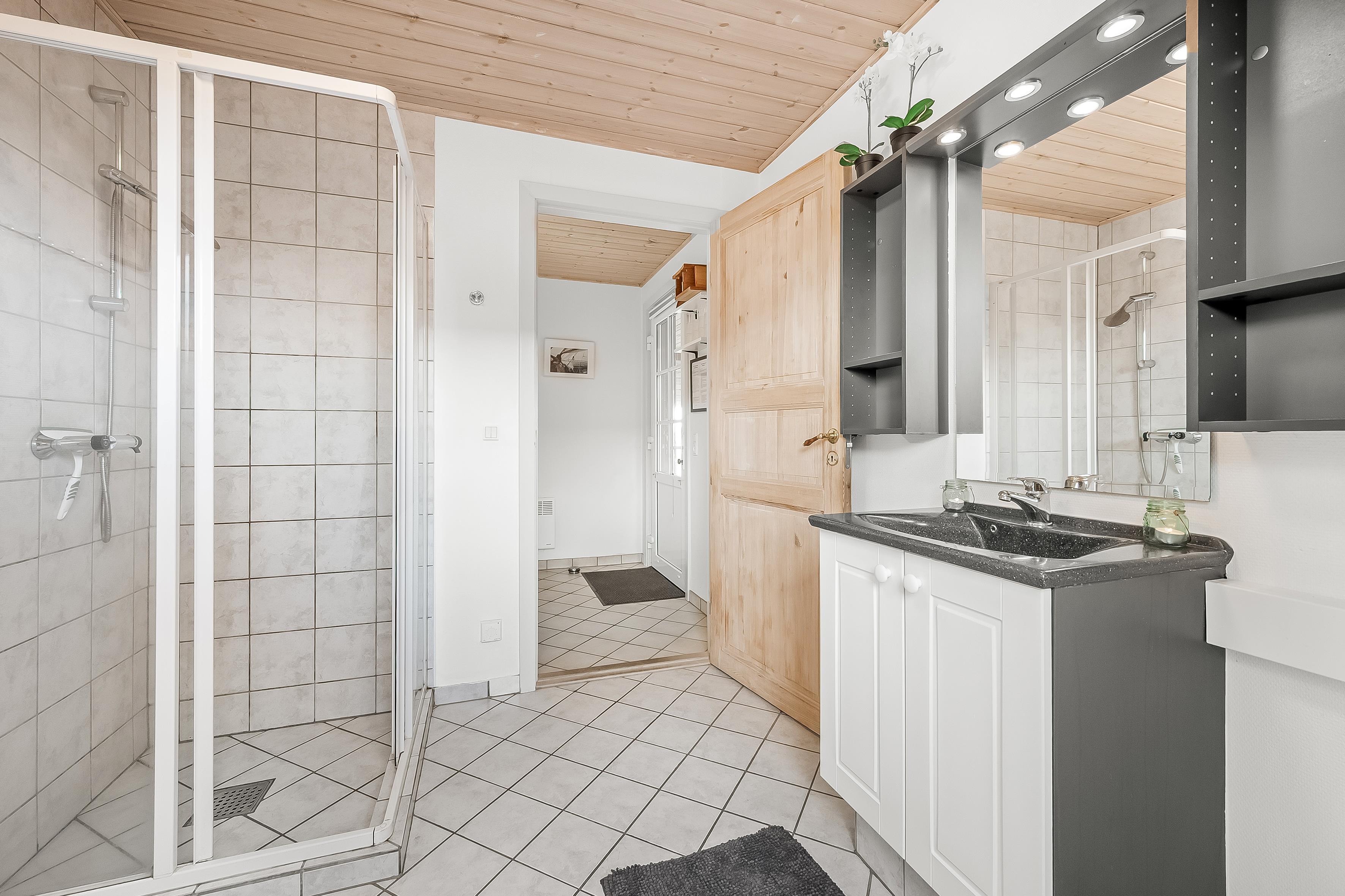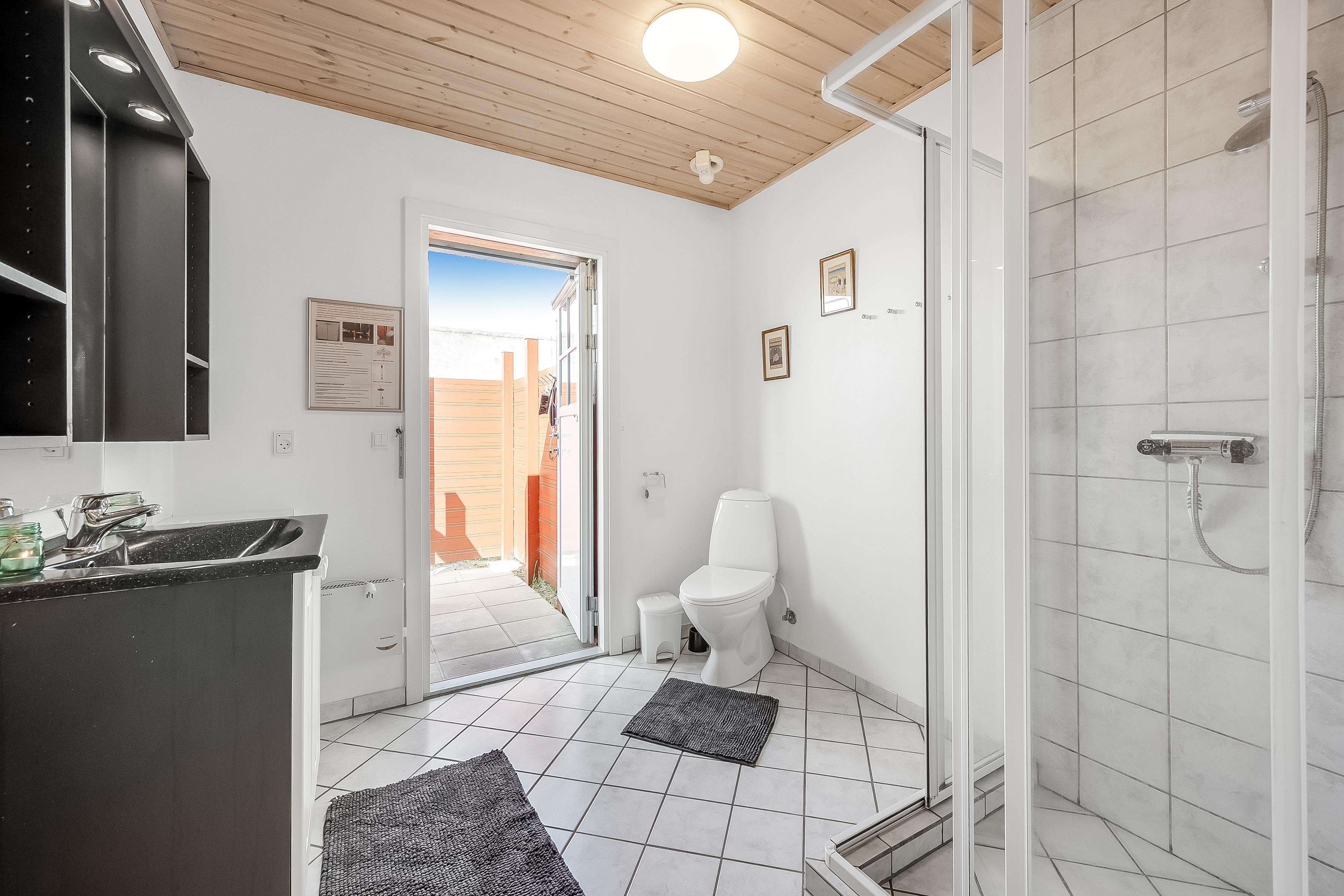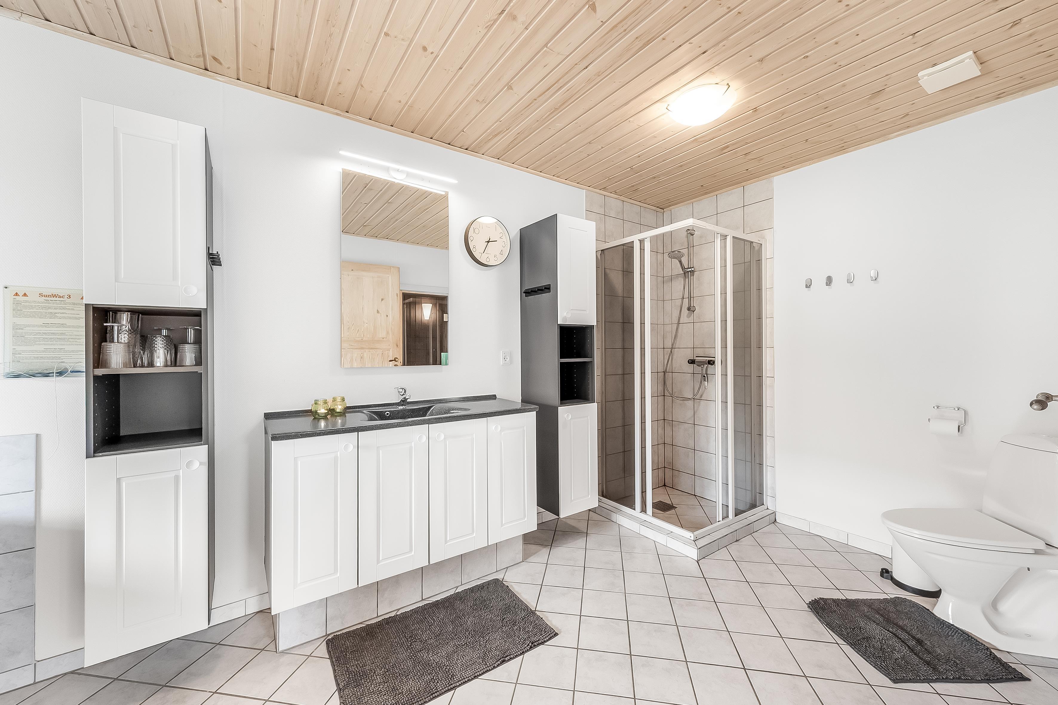 Der er to badeværelser, begge udstyret med bruser og gulvvarme, hvilket sikrer en behagelig oplevelse. Med to toiletter er der god plads til, at alle kan få deres behov opfyldt uden ventetid.