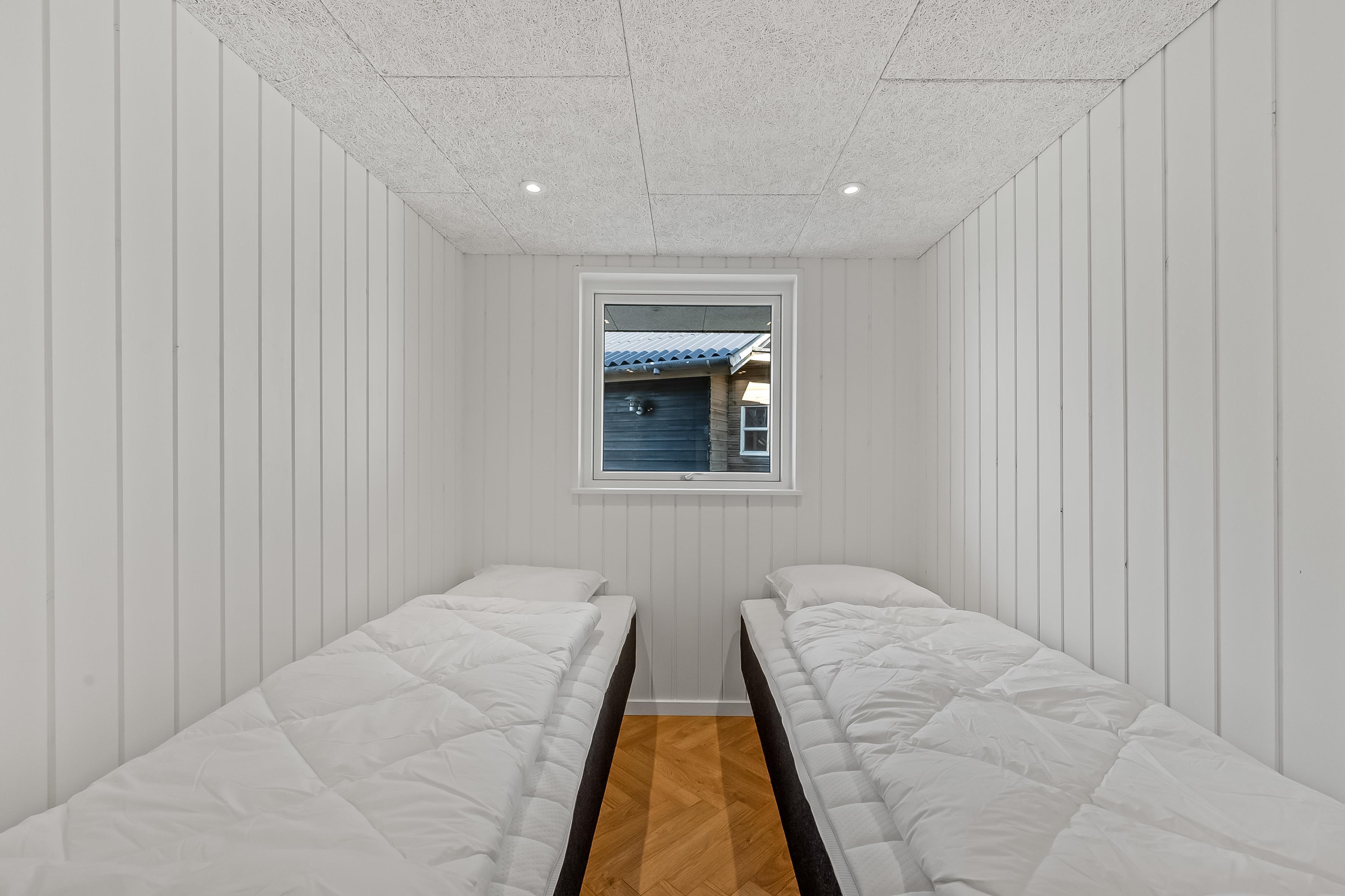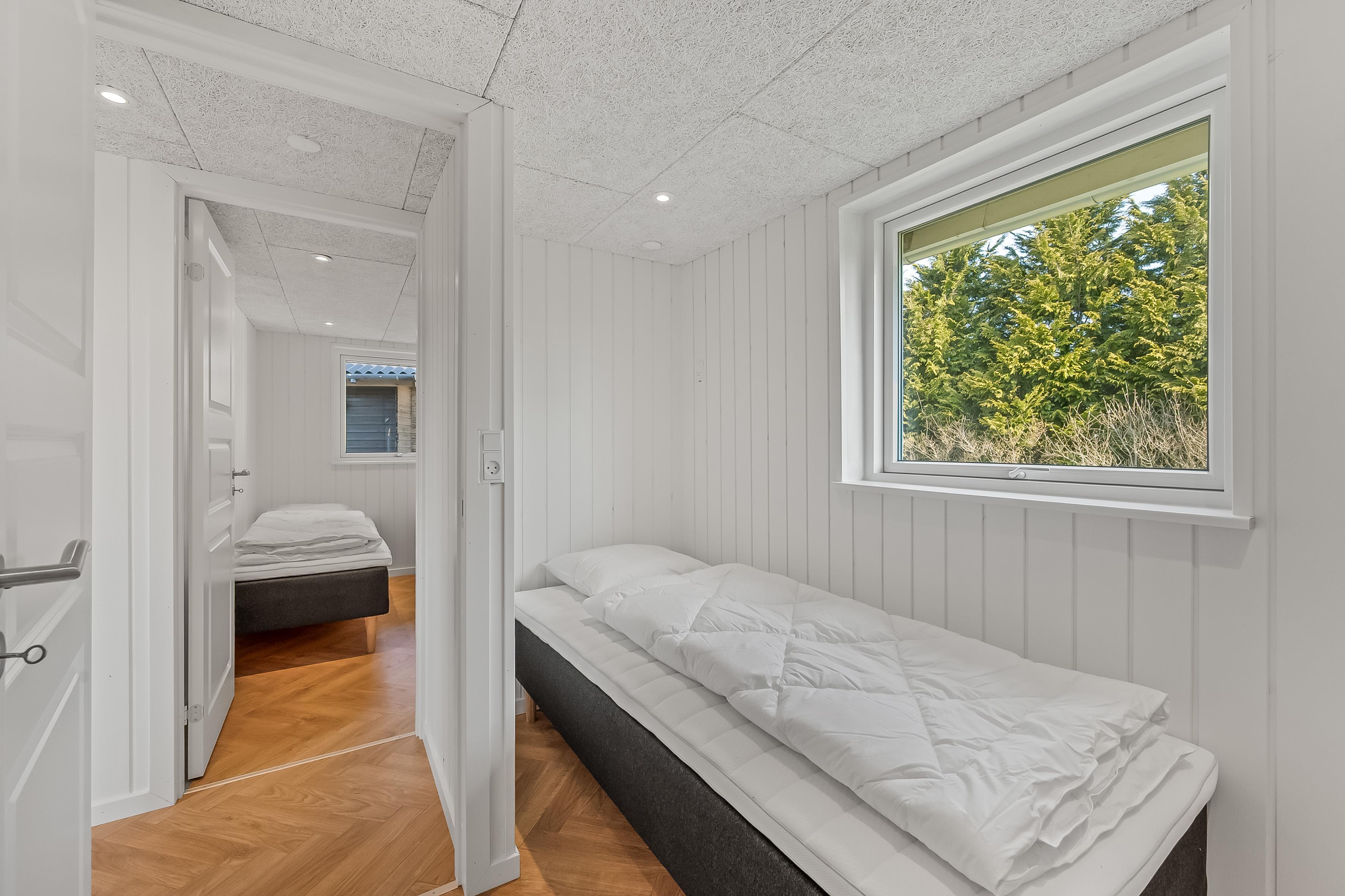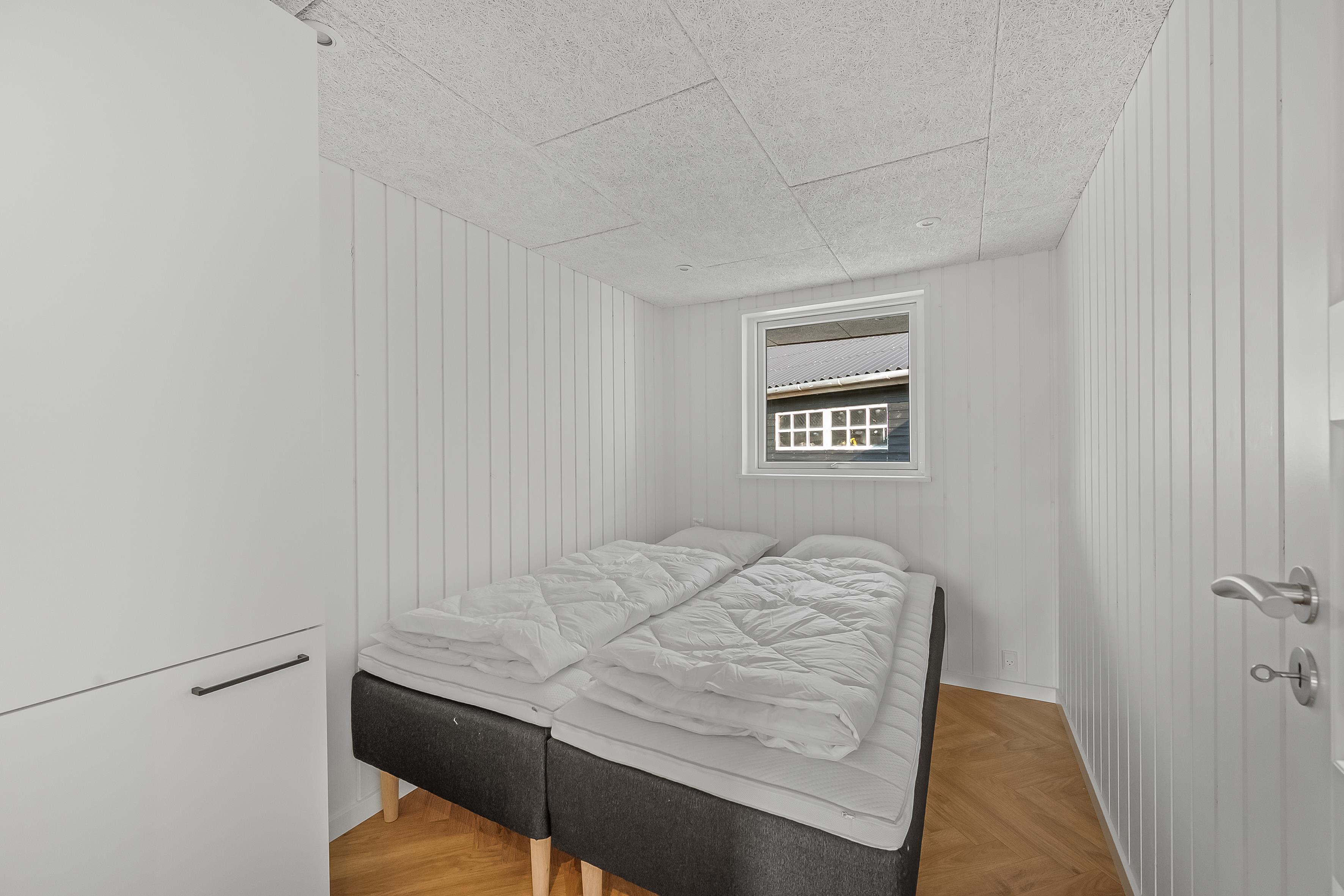 Feriehuset har plads til op til 5 personer, hvilket gør det perfekt til ferie med familie eller venner. Der er tre soveværelser, herunder to med dobbeltsenge og et med en enkeltseng, så der er plads til både par og enkeltpersoner. Hvert værelse er lyst og indbydende, med fokus på komfort og afslapning. Badet er veludstyret med gulvvarme, bruser og toilet, hvilket gør det til et behageligt sted at friske sig op efter en lang dag.