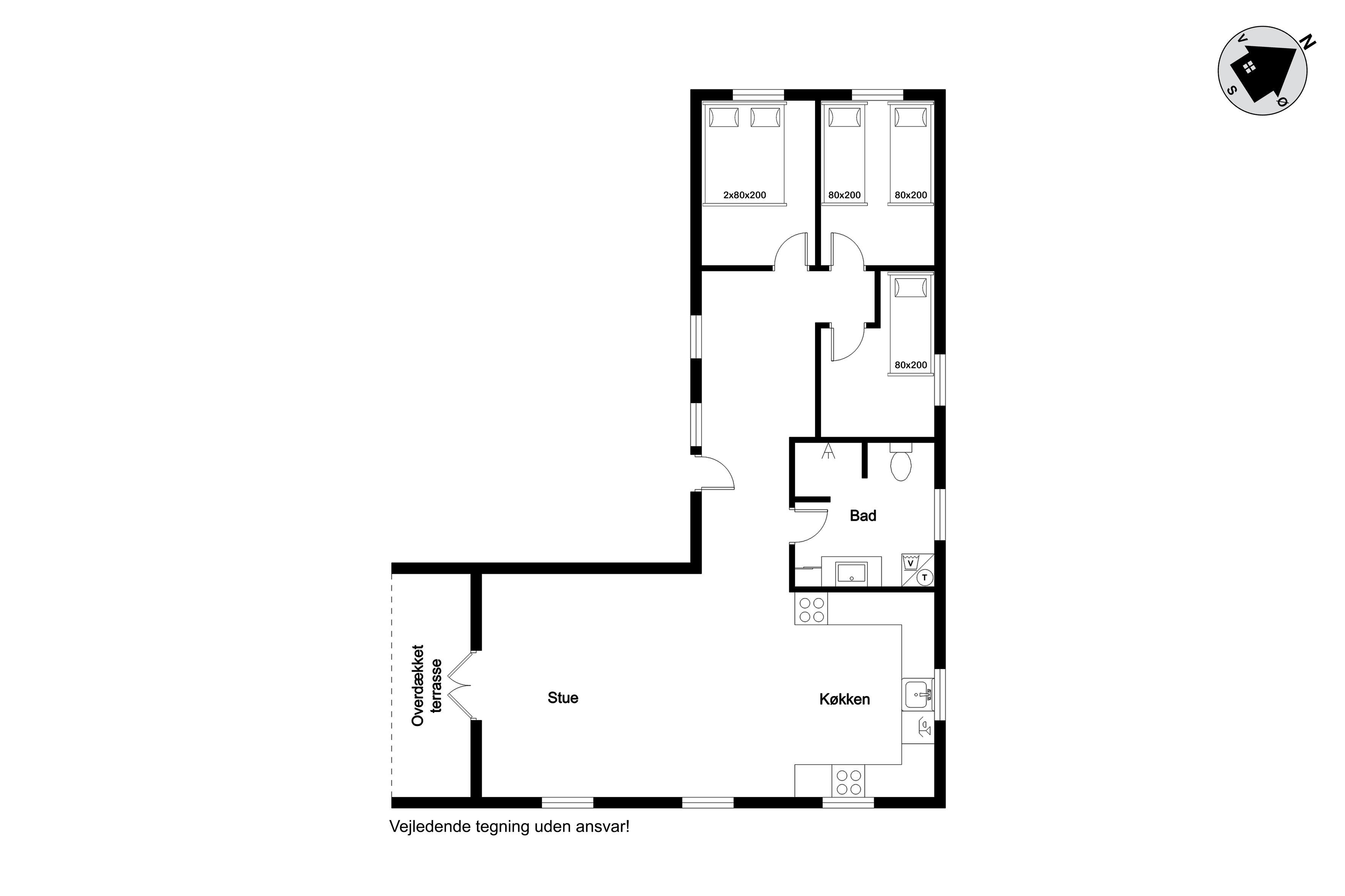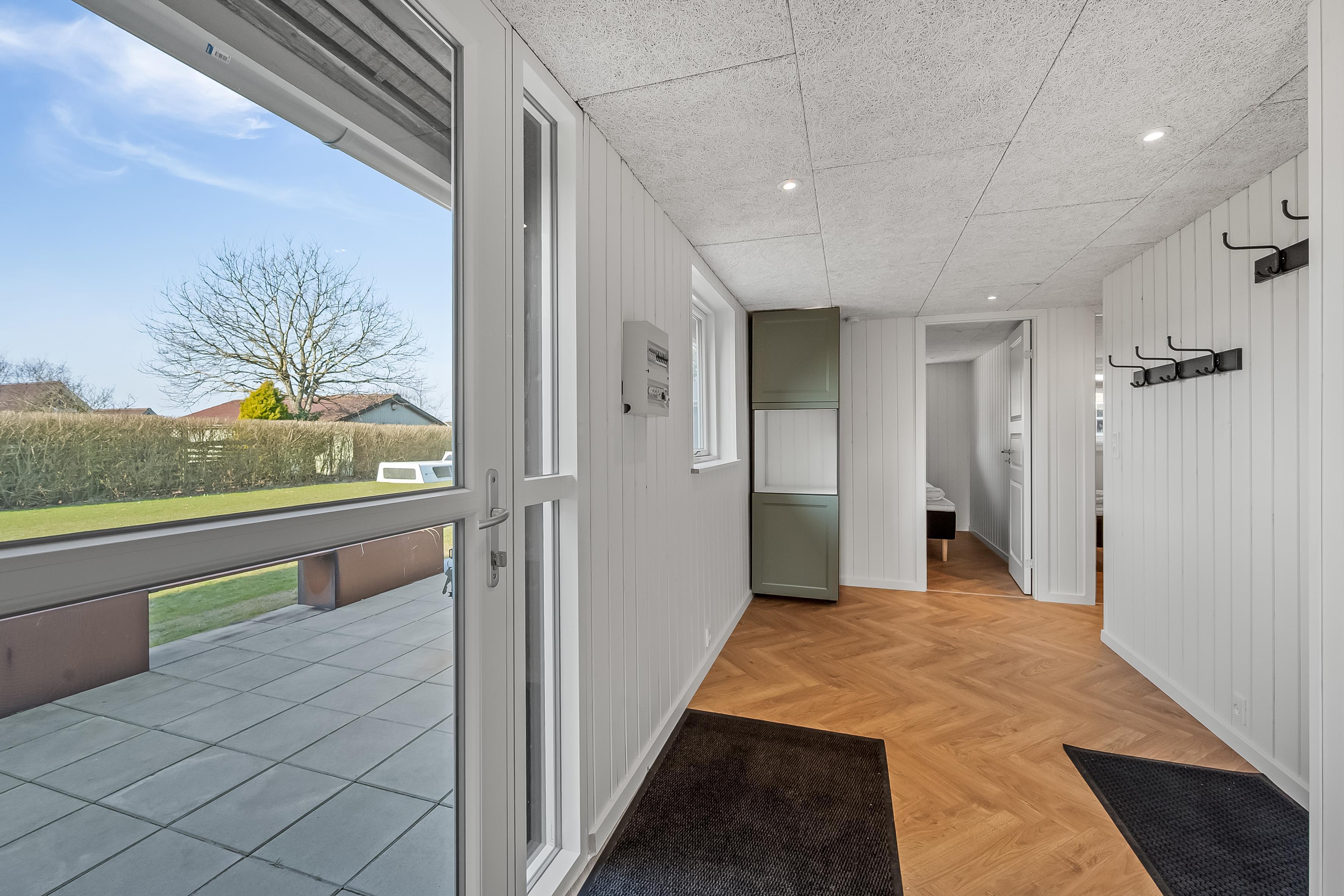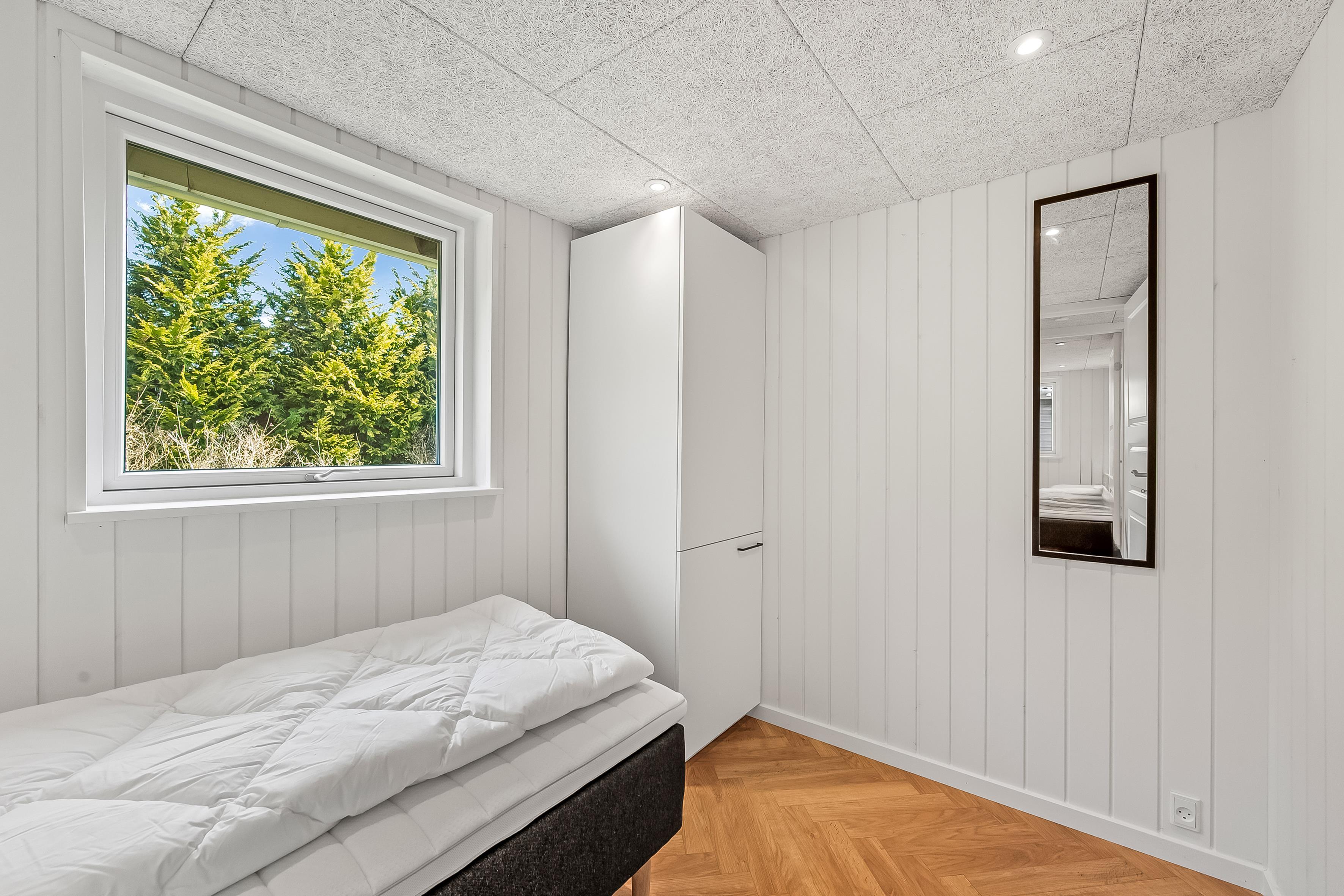Feriehuset har plads til op til 5 personer, hvilket gør det perfekt til ferie med familie eller venner. Der er tre soveværelser, herunder to med dobbeltsenge og et med en enkeltseng, så der er plads til både par og enkeltpersoner. Hvert værelse er lyst og indbydende, med fokus på komfort og afslapning. Badet er veludstyret med gulvvarme, bruser og toilet, hvilket gør det til et behageligt sted at friske sig op efter en lang dag.