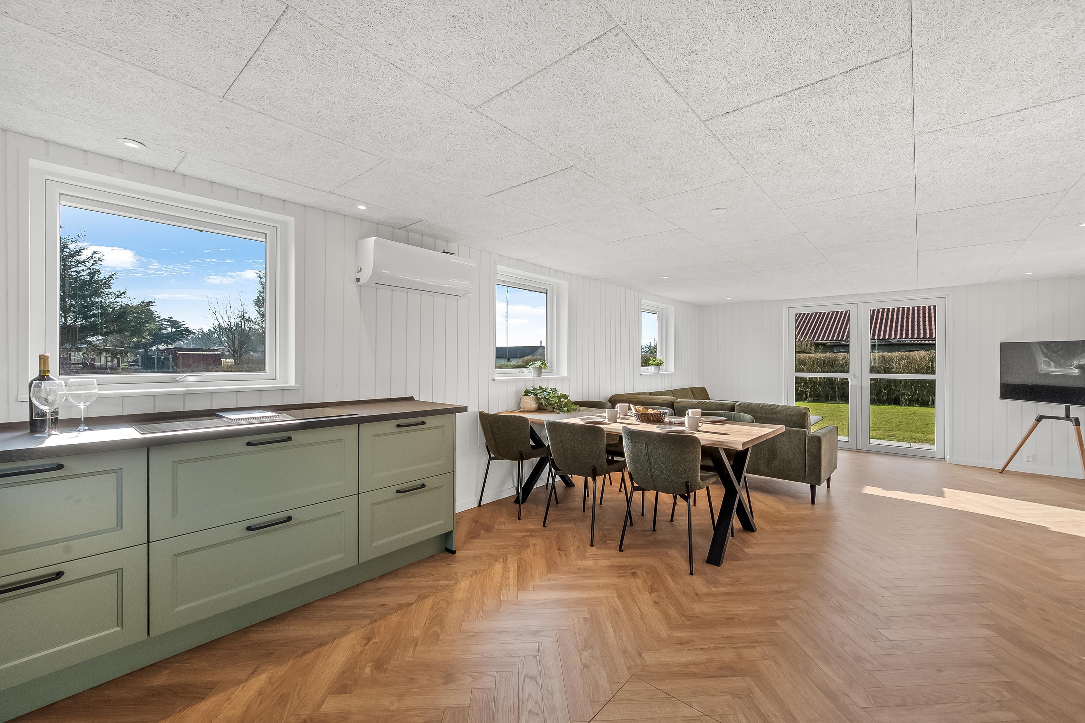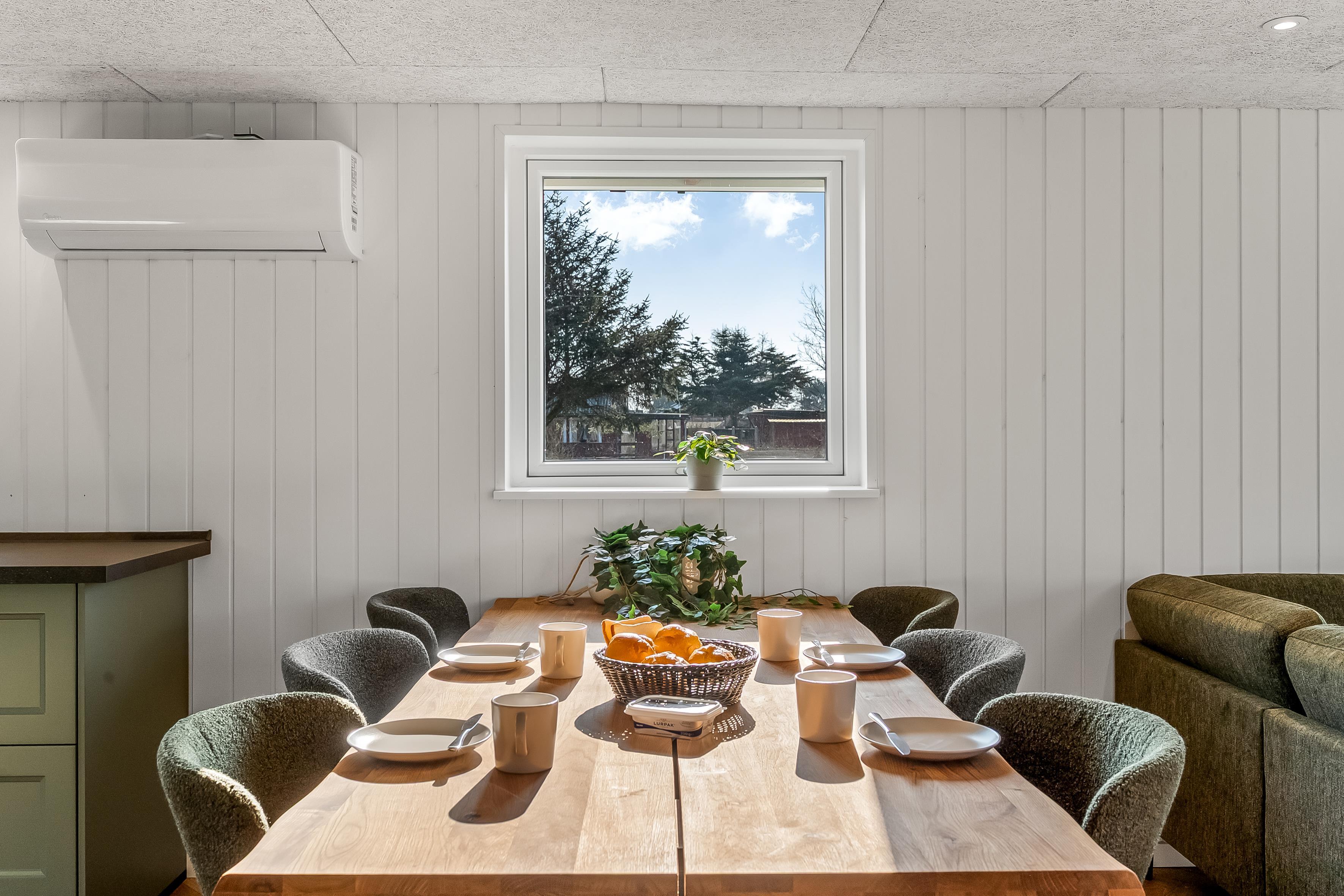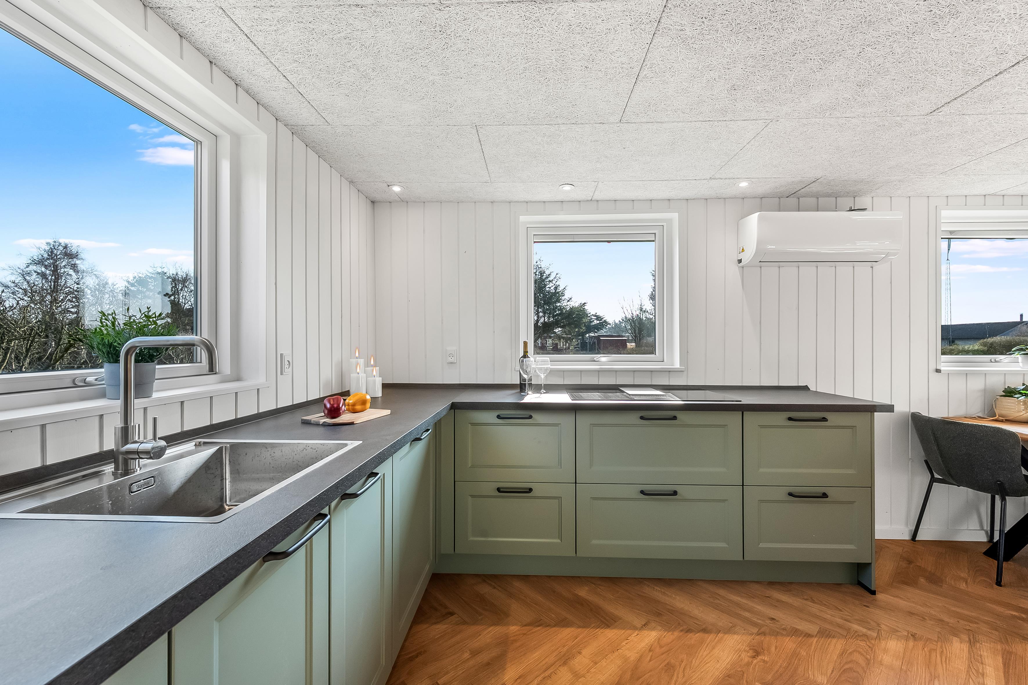 Huset er udstyret med moderne faciliteter, der gør dit ophold så behageligt som muligt. Du vil finde en energibesparende varmepumpe, som også kan fungere som air condition og gulvvarme på badeværelset, så du kan justere temperaturen efter dit behov. Køkkenet er udstyret med et induktionskomfur, ovn, mikrobølgeovn, opvaskemaskine, køleskab og fryser med 63 liter kapacitet, hvilket gør madlavning og opbevaring af mad en leg.