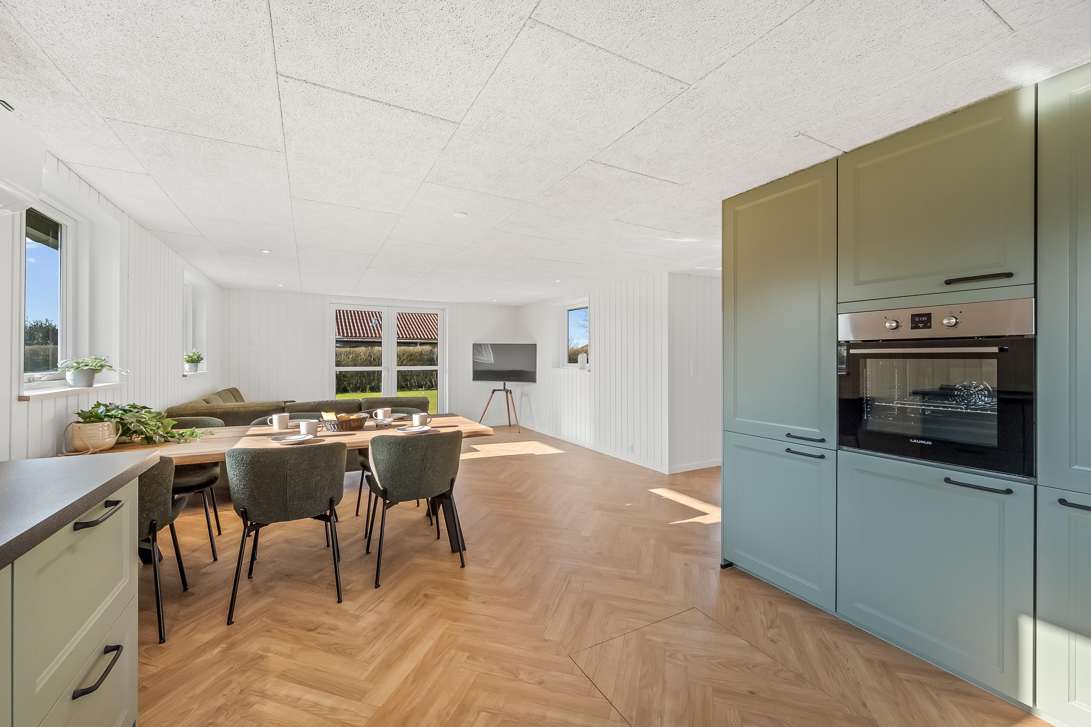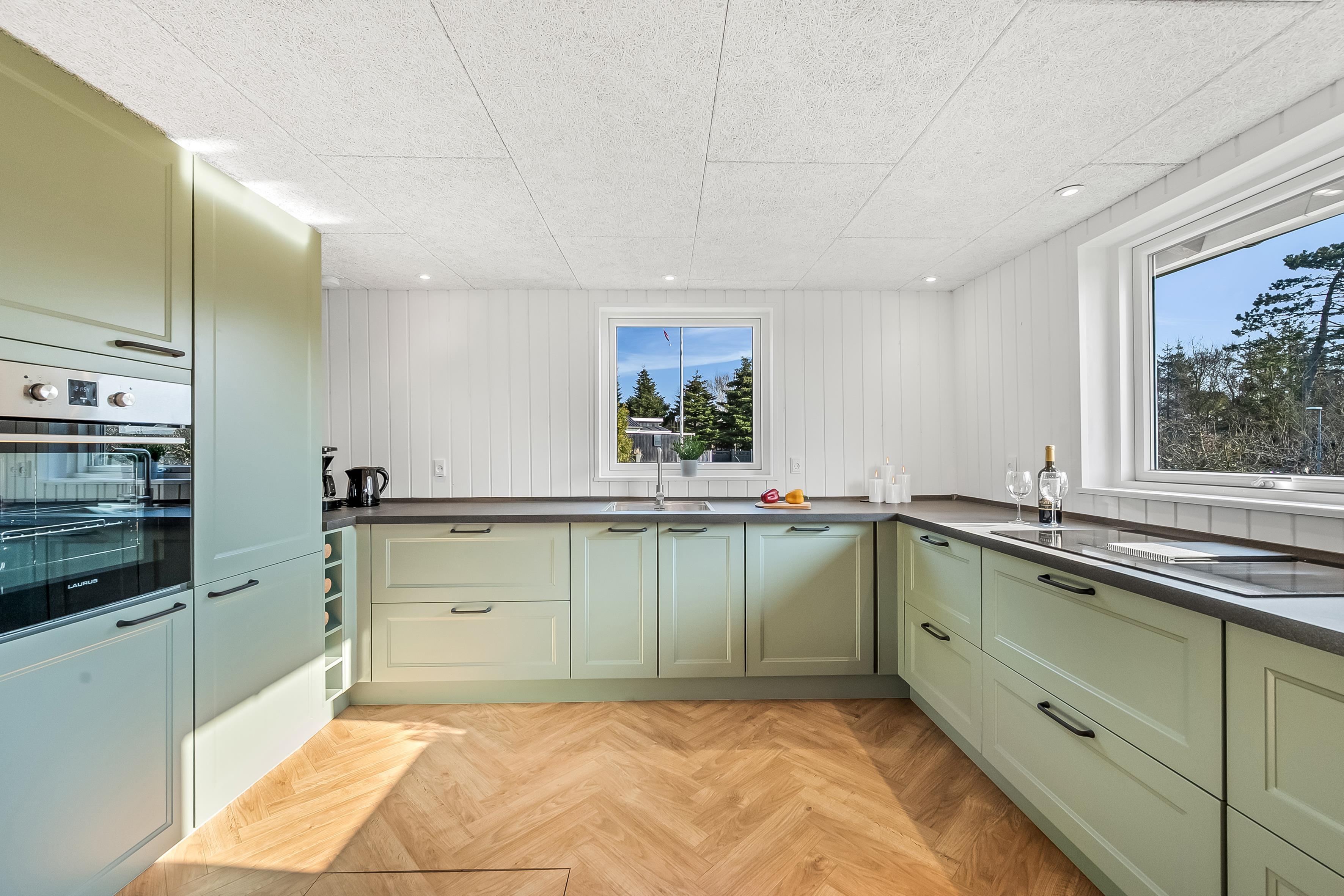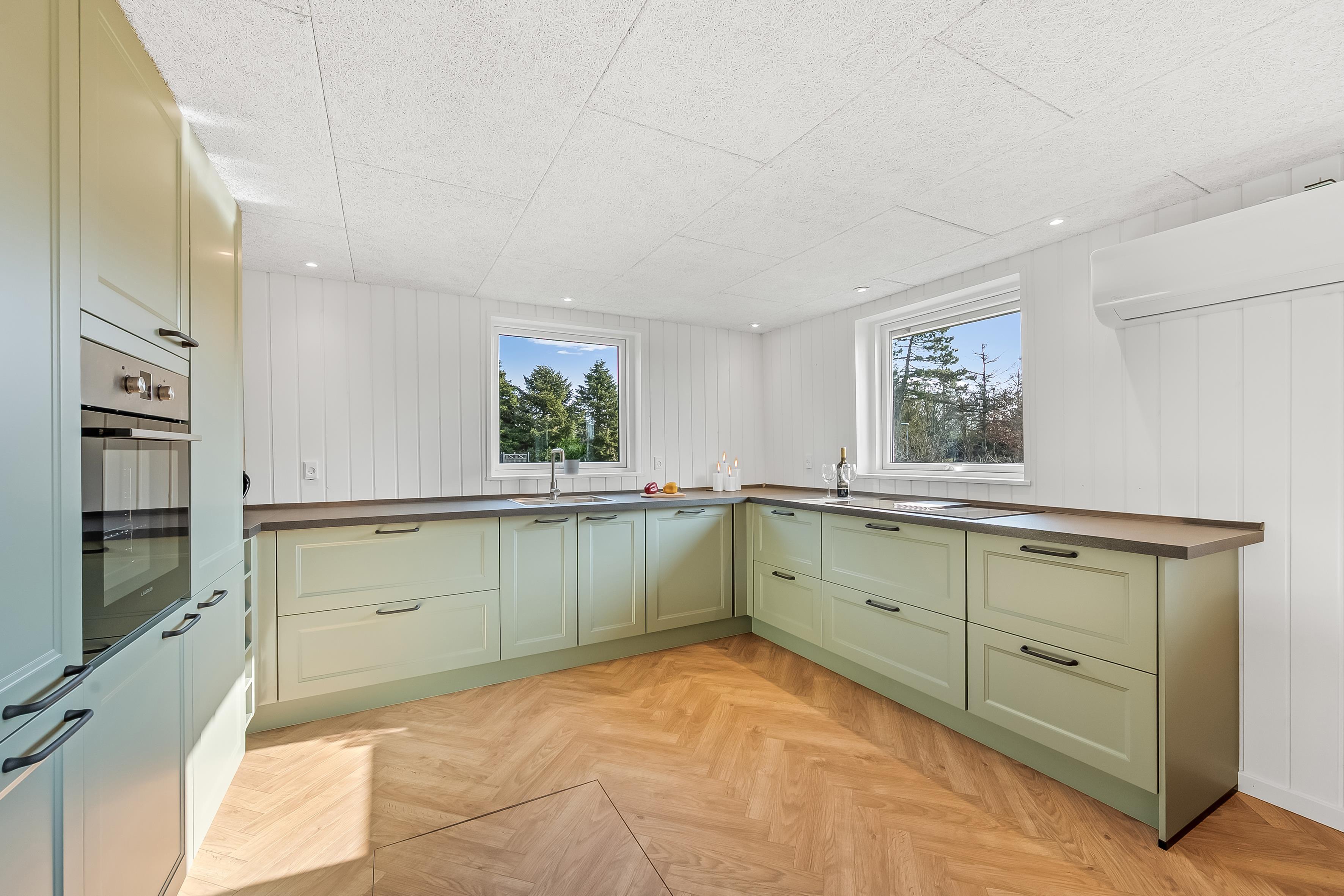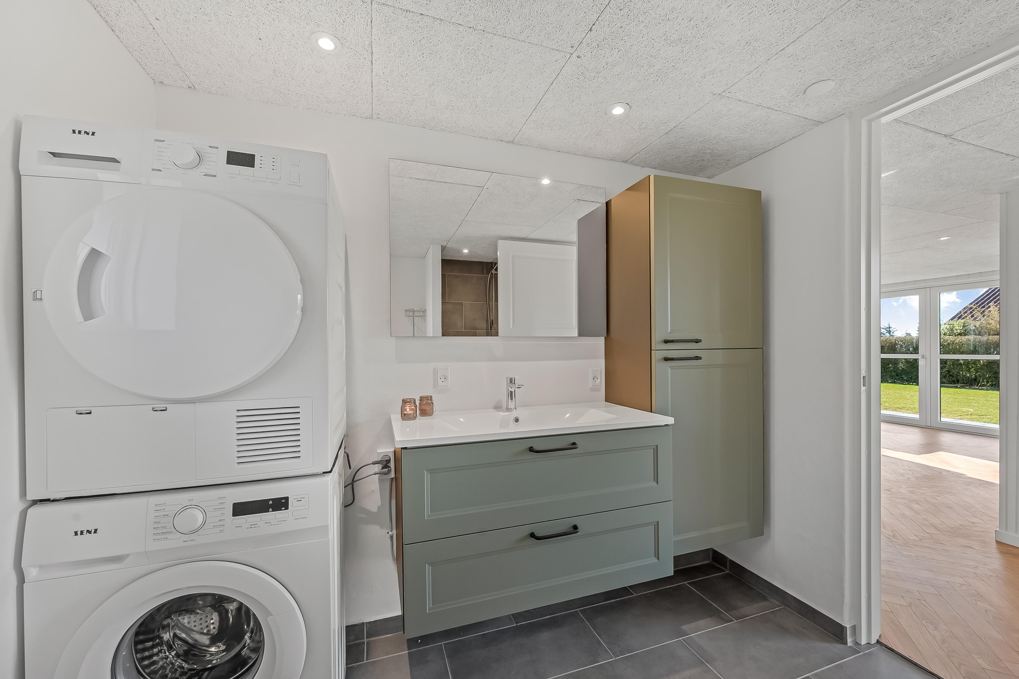 Huset er udstyret med moderne faciliteter, der gør dit ophold så behageligt som muligt. Du vil finde en energibesparende varmepumpe, som også kan fungere som air condition og gulvvarme på badeværelset, så du kan justere temperaturen efter dit behov. Køkkenet er udstyret med et induktionskomfur, ovn, mikrobølgeovn, opvaskemaskine, køleskab og fryser med 63 liter kapacitet, hvilket gør madlavning og opbevaring af mad en leg.