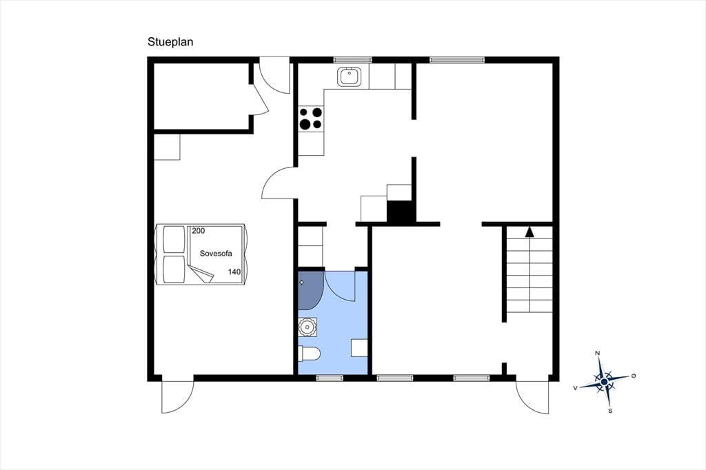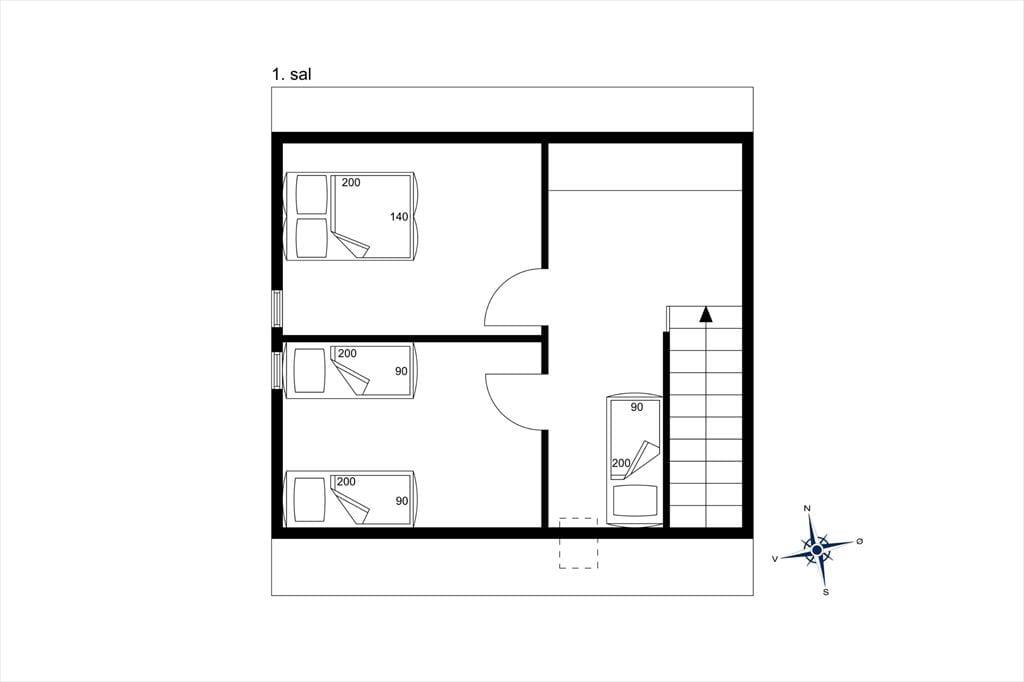 På 1. sal er der indrettet en repos med skabsvæg samt 2 soveværelser med henholdsvis 2 enkelt senge og 1 dobbeltseng.
