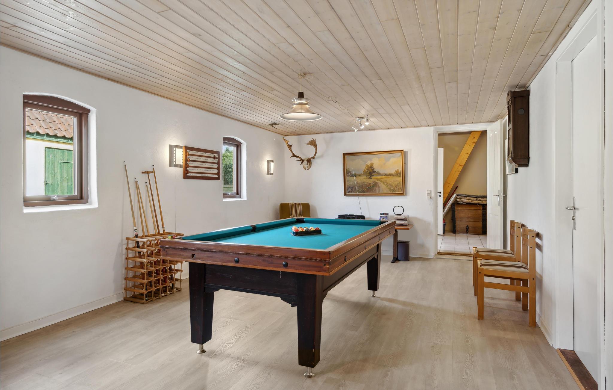 Velkommen til dette klassiske feriehus, som har en skøn udsigt over marker. Her kan hele familien komme ned i tempo og sætte hverdagen på pause. Hvis vejret ikke er med jer, kan I hygge jer indendørs og snuppe et slag bordtennisbord eller pool. I huset er der både god komfort og hyggelige indretningsløsninger i stil med husets historie. Børnene kan lege frit i den store have, mens I nyder freden og roen.