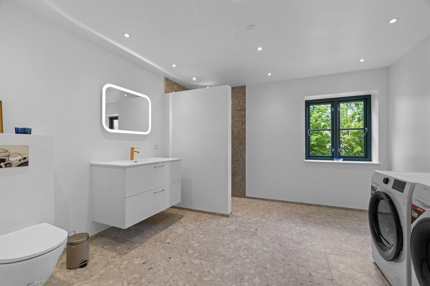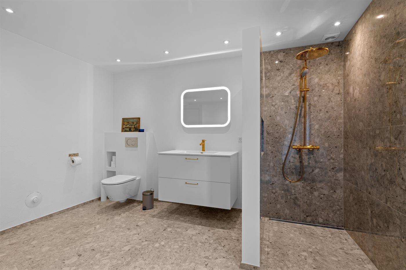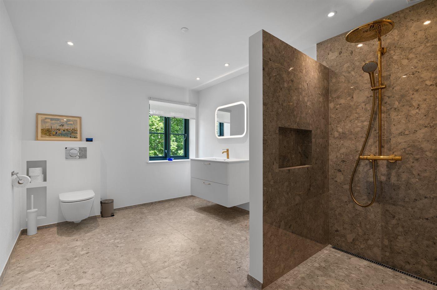 Der er 2 badeværelser med bruseniche og 2 toiletter. Der er gulvvarme på 2 badeværelser.