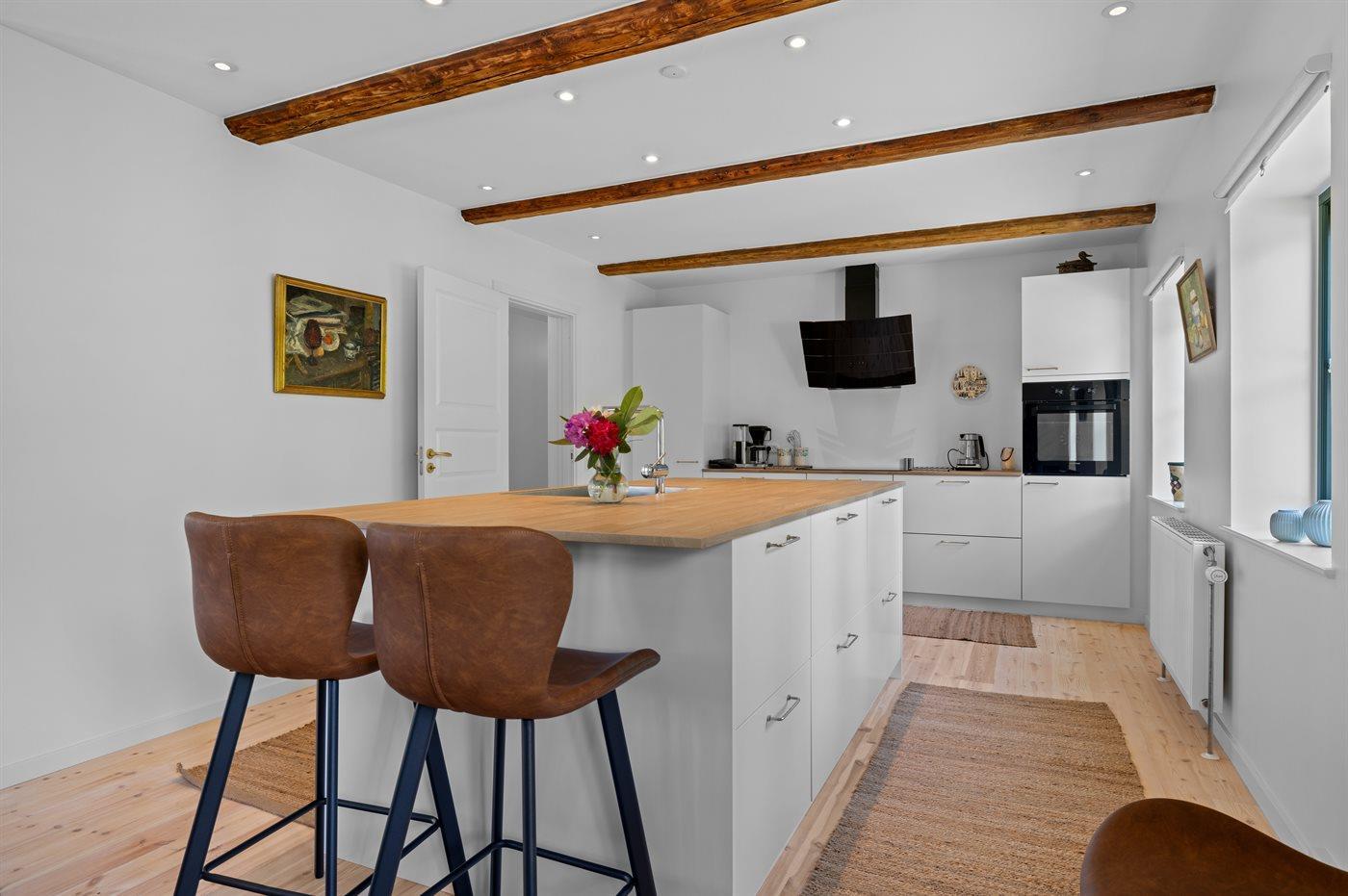 Køkkenet er udstyret med 1 køleskab. Der er 4 induktionskogeplader, varmluftovn, mikrobølgeovn samt opvaskemaskine.
