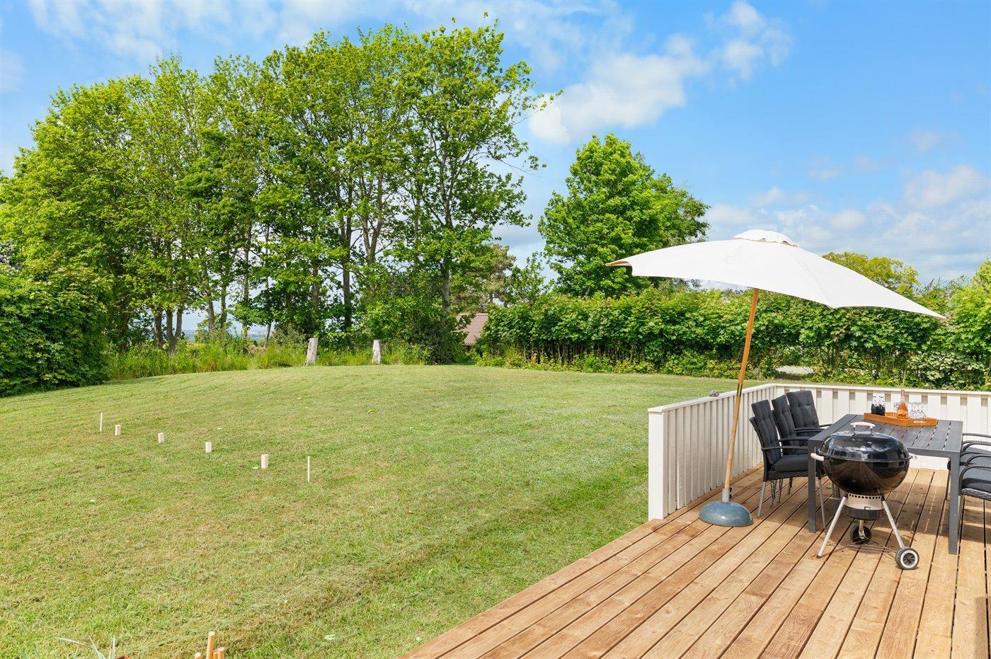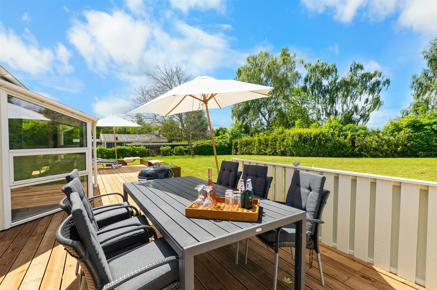 Der er terrasser på begge sider af huset. Den ene er østvendt, så her kan morgensolen nydes, og den anden, hvoraf en del er overdækket, vender mod sydvest, så her er der aftensol.
