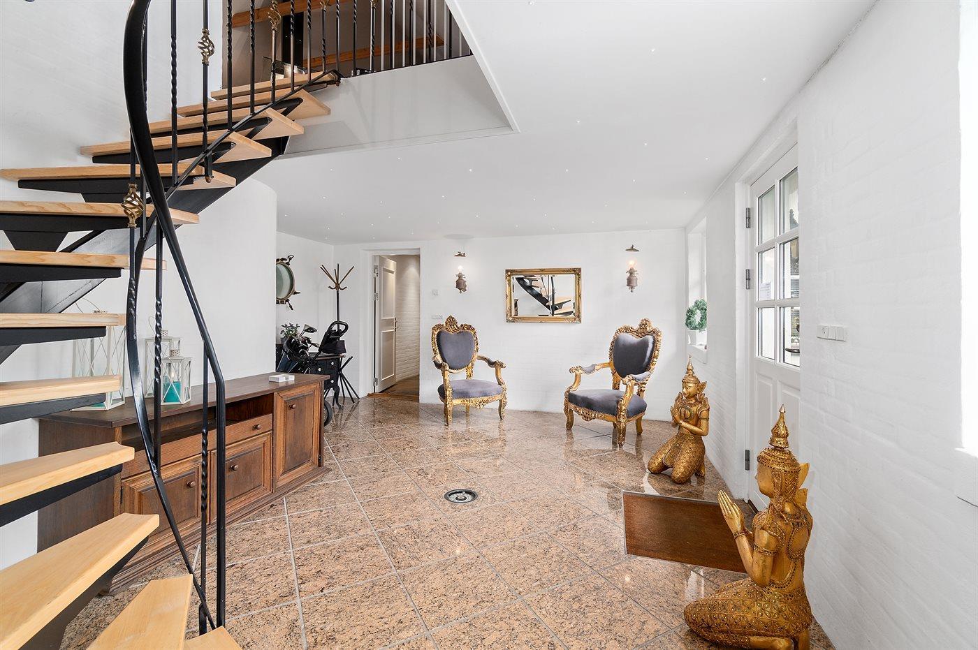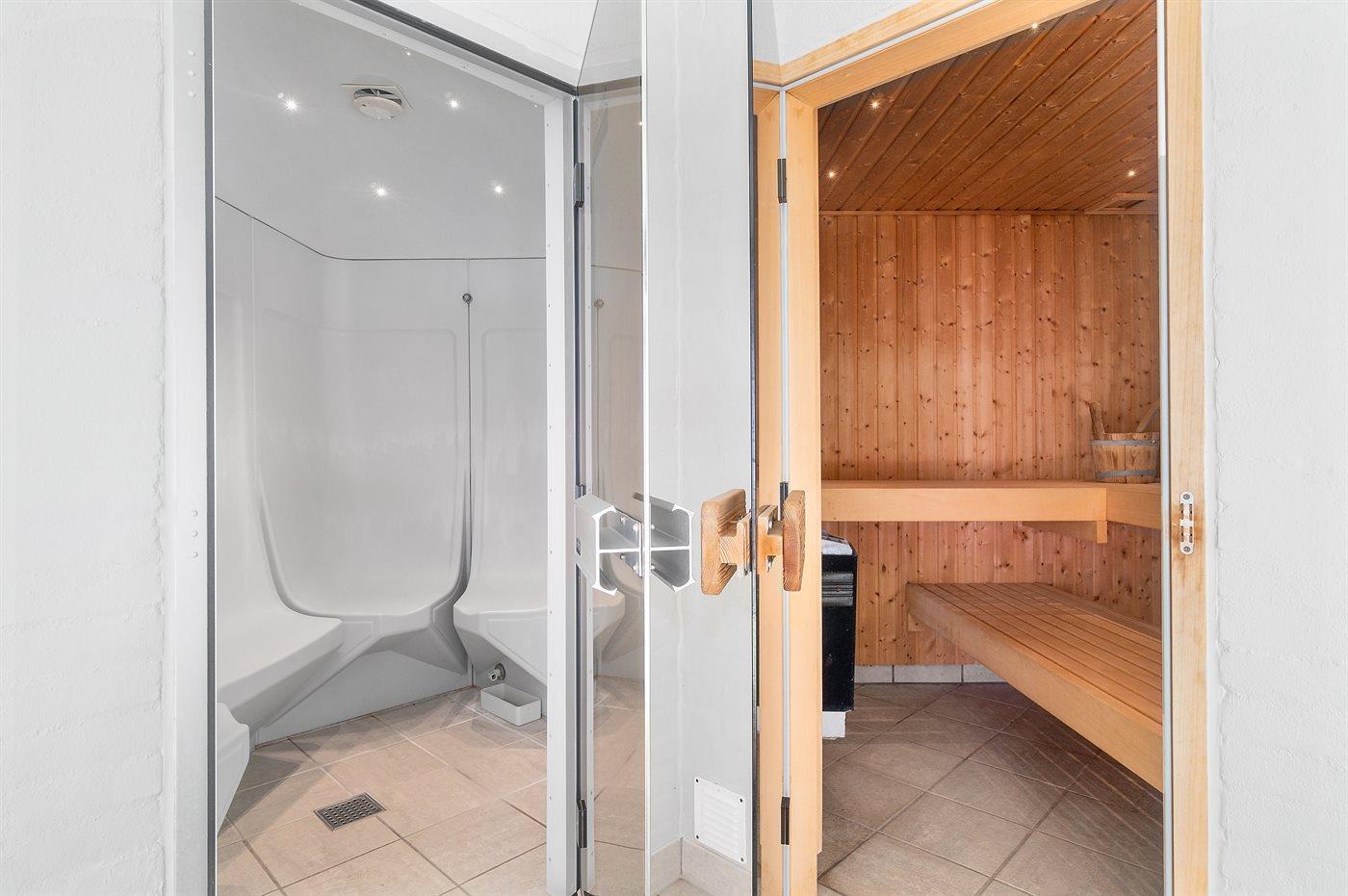 Der er 3 badeværelser med bruseniche og 3 toiletter. Der er gulvvarme på 3 badeværelser. I saunaen er der mulighed for afslapning.