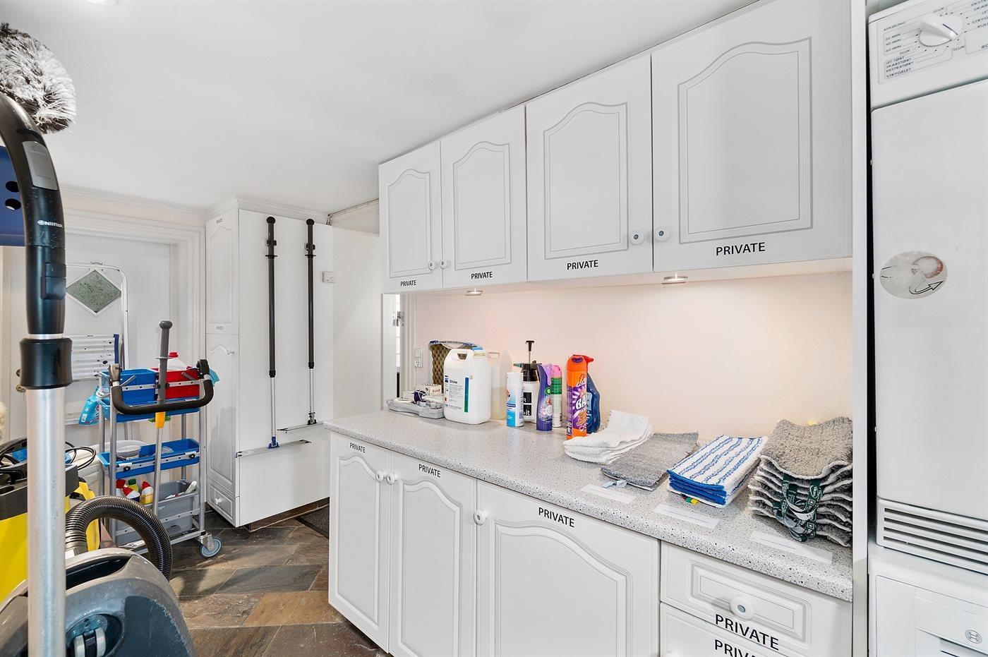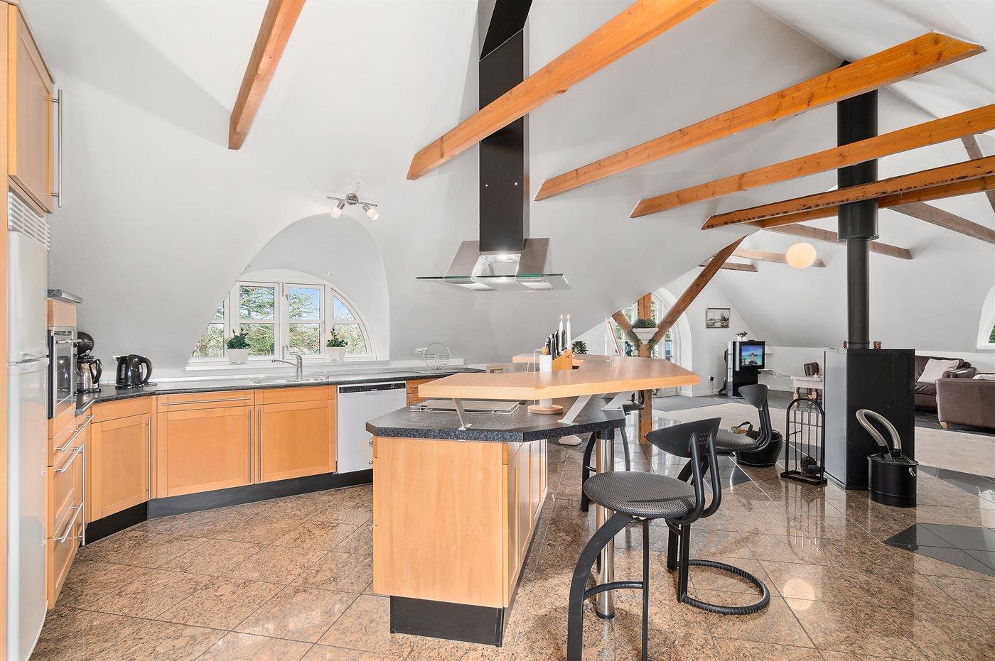 Køkkenet er udstyret med 1 køleskab. Der er 4 keramiske kogeplader, varmluftovn, mikrobølgeovn samt opvaskemaskine.