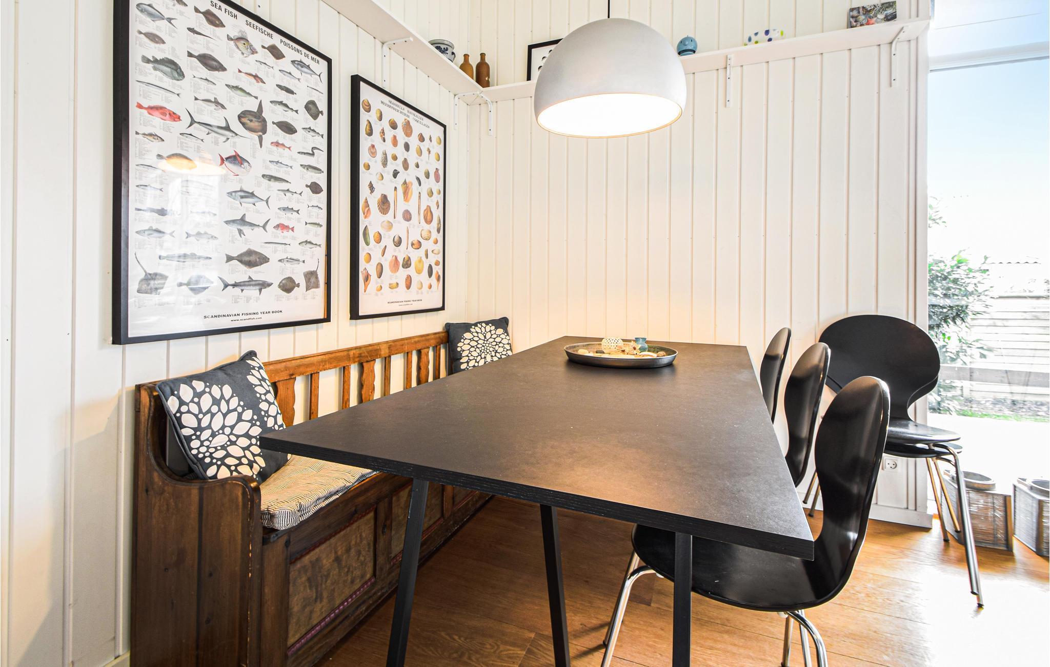 Huset er velindrettet og virkelig hyggeligt, indrettet med sans for detaljer. Konstruktionen med ensidig taghældning gør at der bliver et flot opholdsrum og det store vindues parti mod syd giver et fantastisk lys i rummet. Der er 3 gode soverum i huset.