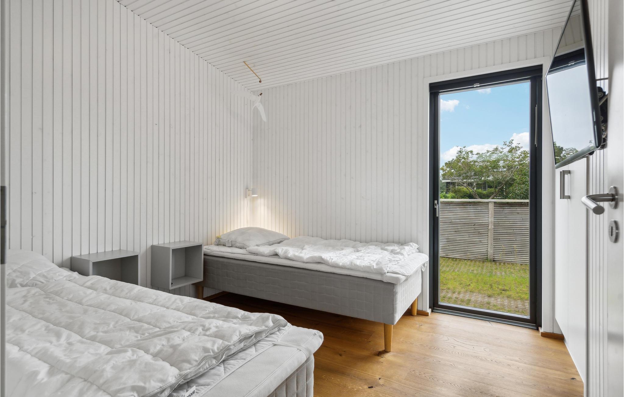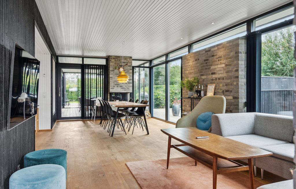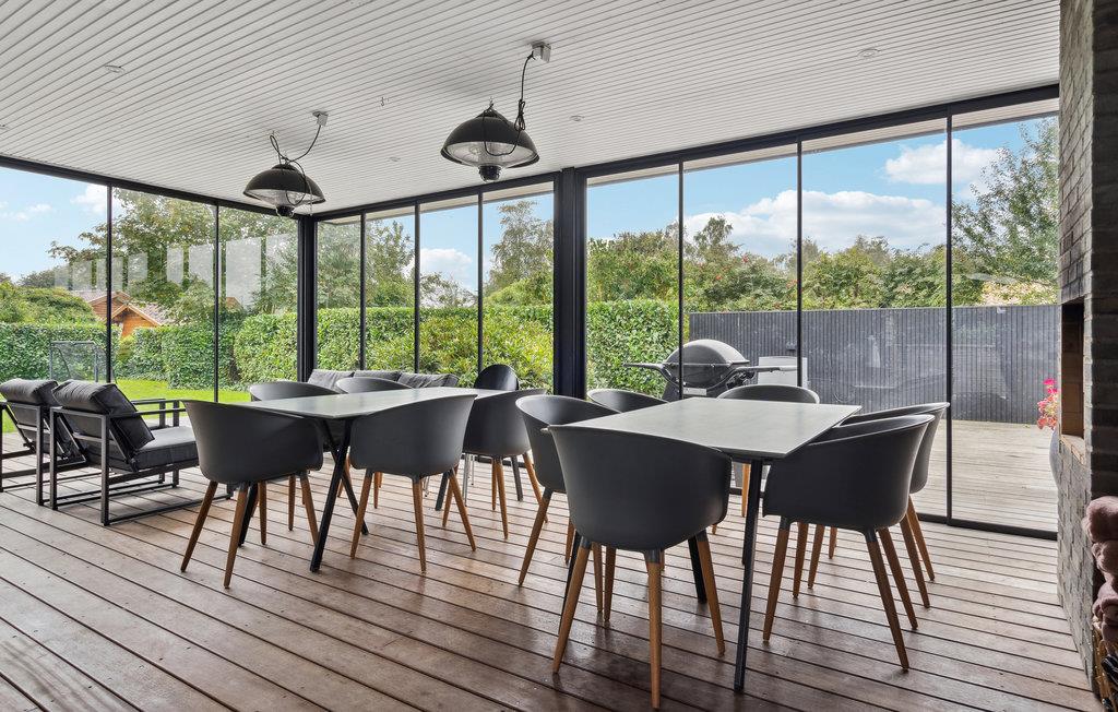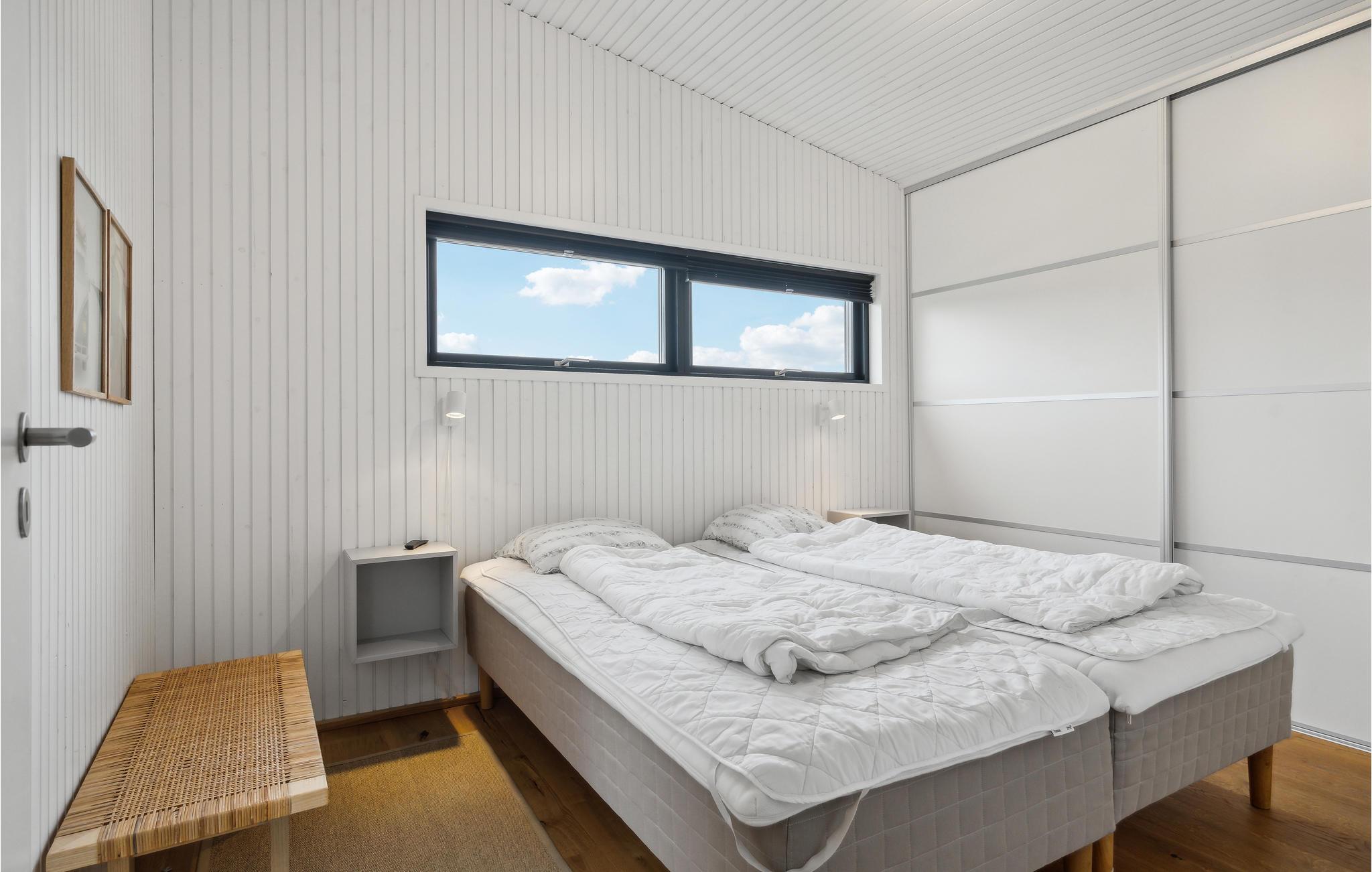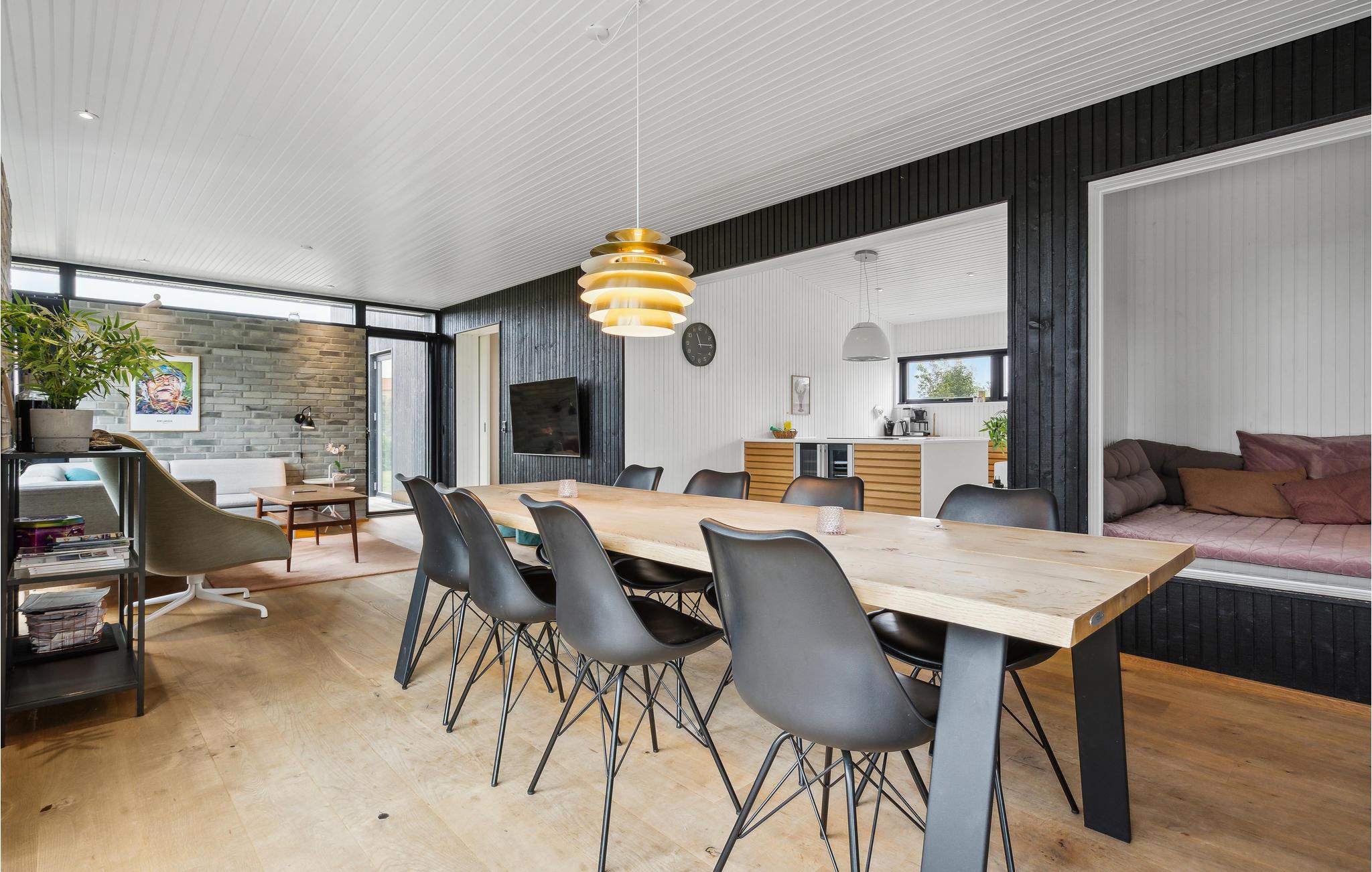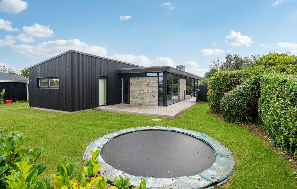 Der er lagt op til nogle forrygende feriedage i dette arkitekttegnede sommerhus, hvor ingen detaljer er tilfældige. Den rummelige lyse stue lægger op til en masse hyggestunder efter dagens udflugter, mens I kan få jer et sjovt afbræk ved billardbordet i spillerummet. Det veludstyrede køkken giver jer alt, hvad I skal bruge, når I skal gøre klar til de fælles måltoder. Og som en praktisk detaljer kan I tilberede friskfangede fisk fra den nærliggende fiskesø eller havet i husets udekøkken. Der er flere hyggelige soveværelser, herunder et børneværelse til fire med to køjesenge, så her er gode rammer til hele familien. Boligen består af to bygningsenheder, som er forbundet i form af en overdækket terrasse. Nyd solen og se børnene lege og hoppe på trampolin i haven.