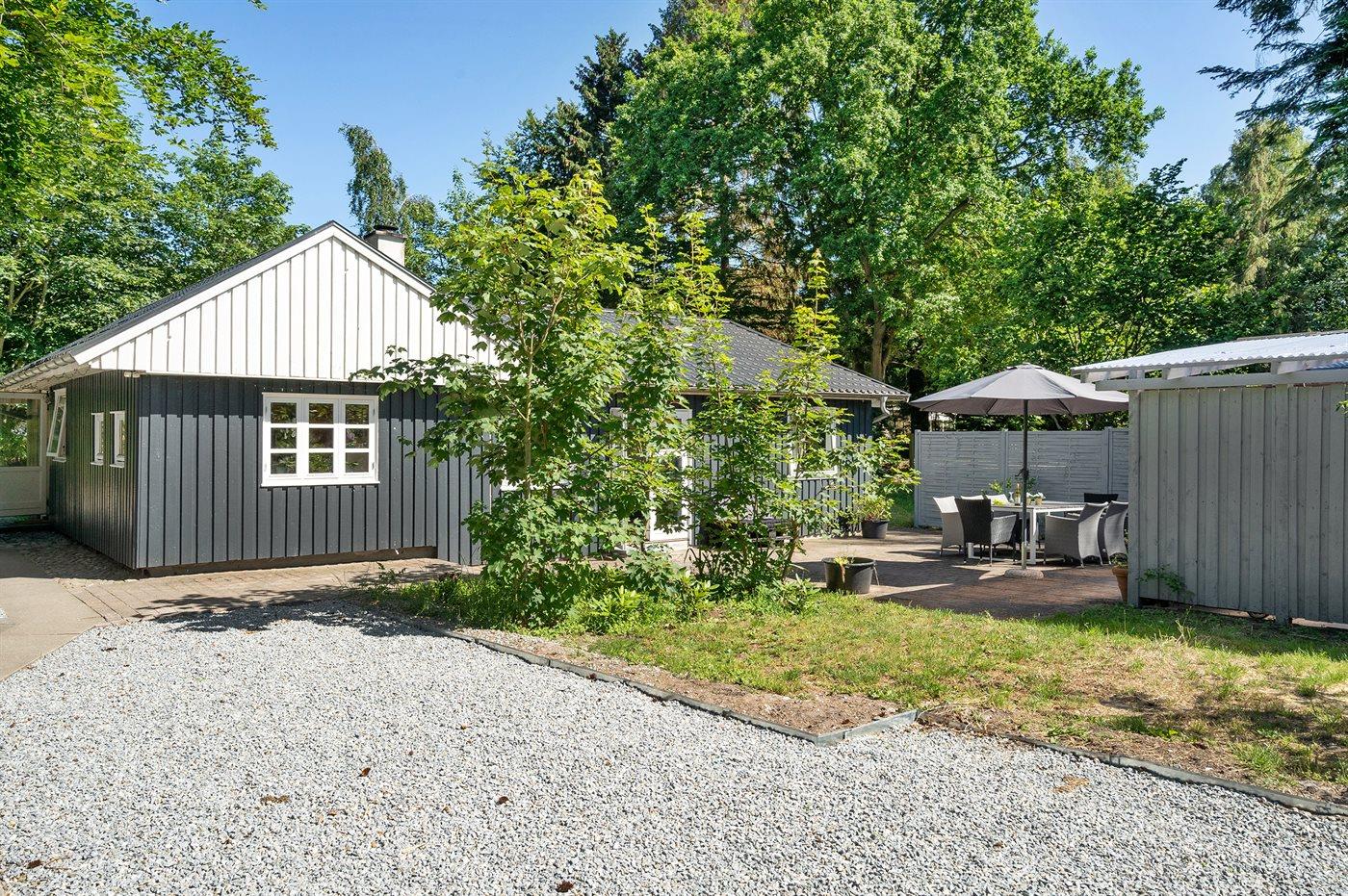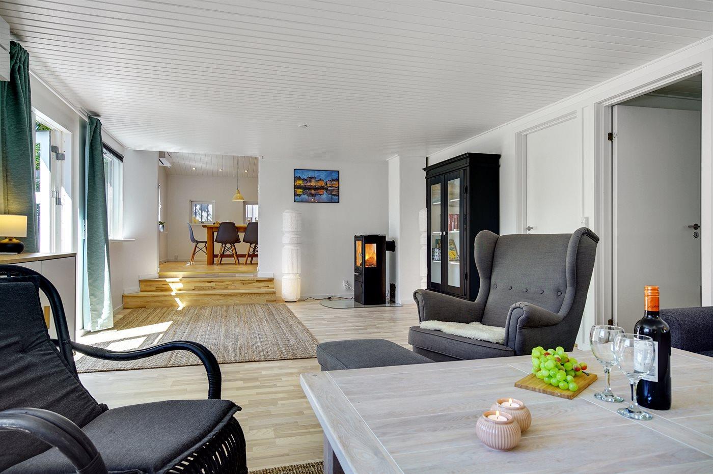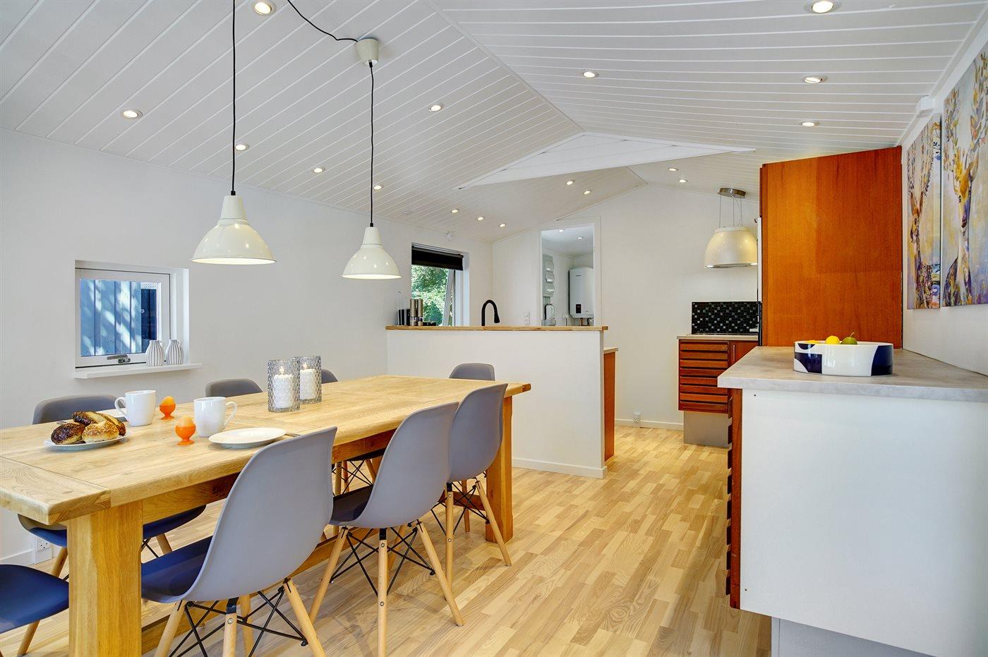 Flot og totalrenoveret sommerhus fra 1964 nær strand, skov og hav med moderne faciliteter og stor terrasse.