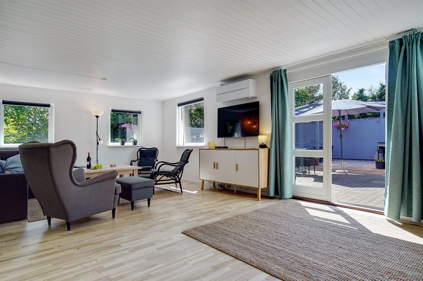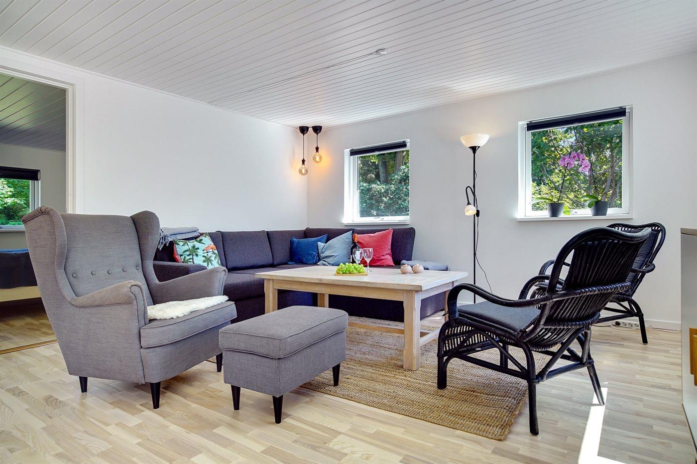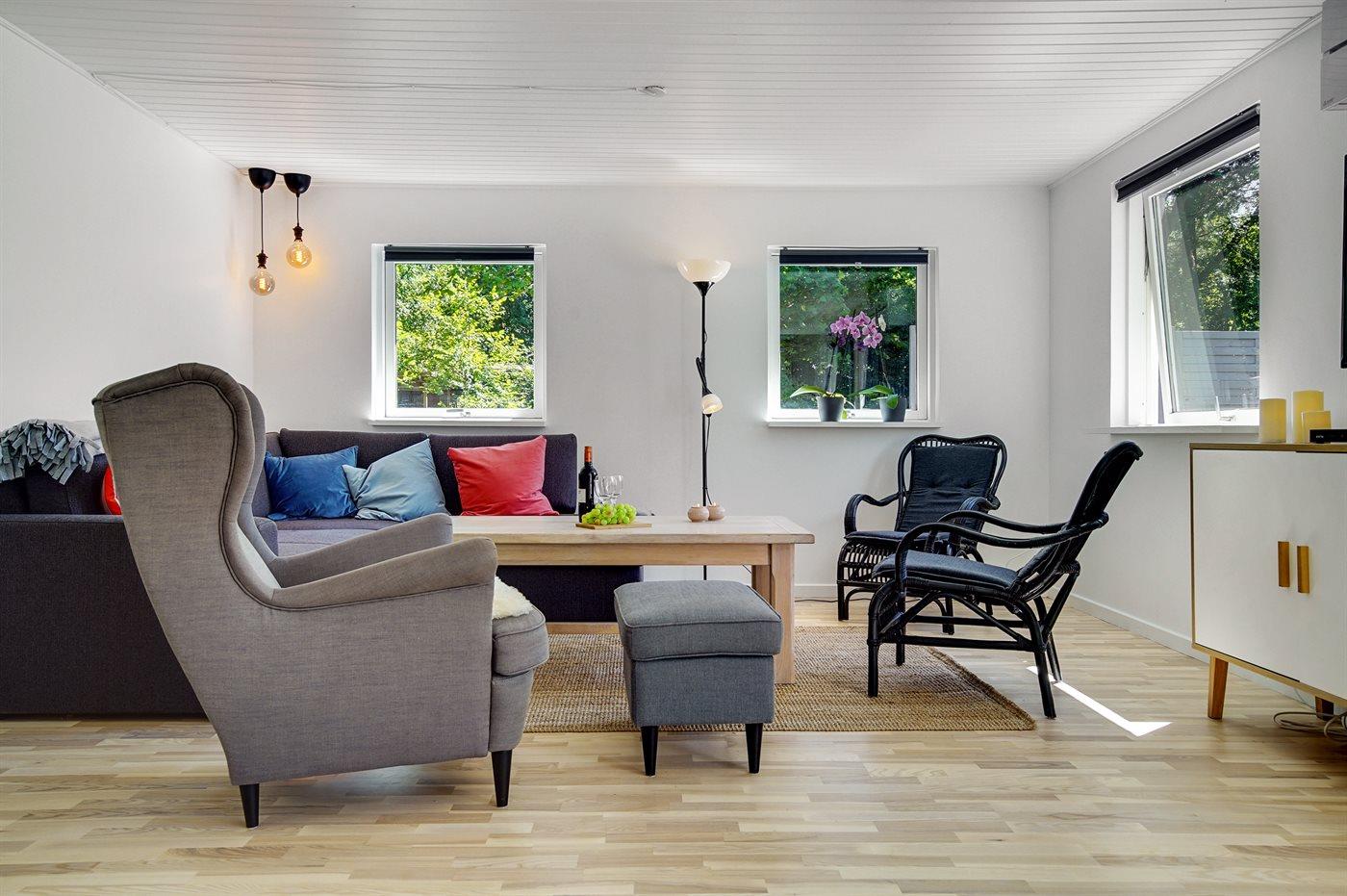 Flot og rummeligt sommerhus, netop totalrenoveret i 2020, beliggende i et roligt område nær såvel vandet, stranden og flere skove. Bemærk: 2 af sovepladserne befinder sig på dobbelt sovesofa i opholdsstuen.
