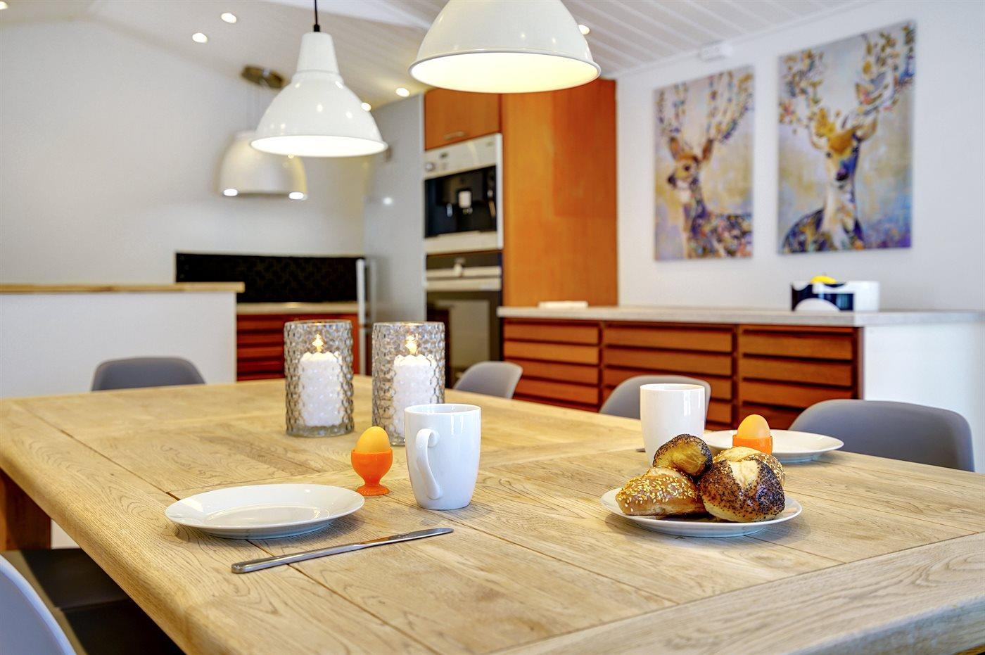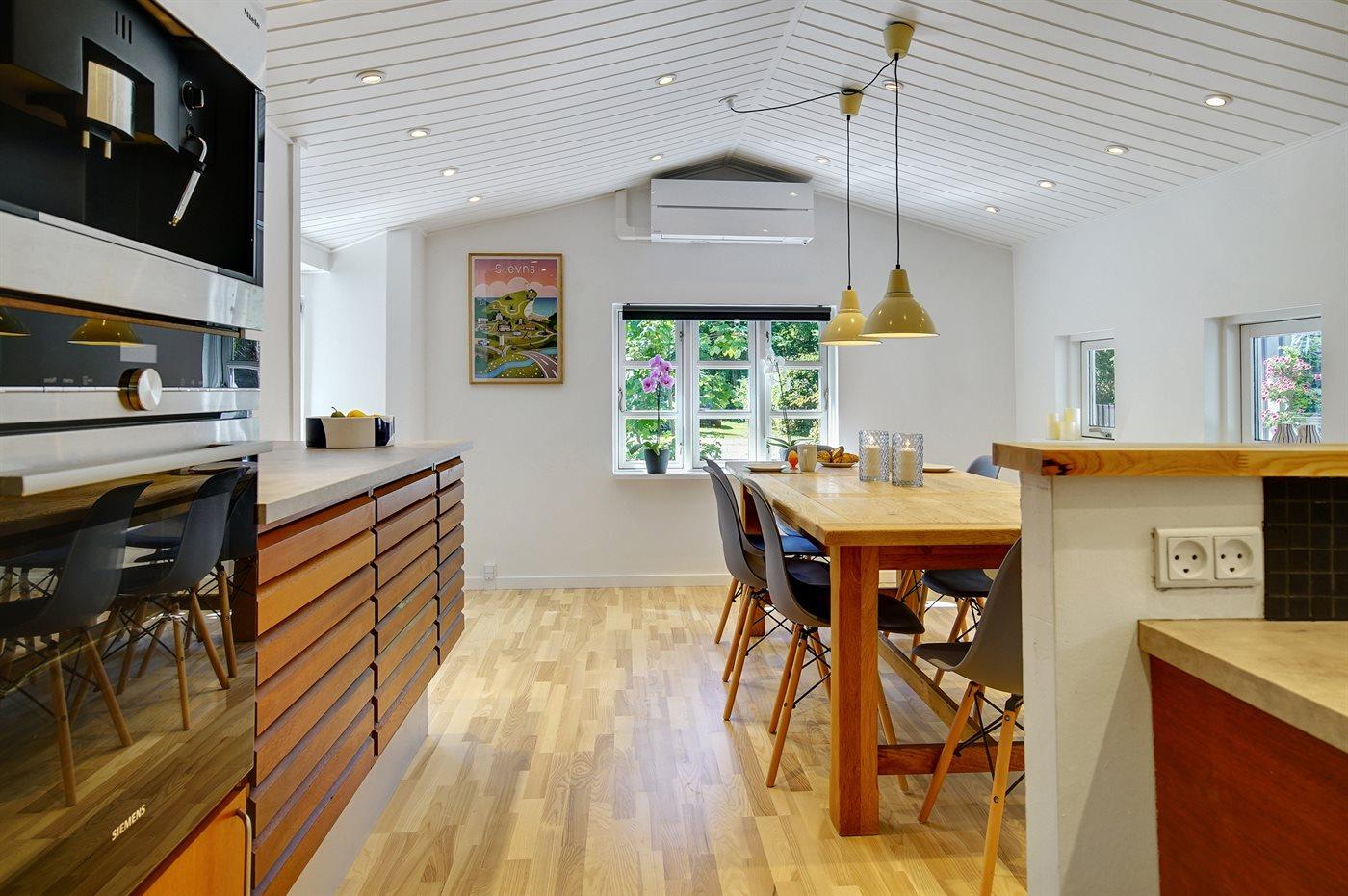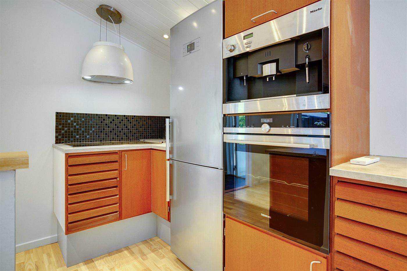 Køkkenet er udstyret med 1 køleskab. Der er 4 keramiske kogeplader, varmluftovn, mikrobølgeovn samt opvaskemaskine.