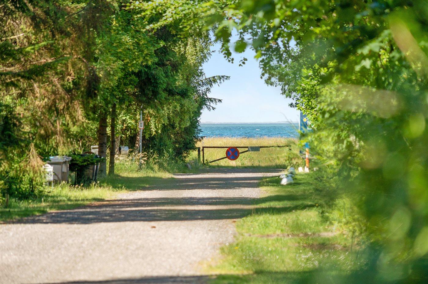 Ferieboligen er beliggende på en 1194 m² stor naturgrund. Der er 300 m til havet. Nærmeste forretning er beliggende i en afstand af 5000 m. Til ferieboligen hører 80 m² terrasseareal. Desuden er der 40 m² overdækket terrasse. Der er redskabsrum. Gynge. Shelter. Der er installeret stik til opladning af elbil. Type 2 stik. Parkering ved ferieboligen.