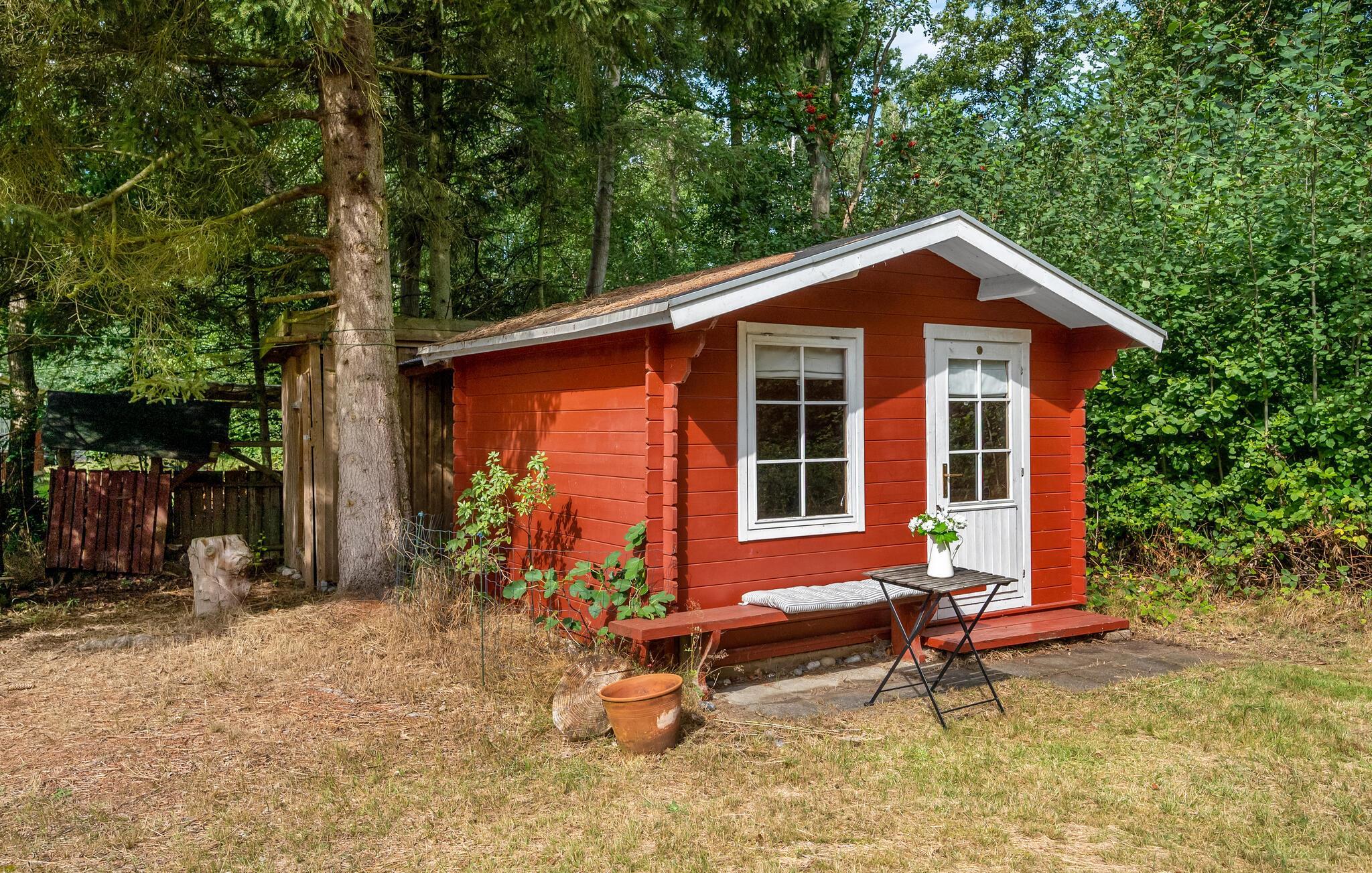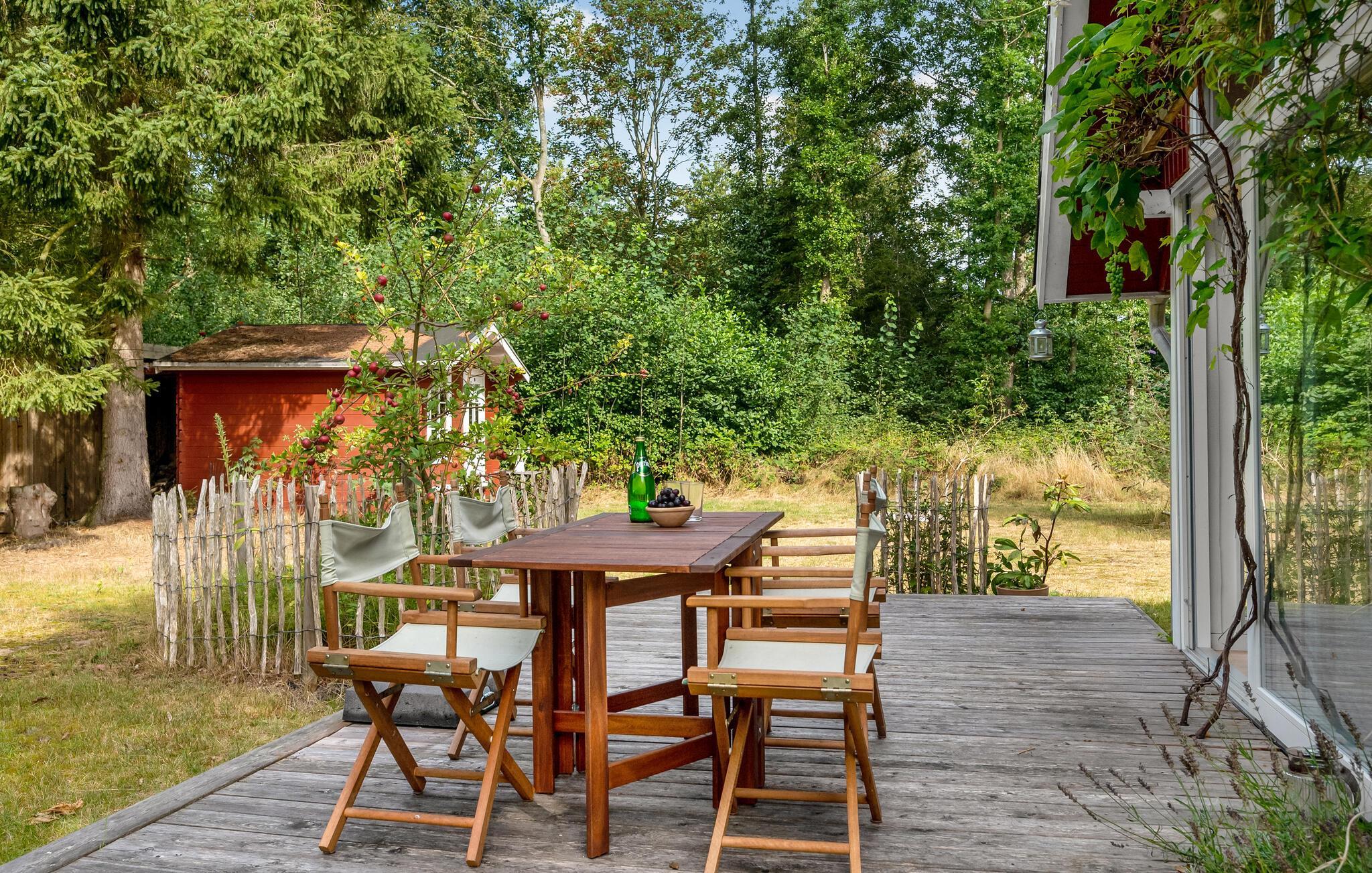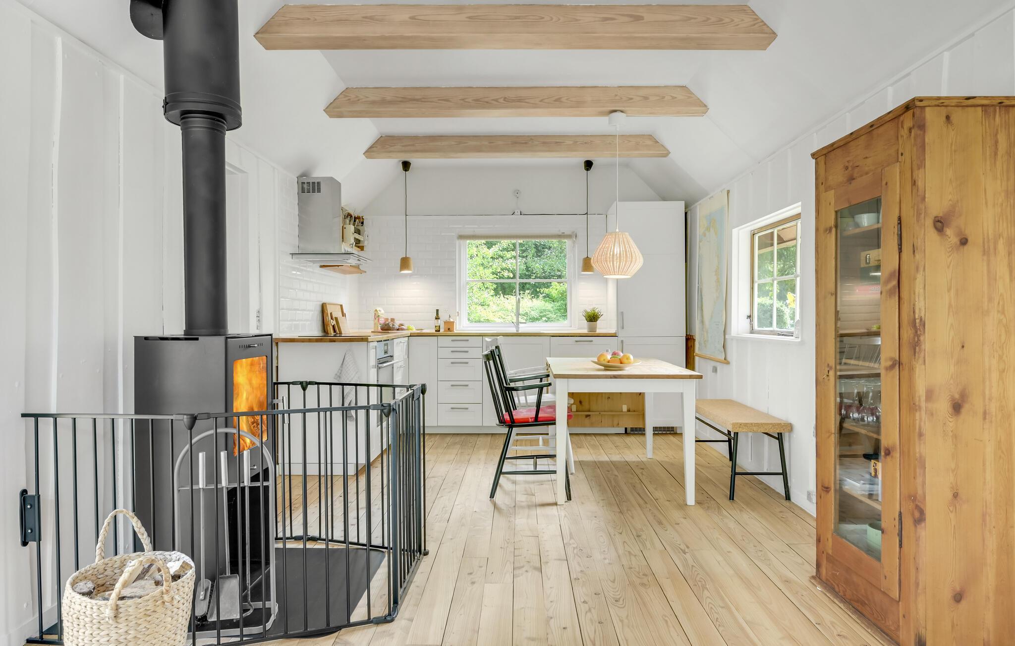 Træd ind i dette smukke feriehus og mærk roen sænke sig med det samme. Den lyse stue med brændeovn er husets hjerte, hvor I virkelig kan slappe af. I forlængelse ligger køkkenet, hvor I kan lave mad, spise og hygge jer. Ud over soveværelset i huset er der endnu et soveværelse i annekset i haven. Haven er en stor oase af velvære. Nyd jeres lækre feriemåltider på terrassen, mens I beundrer den omkringliggende natur, træerne, buskene og blomsterne.
