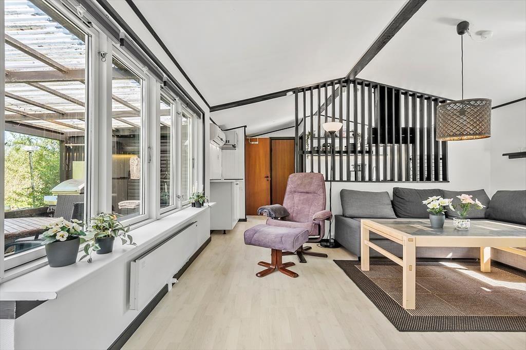 Huset indeholder stue med brændeovn og udgang til dejlig overdækket terrasse.