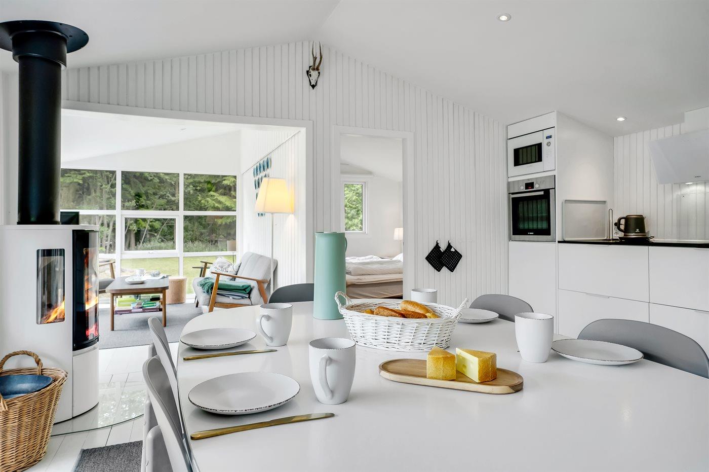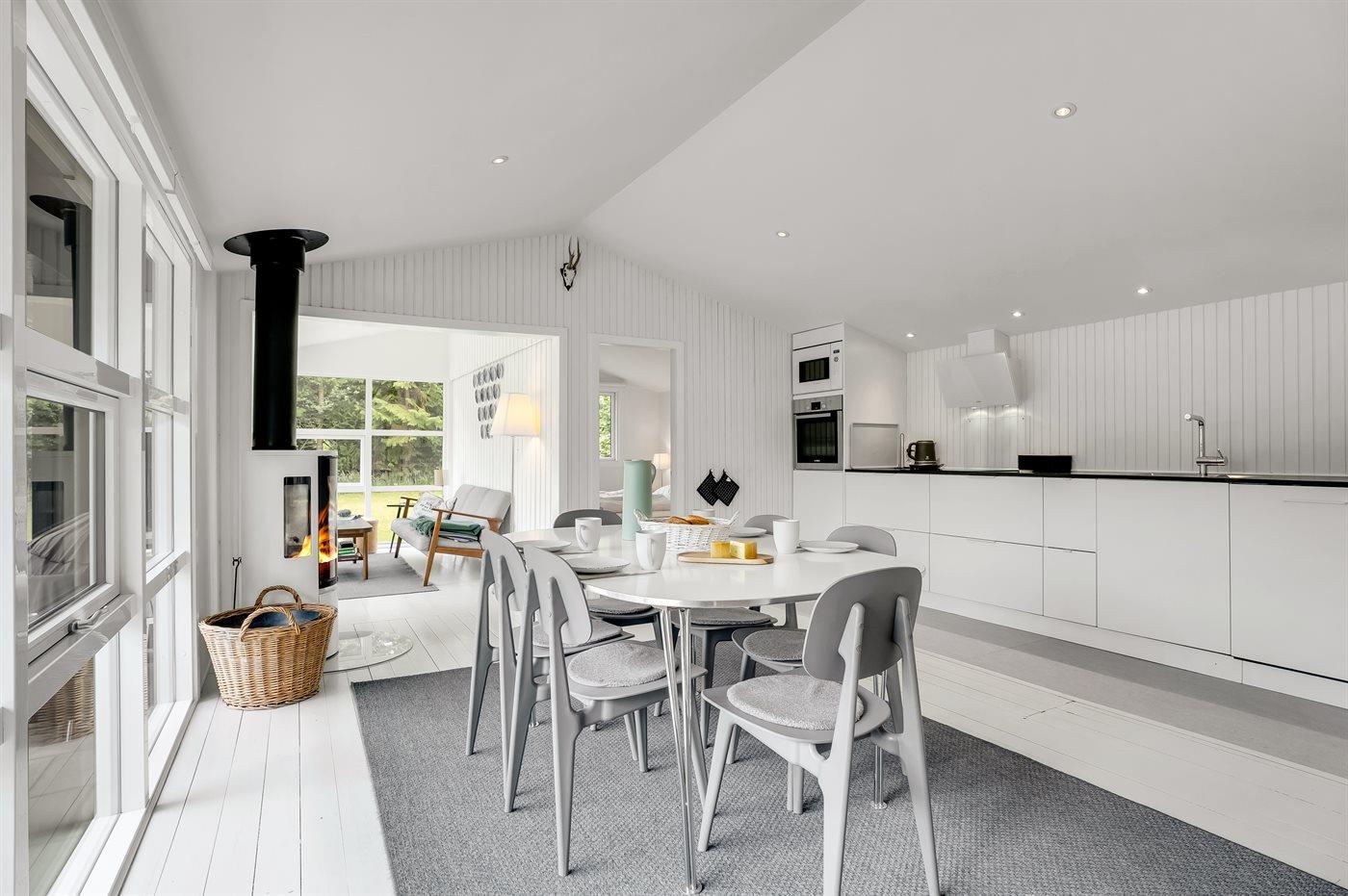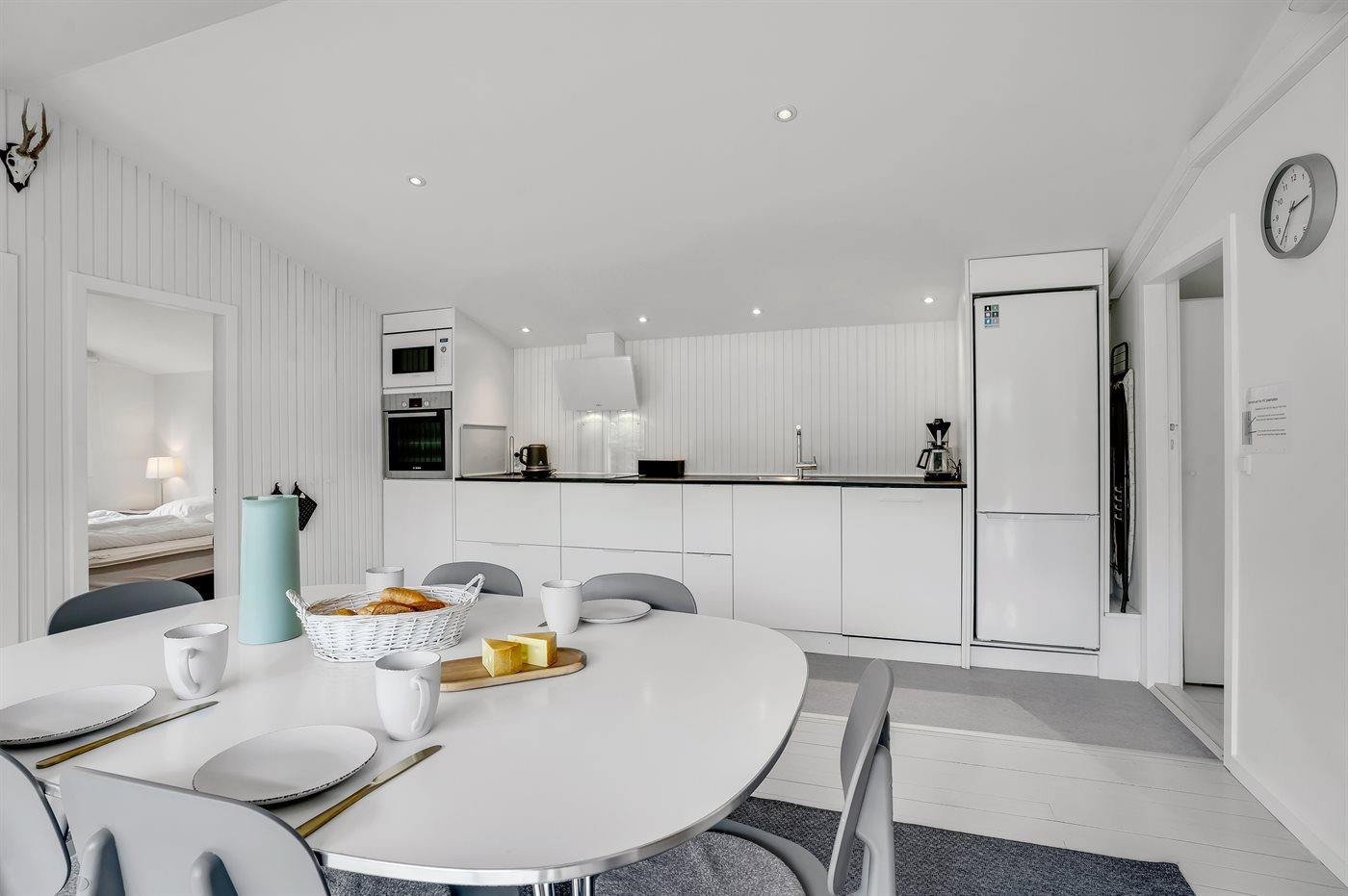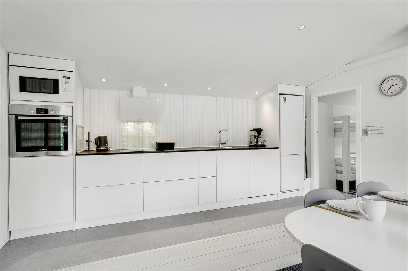 Køkkenet er udstyret med 1 køleskab. Der er 4 keramiske kogeplader, varmluftovn, mikrobølgeovn samt opvaskemaskine.