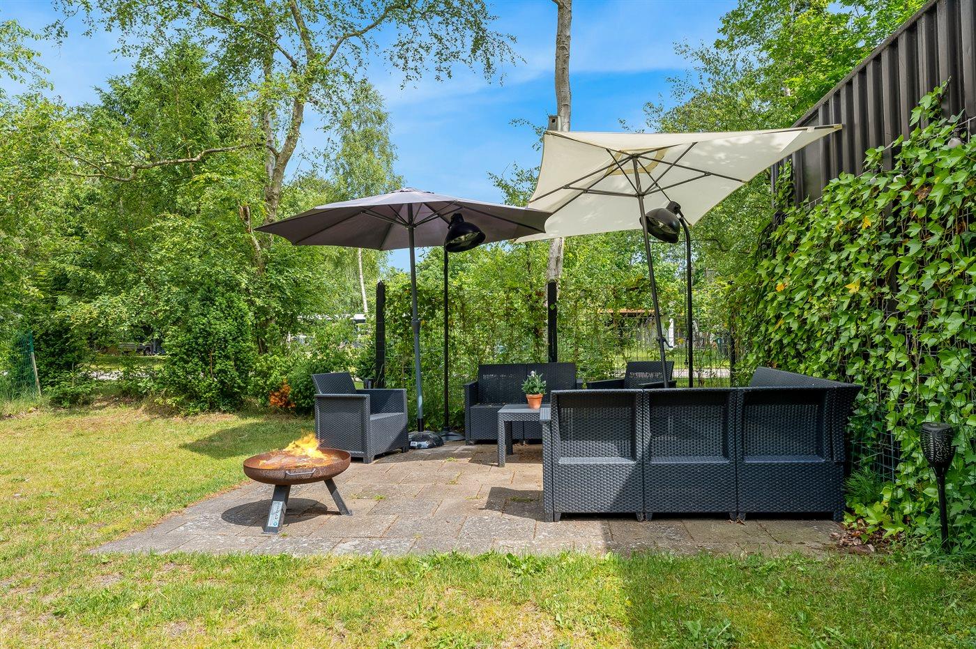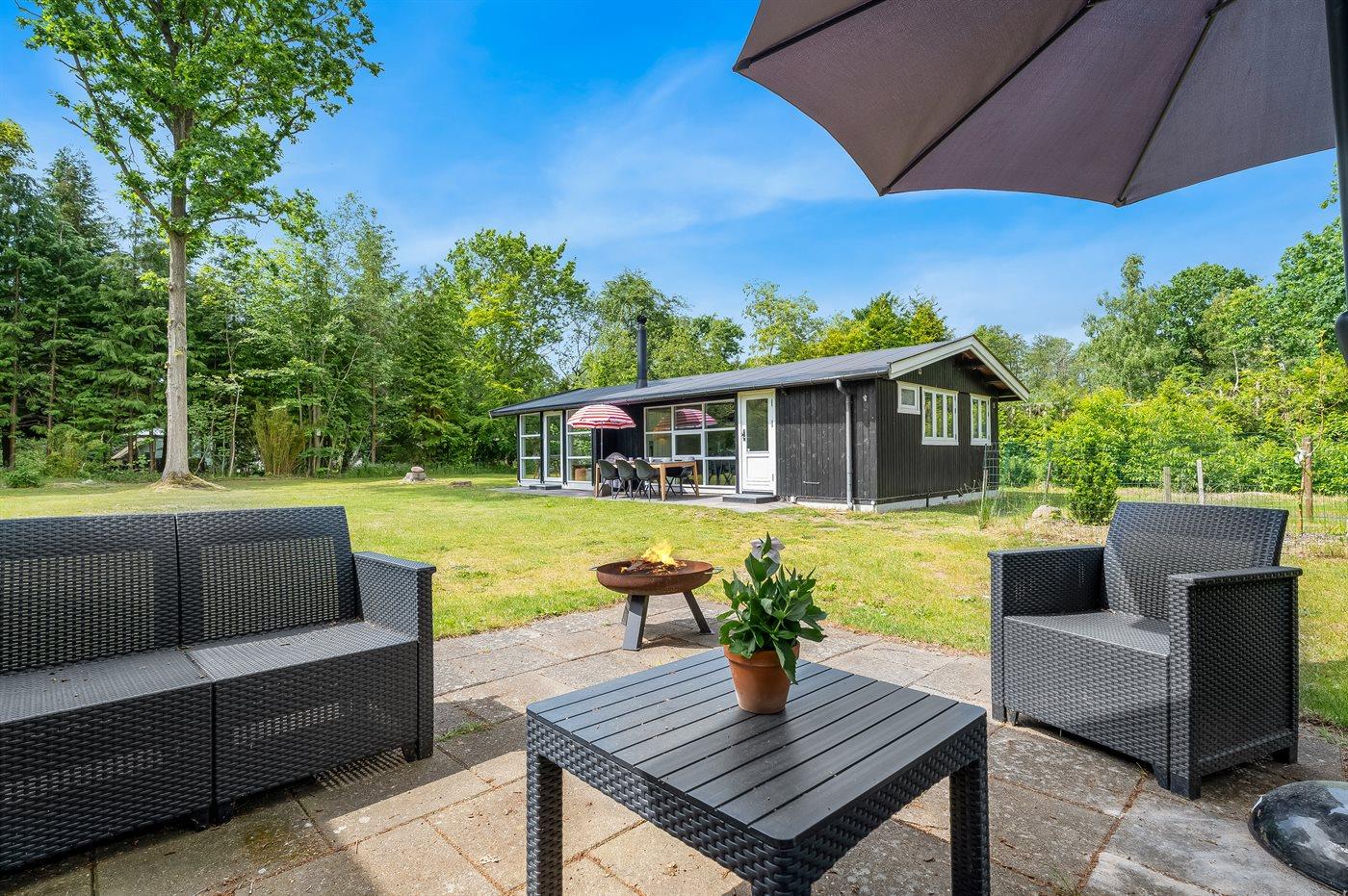 Der er en stor grund ved huset med fodboldmål og plads til boldspil mm. Der er en fin terrasse, der også har et overdækket område. Grill og bålsted i haven. Desuden er det en udendørs bruser for de friske.