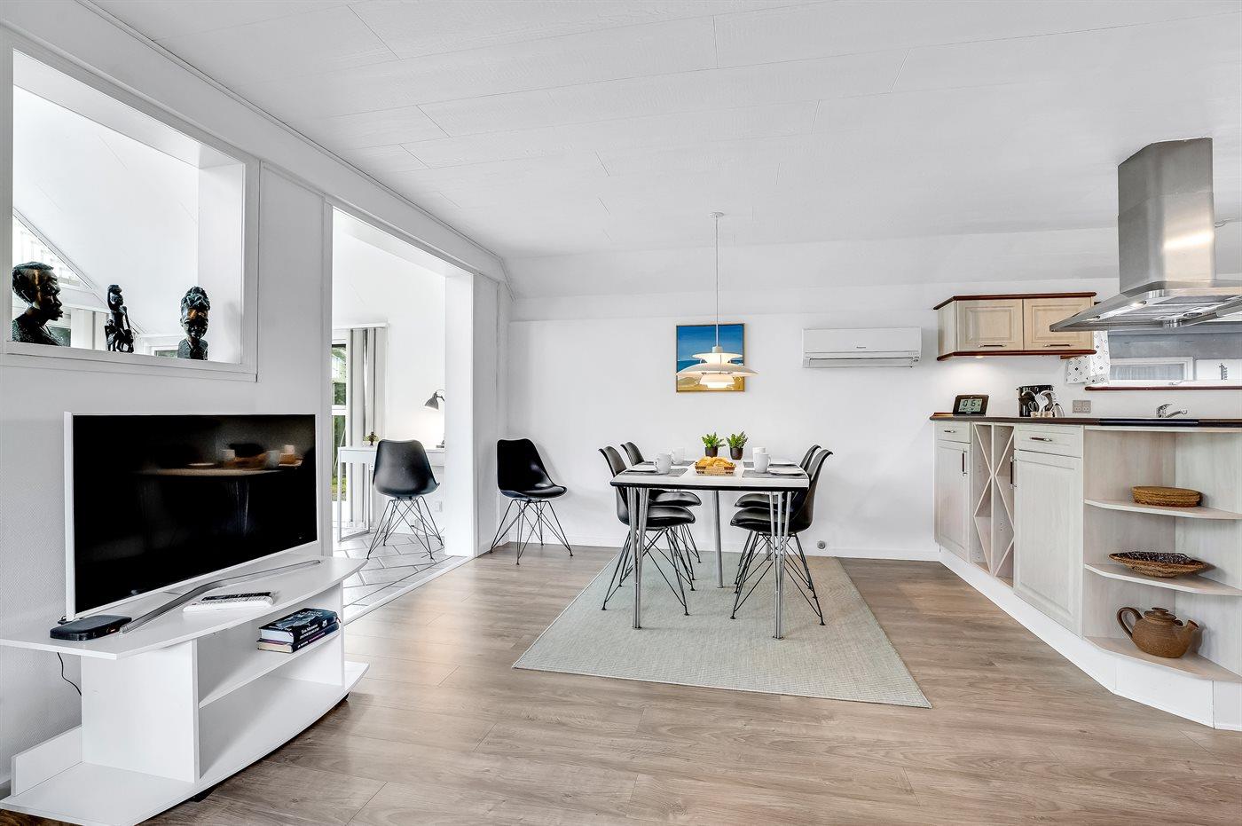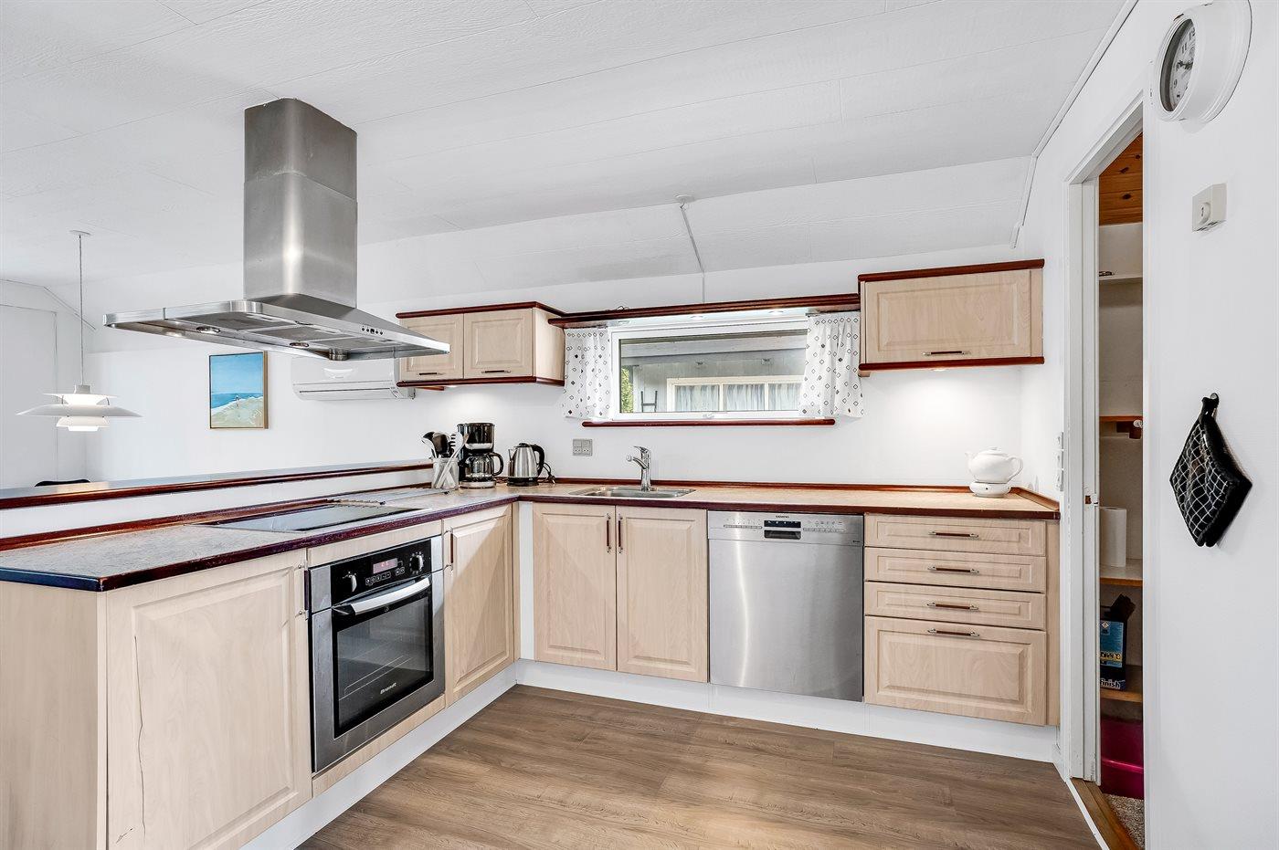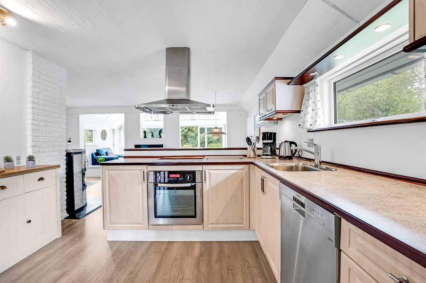 Køkkenet er udstyret med 1 køleskab. Der er 4 keramiske kogeplader, varmluftovn, mikrobølgeovn samt opvaskemaskine.