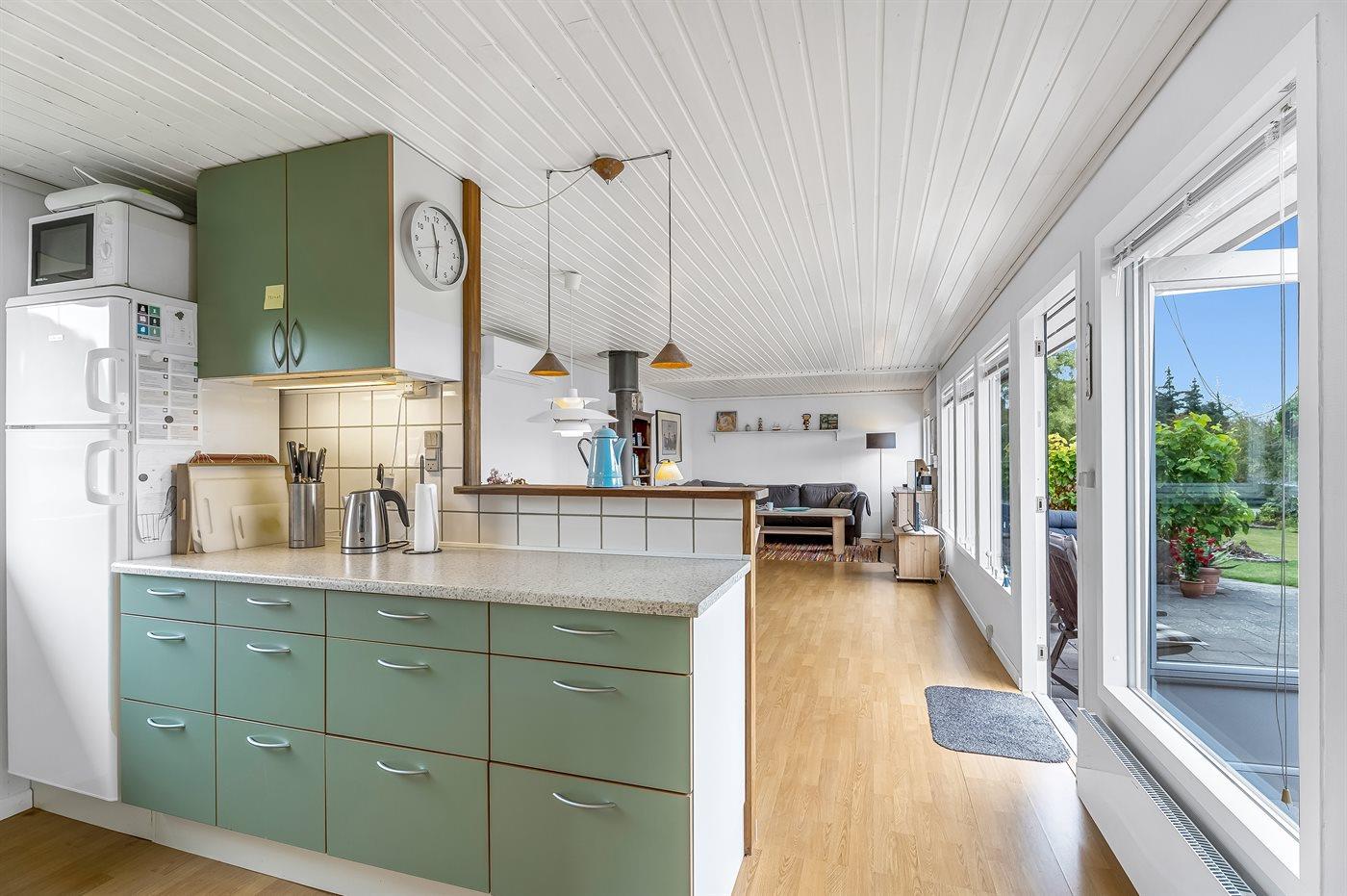 Køkkenet er udstyret med 1 køleskab. Der er 4 elkogeplader, varmluftovn, mikrobølgeovn samt opvaskemaskine.