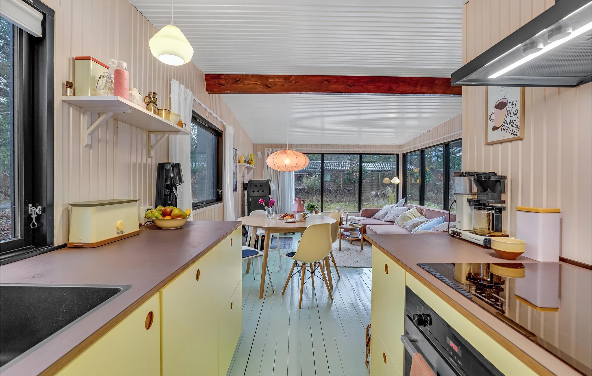 Hyggeligt sommerhus tæt på strand med moderne køkken og stor træterrasse til afslapning og grill.