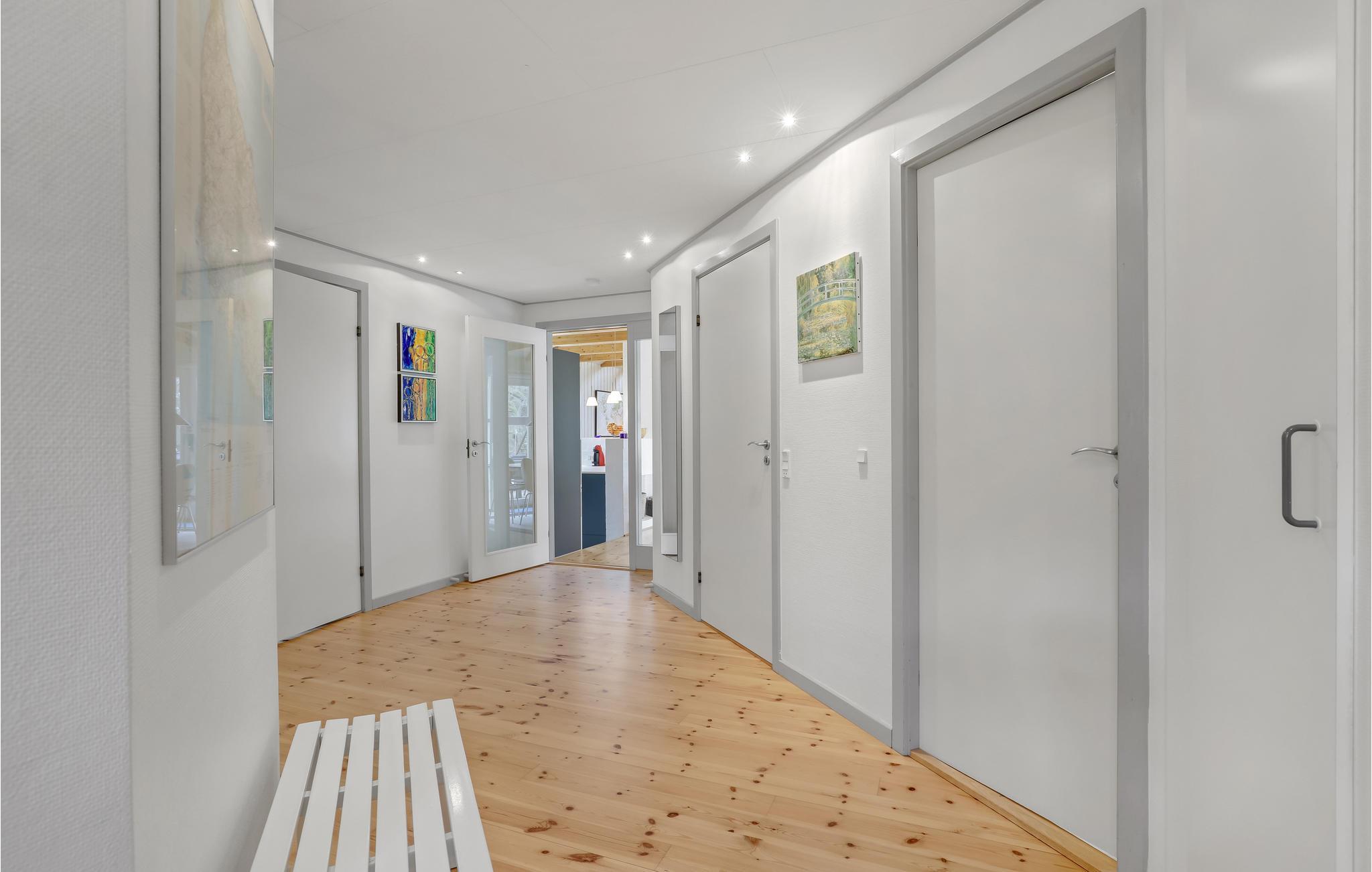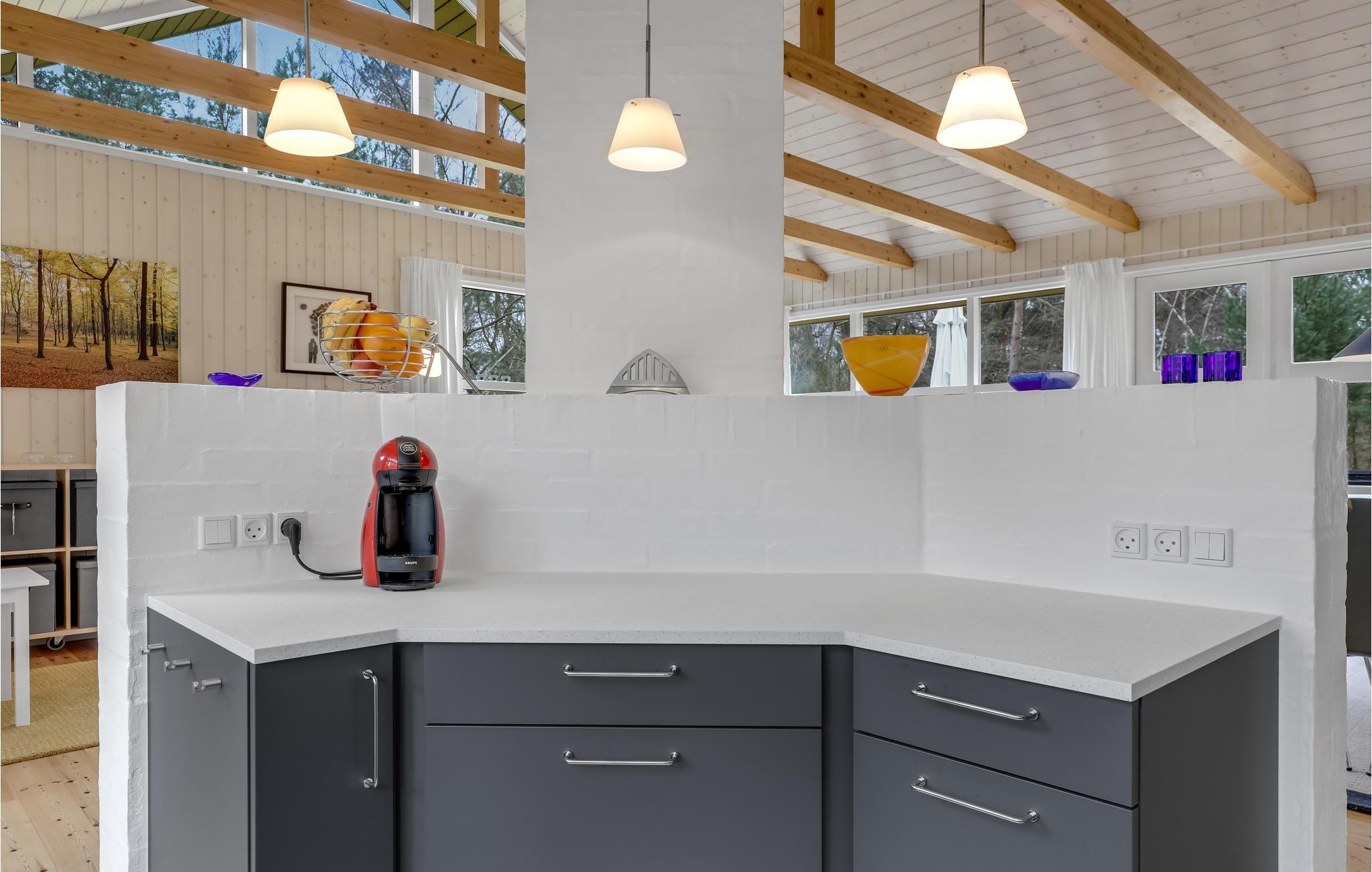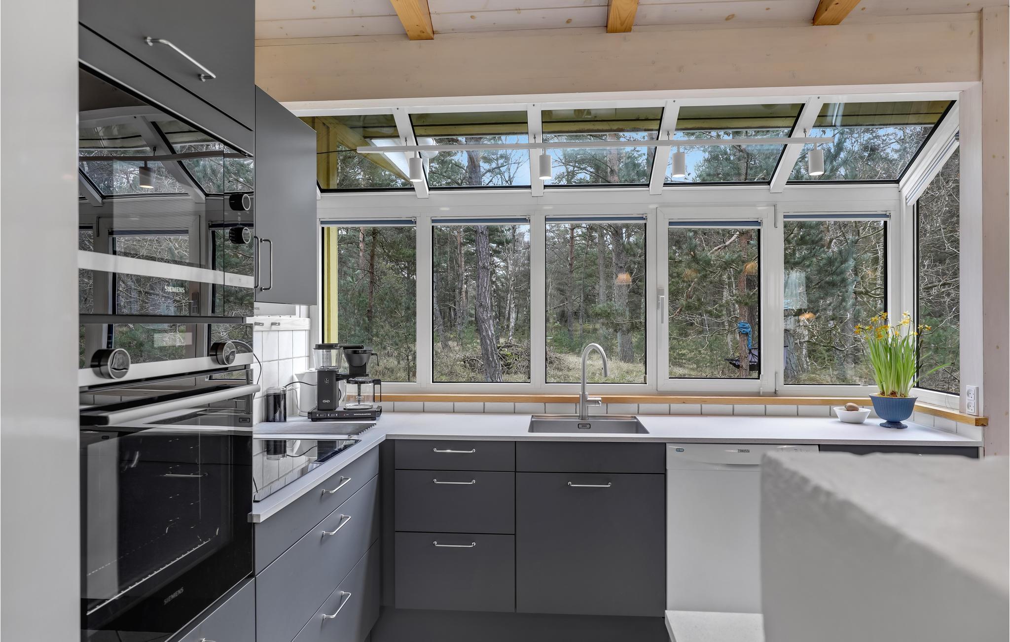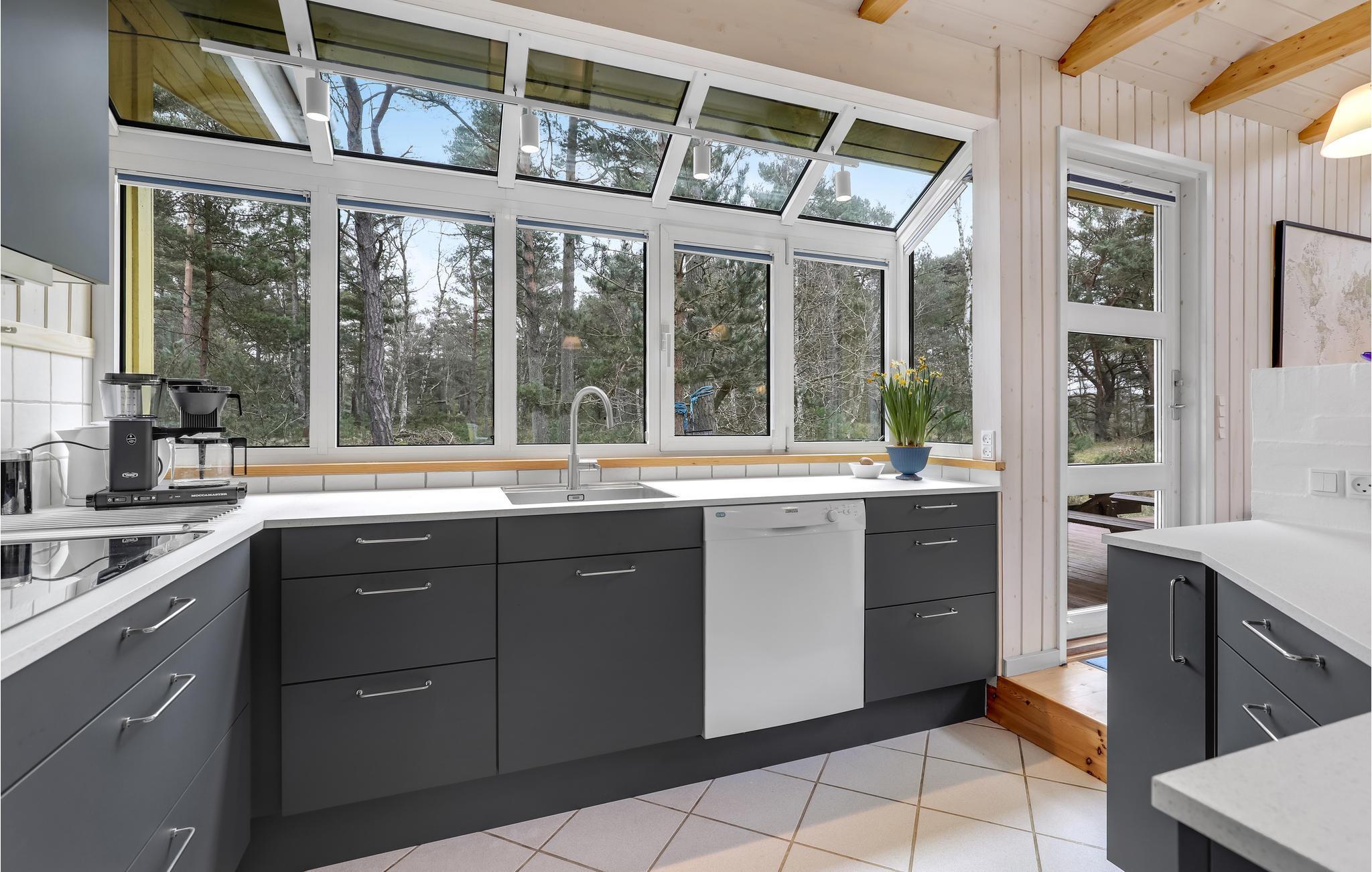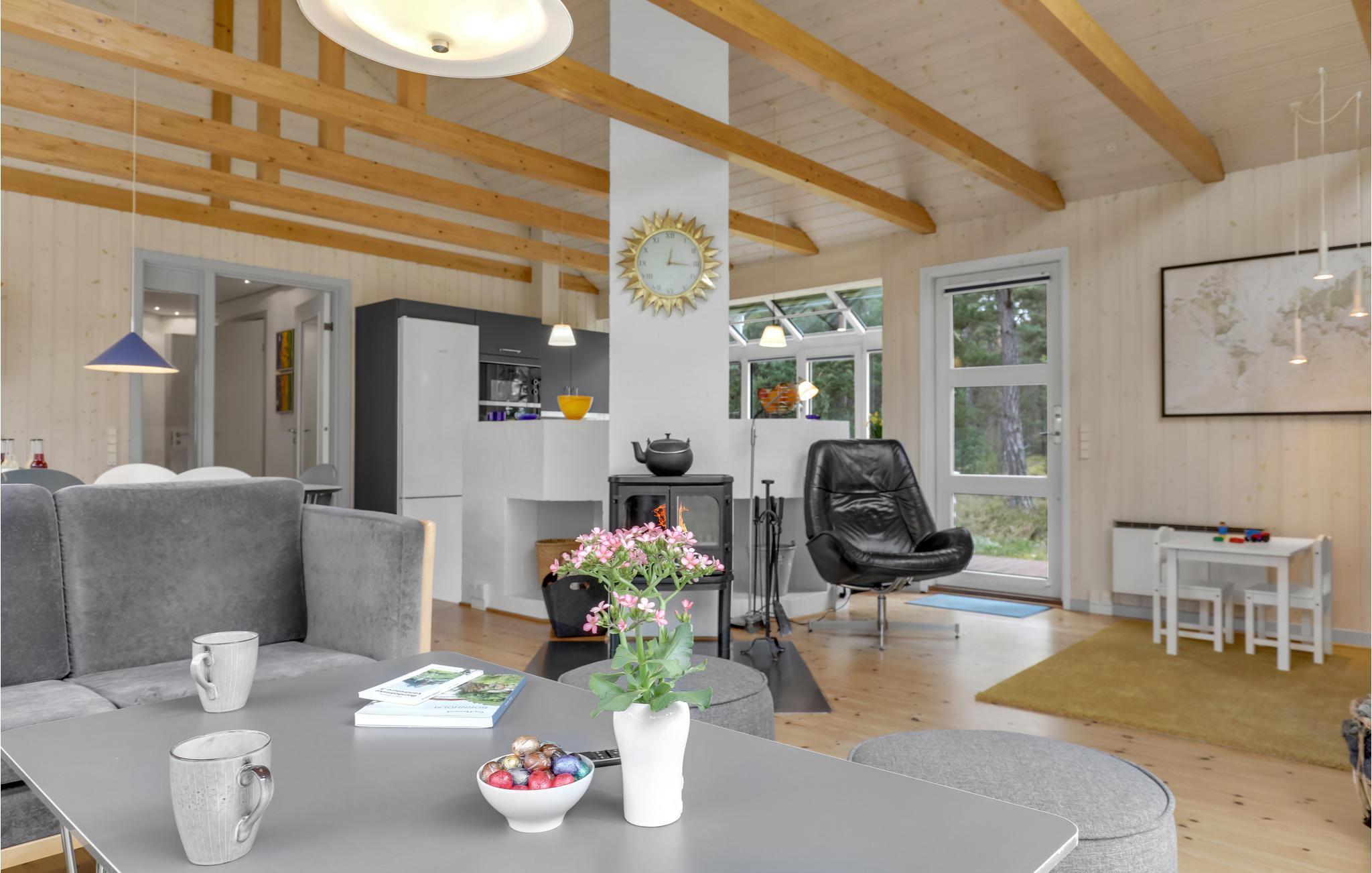 Velkommen til dette fine feriehus i en indbydende gul farve. Også indvendigt charmerer huset takket være smagfuld indretning, åbent til kip og synlige træbjælker i stuen og karnap i det åbne køkken. Store vinduespartier lukker dejligt meget dagslys ind i huset og giver et godt udsyn til de grønne omgivelser. I stuen kan I flade ud, mens I ser fjernsyn og i kølige sæsoner lytter til de knitrende flammer i brændeovnen. Her er også et børneområde. Huset har lademulighed til el-biler.