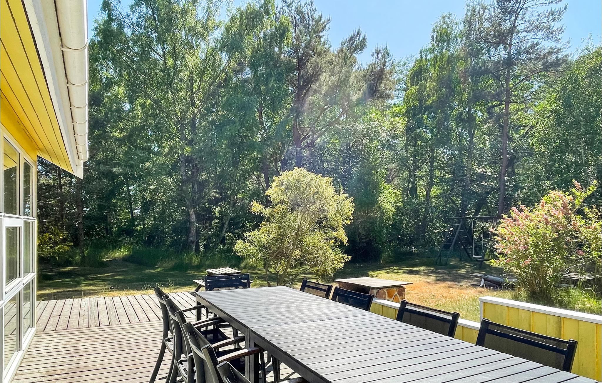 På den store terrasse, som omgiver tre af huset sider, kan I solbade fra liggestole, sidde sammen og spise jeres feriemåltider eller læse en god bog, mens I nyder den friske luft. I kan også tilberede lækre grillretter på grillen. Der er fin plads til fysisk udfoldelse omkring huset, og børnene vil elske gyngen og sandkassen.