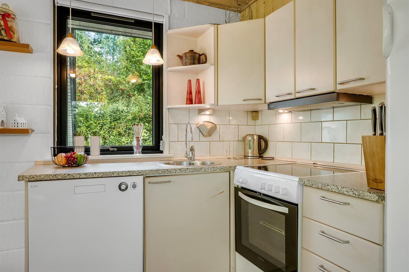 Køkkenet er udstyret med 1 køleskab. Der er 4 elkogeplader, varmluftovn samt opvaskemaskine.
