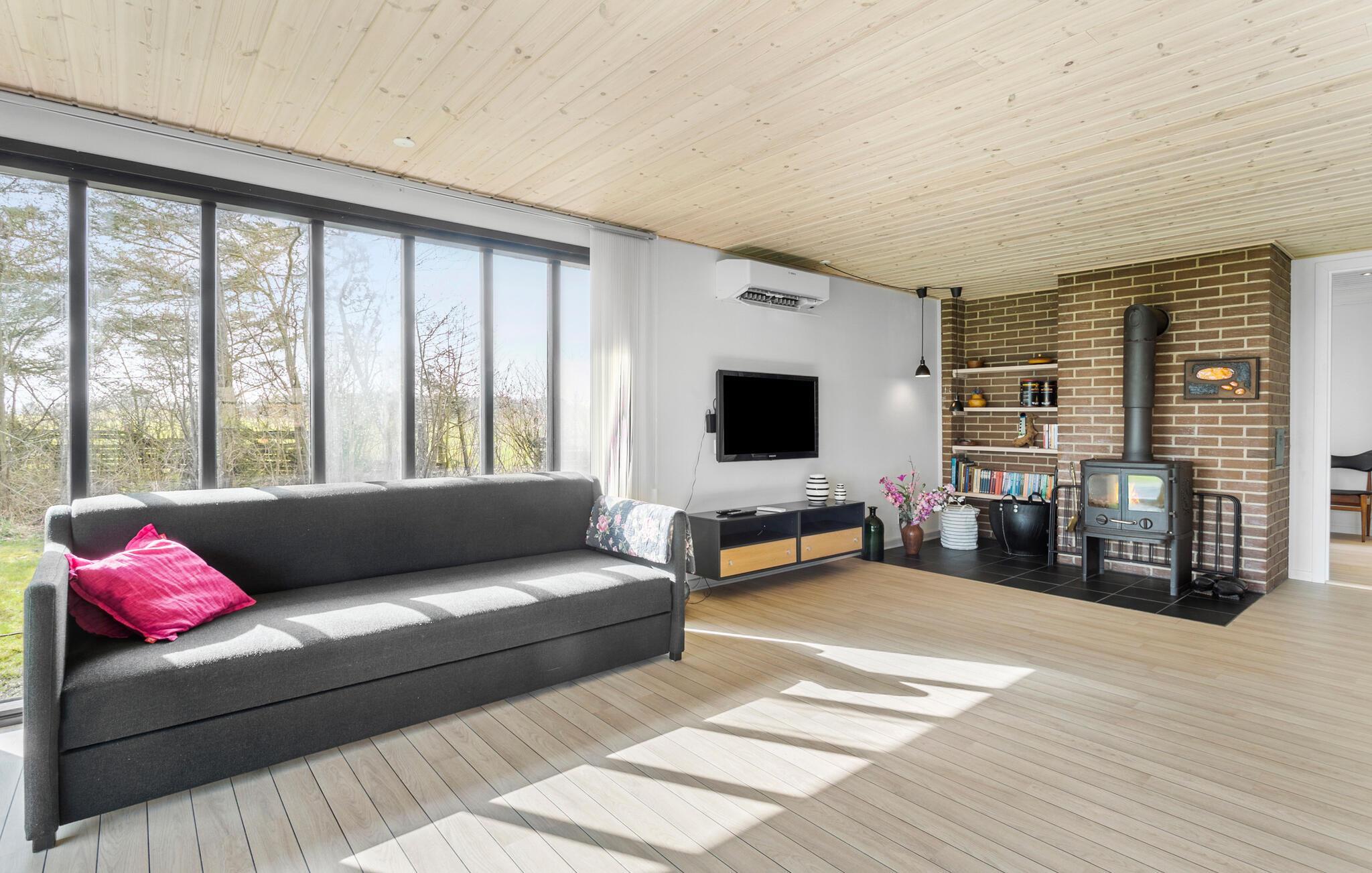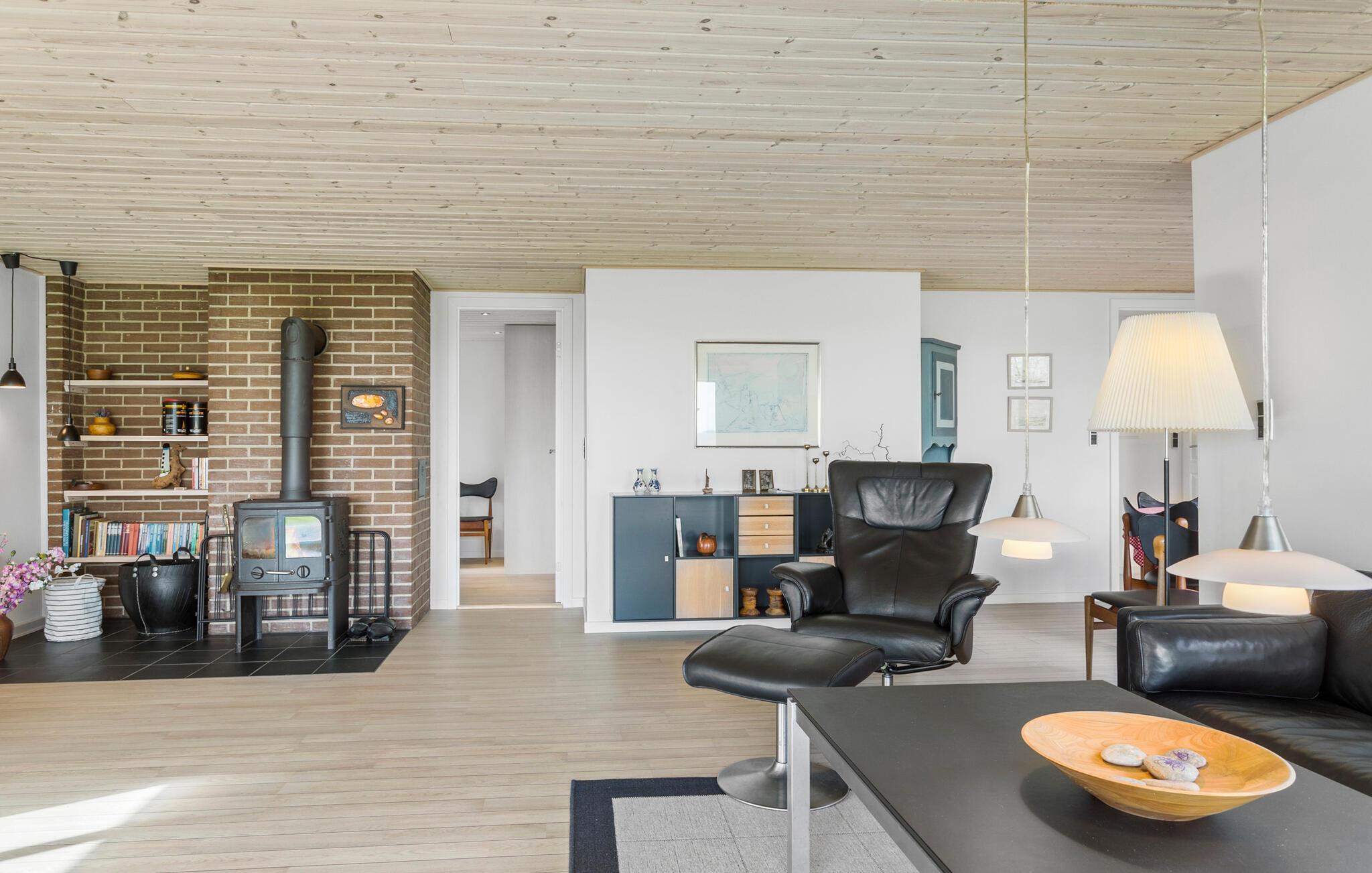 Huset ligger i rolige, landlige omgivelser tæt på Sundsøre Strand og midt i Sallings smukke natur. Indvendigt er huset virkelig flot, og indretningen byder på et vellykket af mix af rustikke murværk og moderne faciliteter, der gør jeres hverdag til en leg. Der kommer et dejligt lysindfald gennem gulv-til-loft-vinduerne, der samtidig giver en vidunderlig udsigt til fjorden. Hvem har brug for et tv, når I kan nyde en udsigt som denne fra sofaen? Når det så er sagt, er her også et tv, så køb blot nogle lækre snacks til en flere hyggelige filmaftener på de lidt køligere dage.