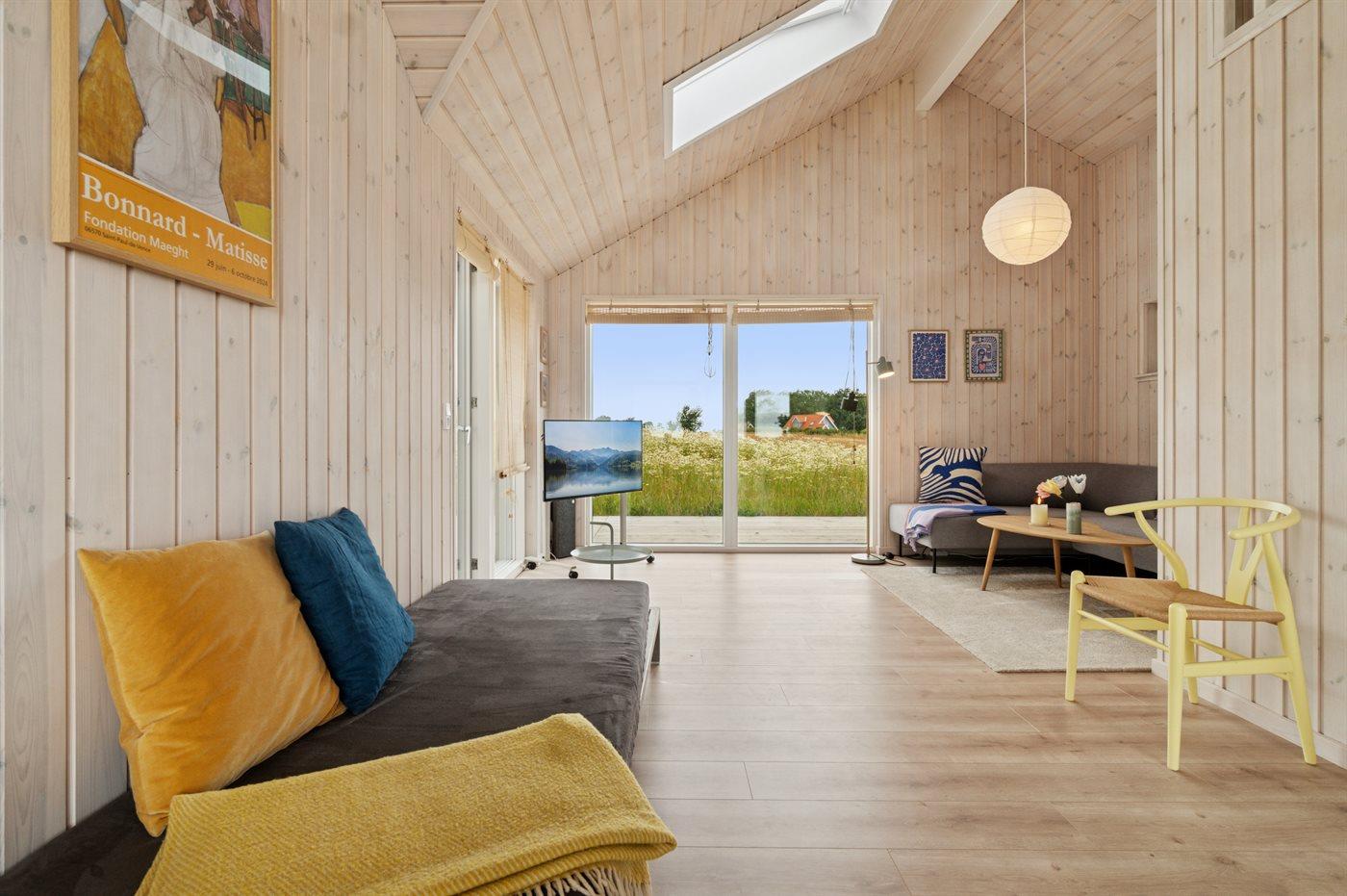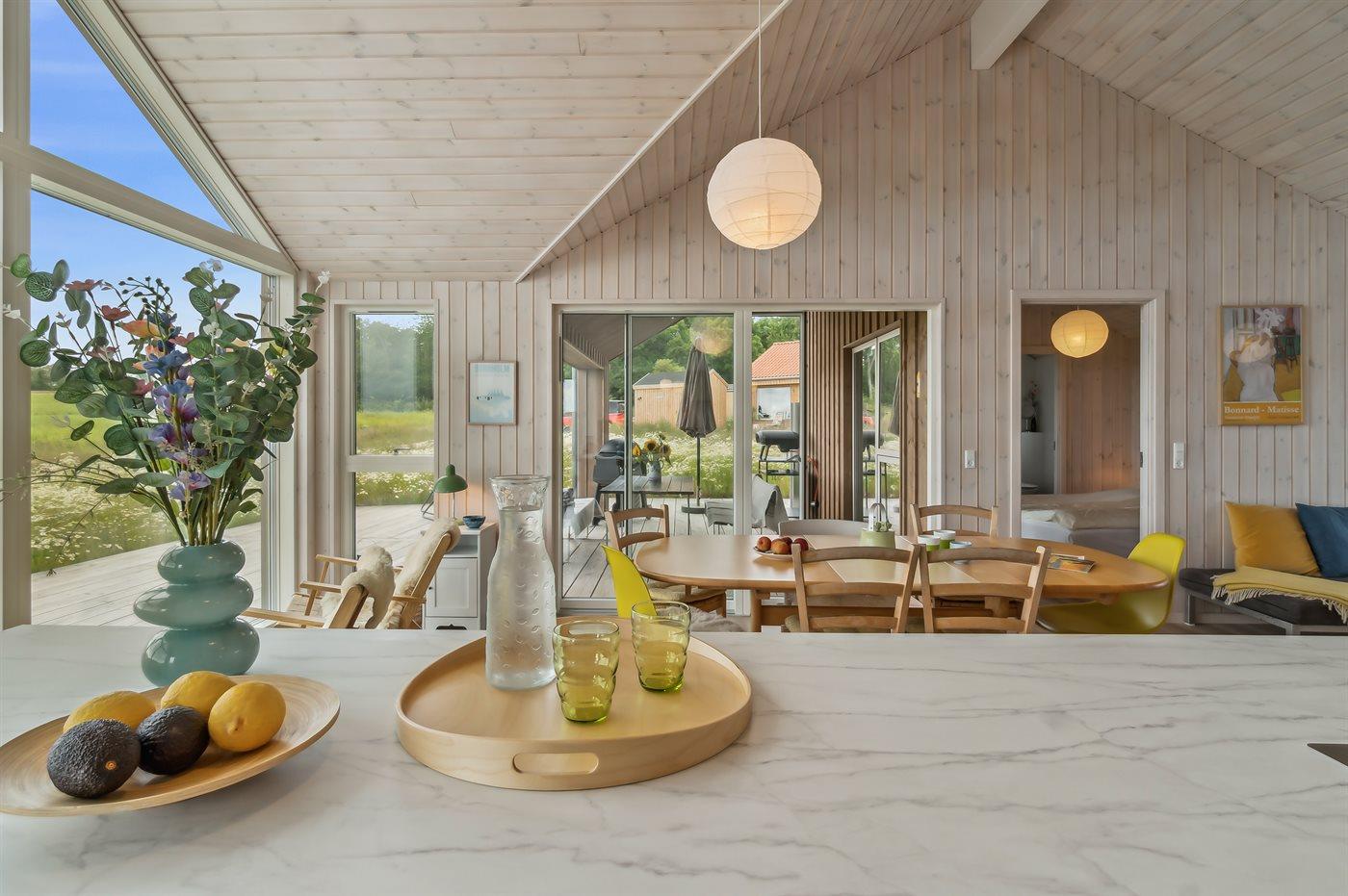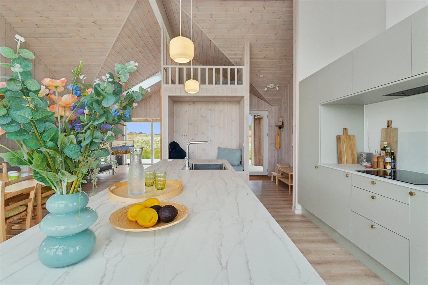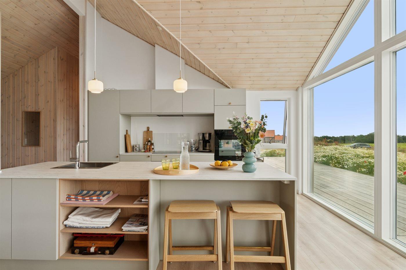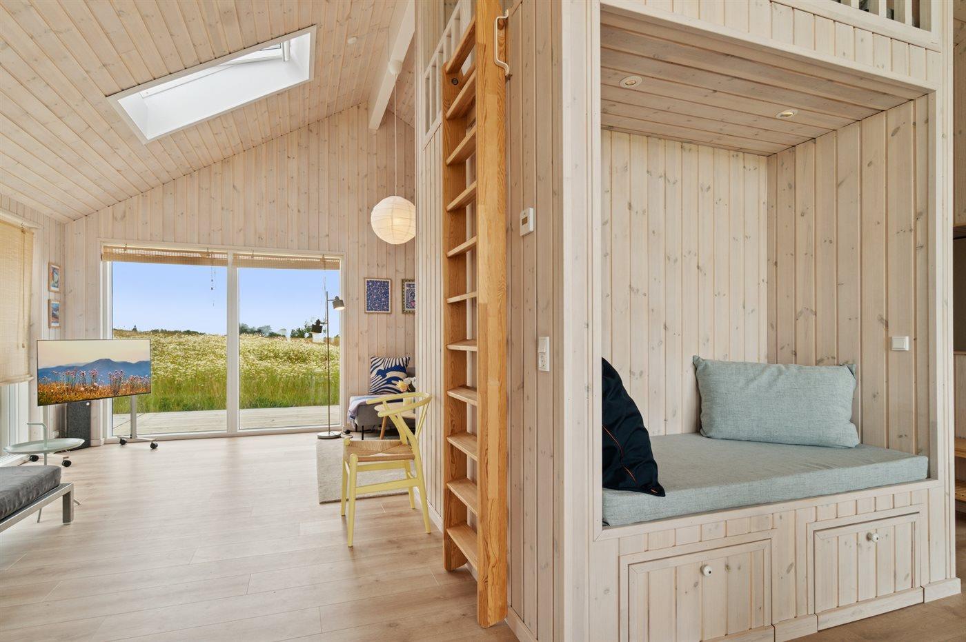 Sommerhusets hjerte er stuen med loft til kip og store panoramavinduer, så udsigten kan nydes i fulde drag. Det moderne køkken er velforsynet, og der er i det hele taget lagt vægt på god komfort i både møblering og også i husets indretning. På den store, hævede træterrasse kan man altid finde et sted med læ, og en del af terrassen er overdækket.