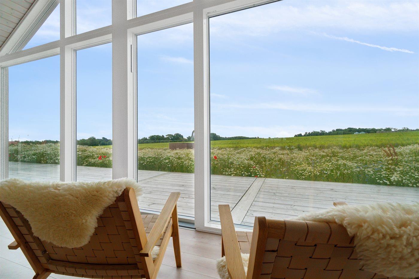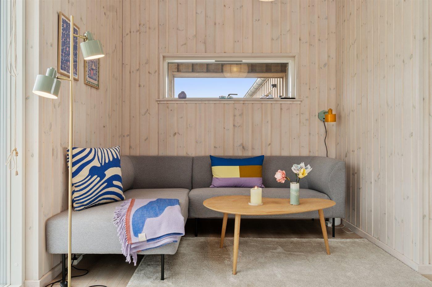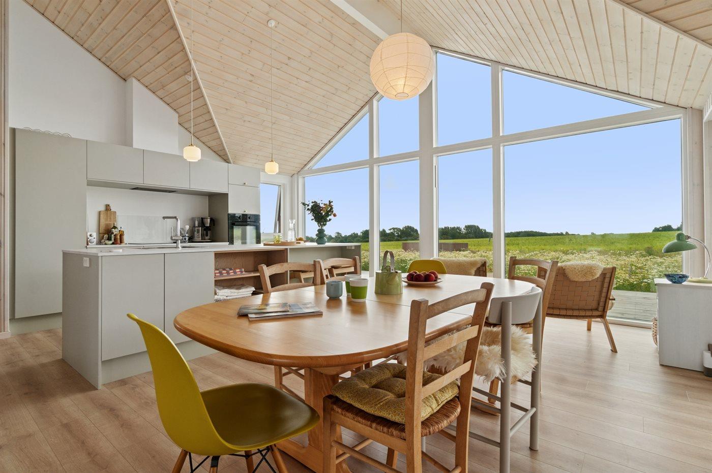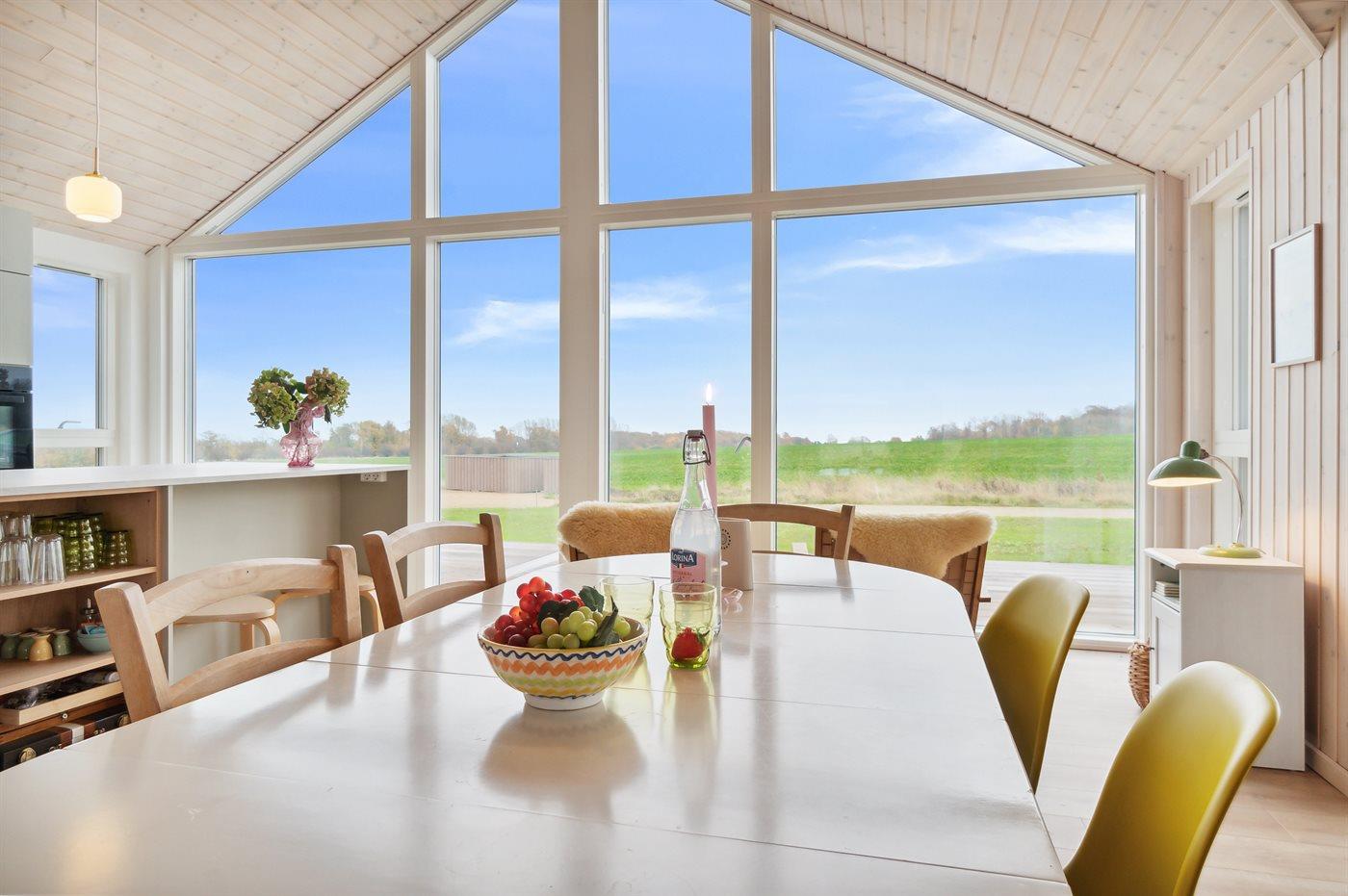 Sommerhusets hjerte er stuen med loft til kip og store panoramavinduer, så udsigten kan nydes i fulde drag. Det moderne køkken er velforsynet, og der er i det hele taget lagt vægt på god komfort i både møblering og også i husets indretning. På den store, hævede træterrasse kan man altid finde et sted med læ, og en del af terrassen er overdækket.