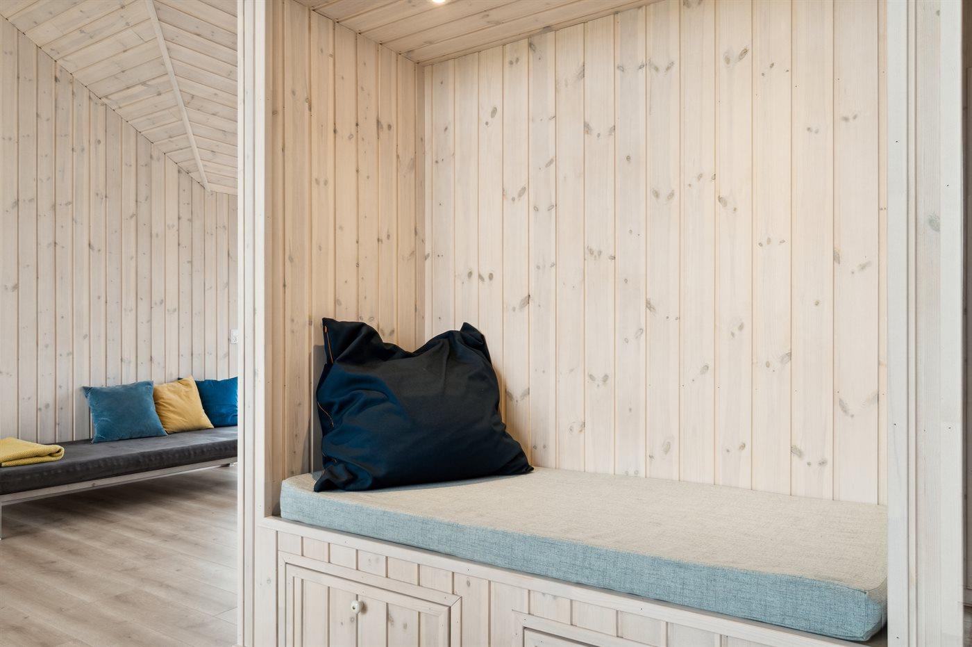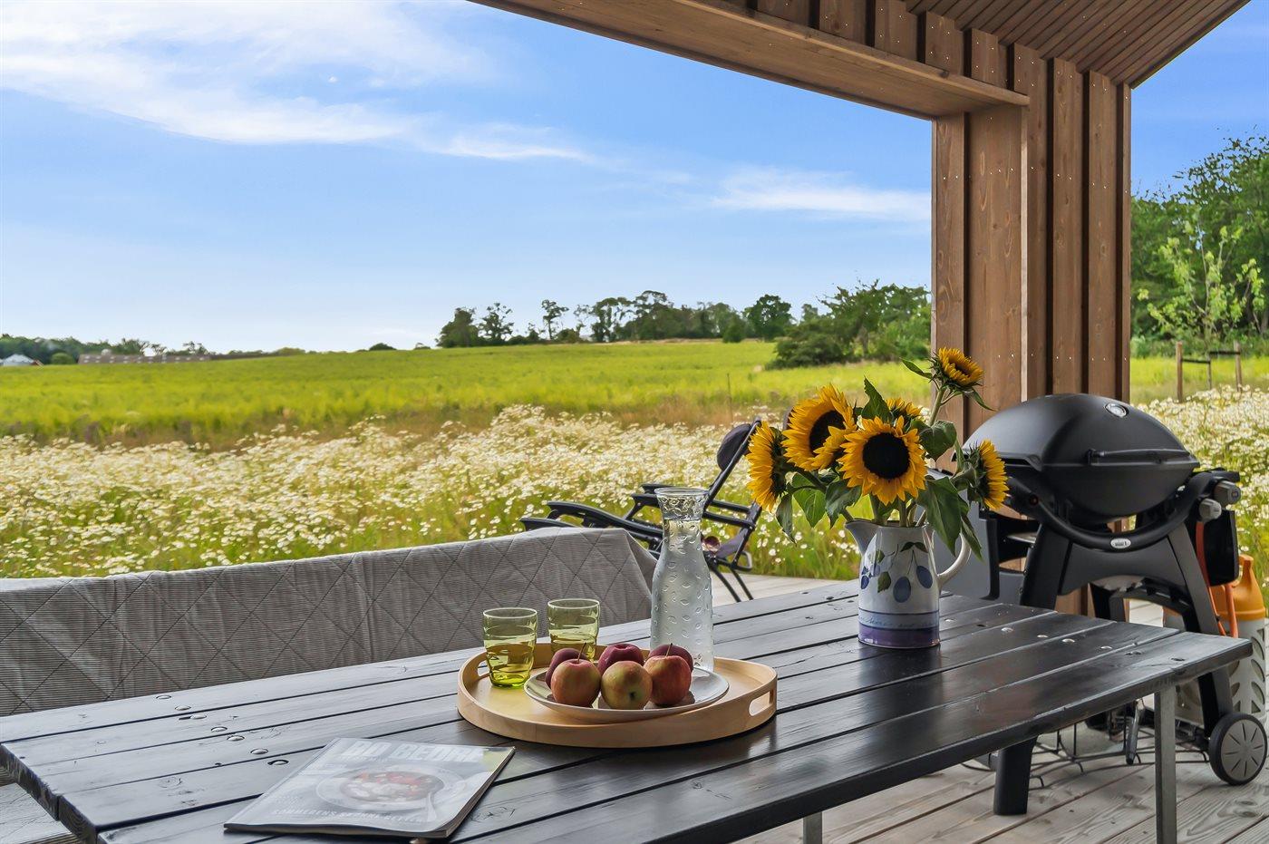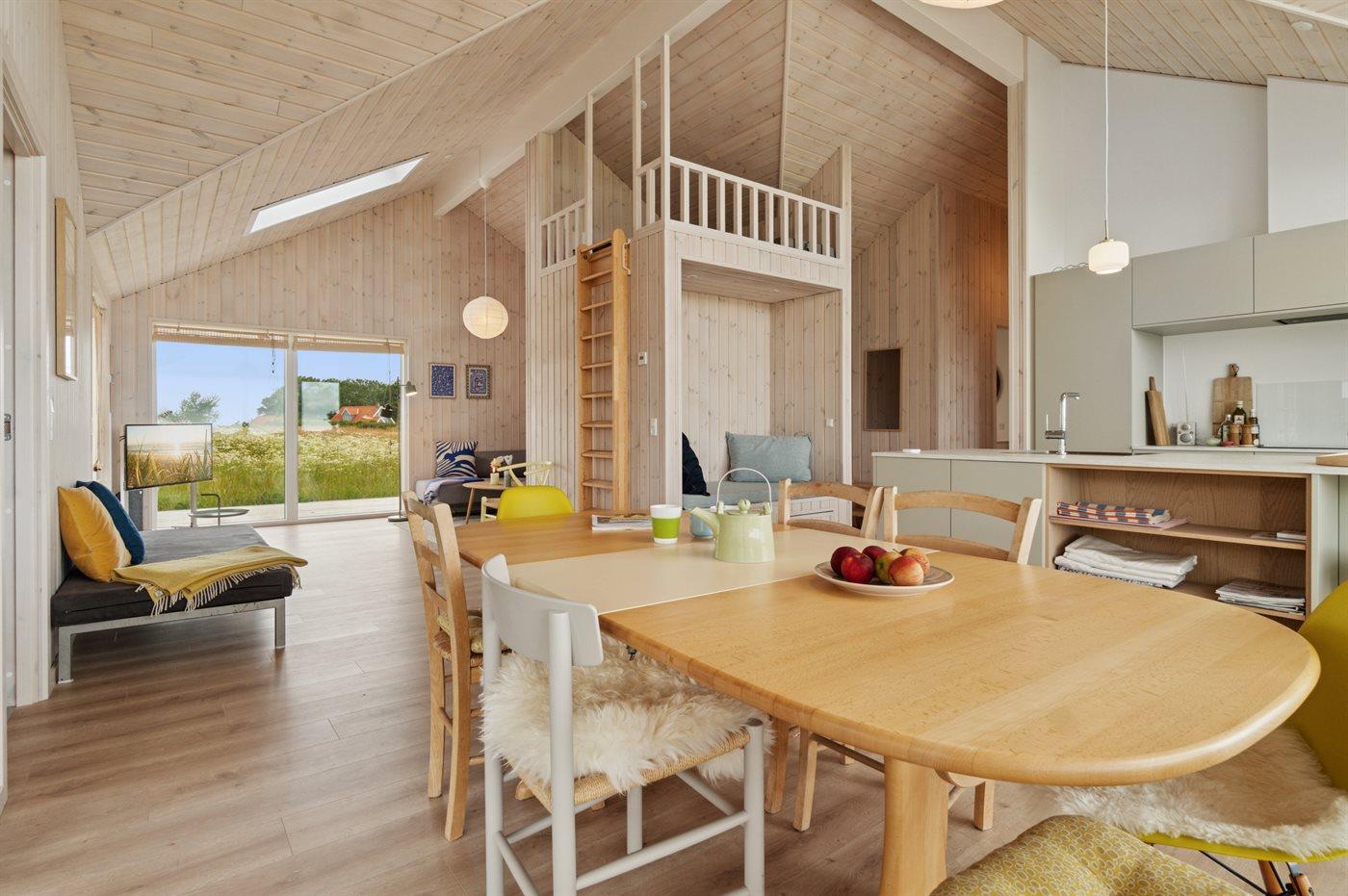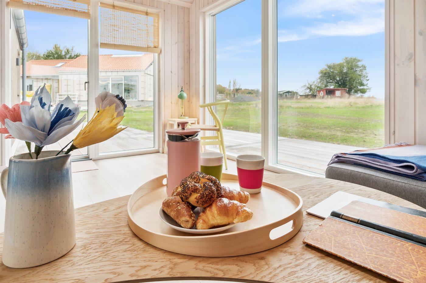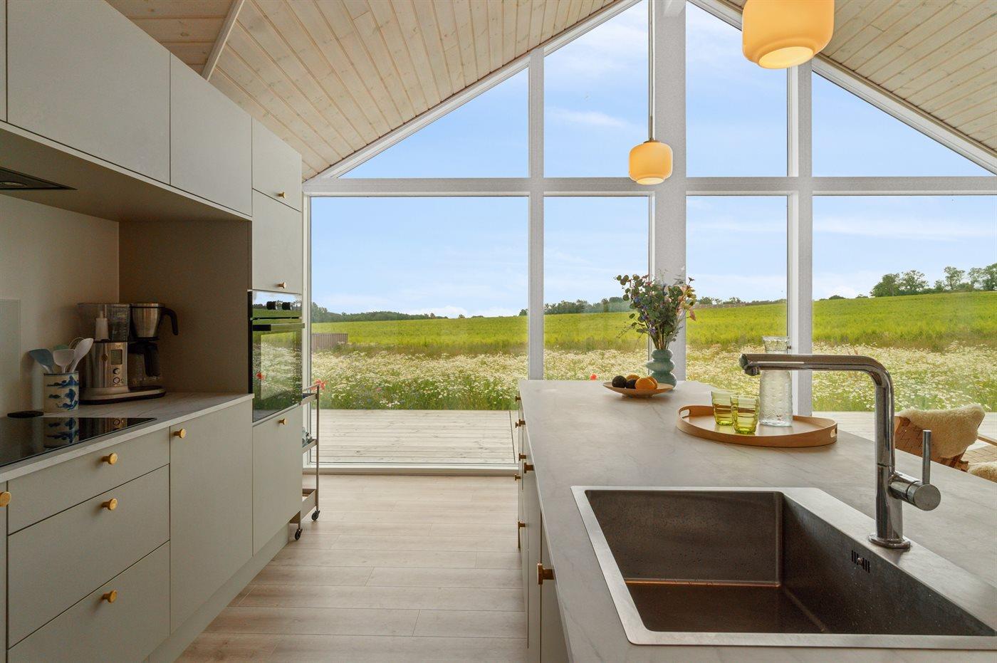 Sommerhusets hjerte er stuen med loft til kip og store panoramavinduer, så udsigten kan nydes i fulde drag. Det moderne køkken er velforsynet, og der er i det hele taget lagt vægt på god komfort i både møblering og også i husets indretning. På den store, hævede træterrasse kan man altid finde et sted med læ, og en del af terrassen er overdækket.