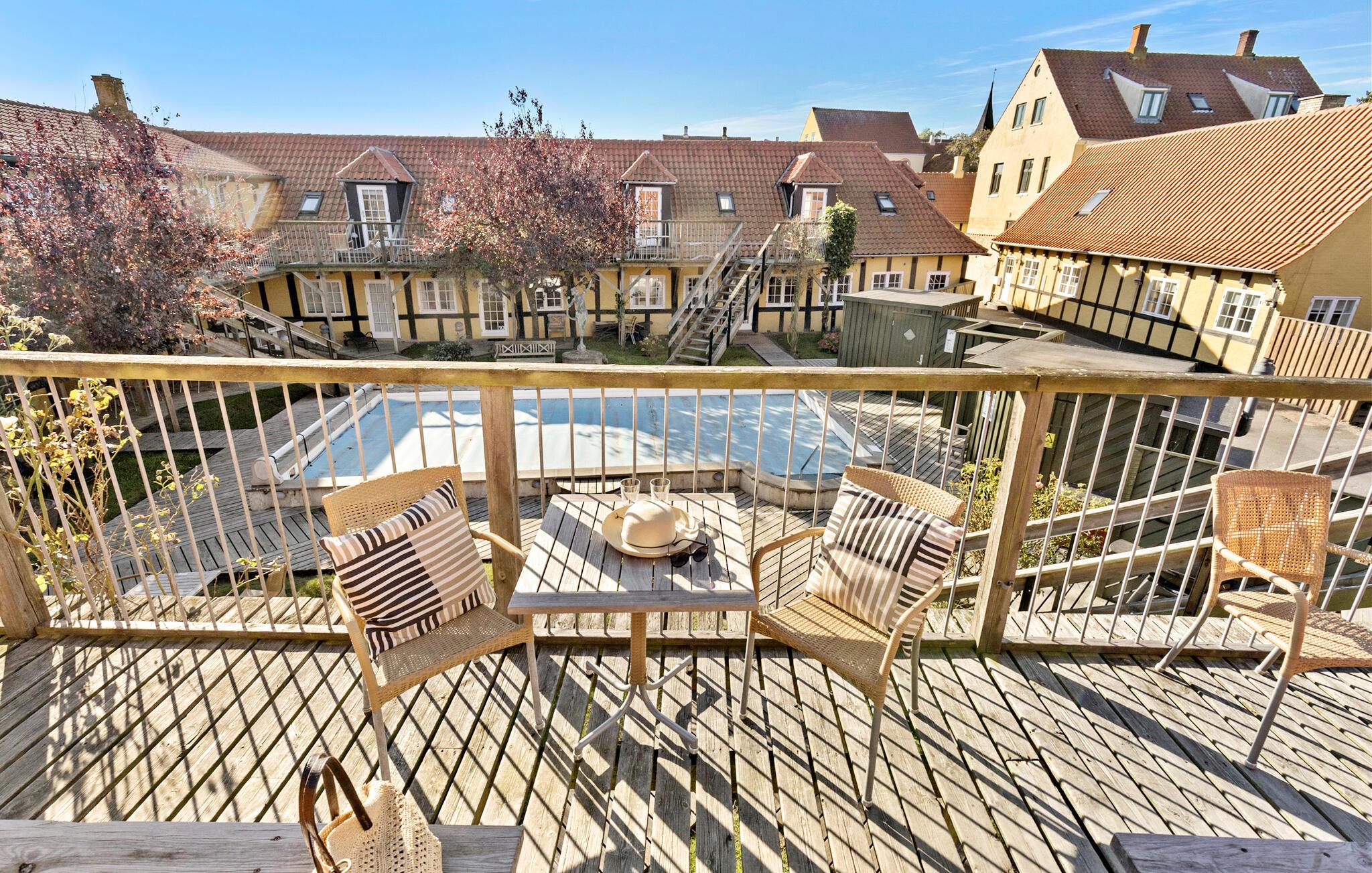 I et historisk bindingsværkshus ved havnen i Svaneke venter denne lyse og smagfuldt indrettede lejlighed på jer. Lad jer byde velkommen af den kærlige dekoration og de stilfulde møbler, som skaber en varm og behagelig atmosfære. Start dagen med en afslappet morgenmad på jeres balkon, efter måske at have taget et par svømmetag i poolen.