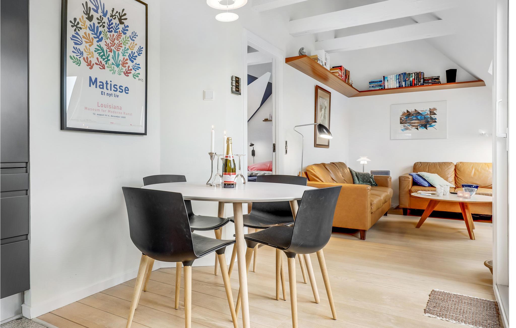 Fra den hyggelige opholdsstue er der udgang til en lille, solrig altan med havemøbler og et flot kig ud over byen. Hvis I vil grille en aften, kan I sætte jer til rette i den fælles gårdhave, hvor der også står havemøbler.