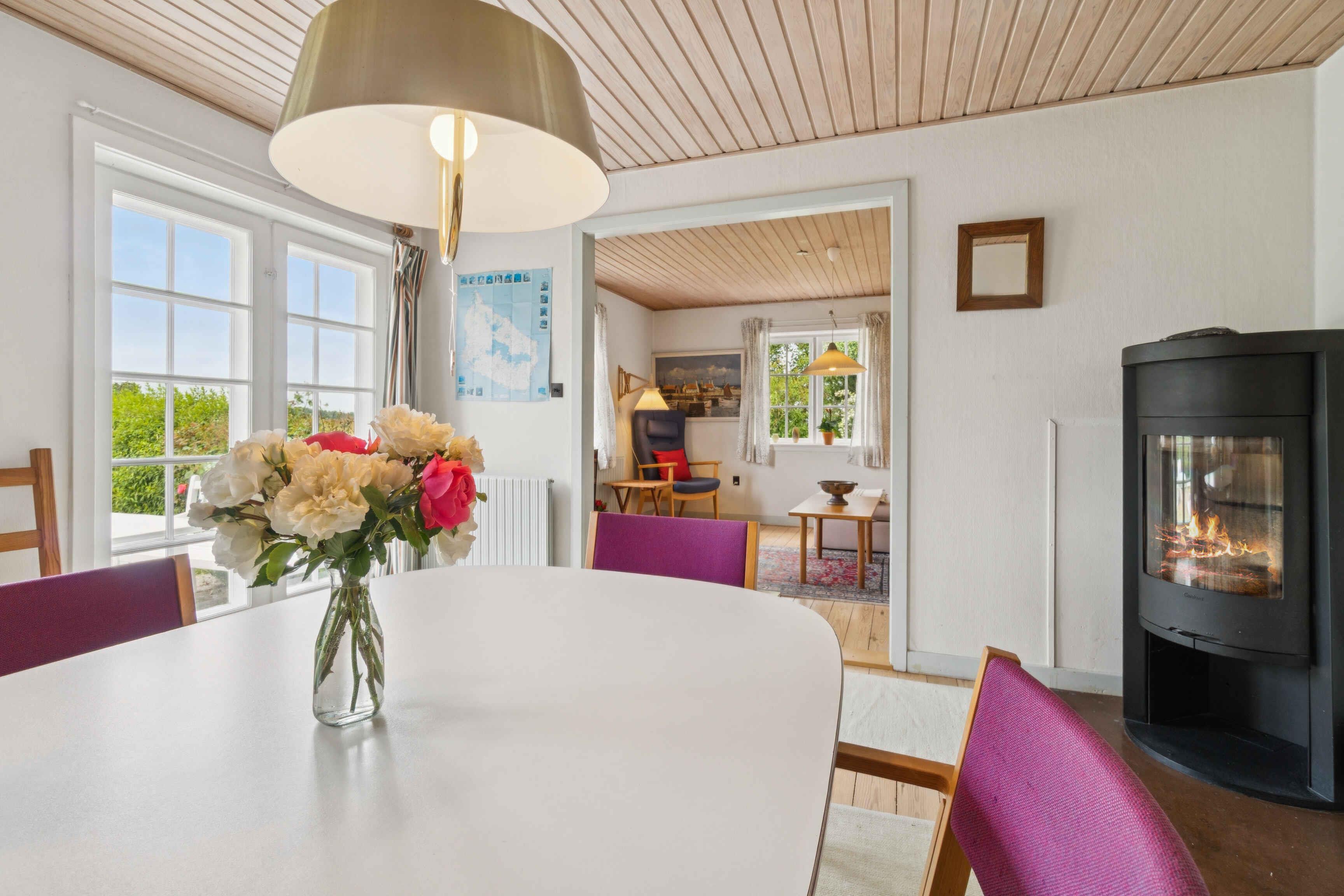 Dette rummelige feriehus på 130 m² har plads til hele familien med tre soveværelser og seks sovepladser. Her er der god mulighed for samvær og afslapning – både inde og ude. Huset er indrettet, så man hurtigt føler sig hjemme og har lyst til at blive. Huset er let at finde og har rigeligt med parkeringsplads til flere biler. Her bor man roligt og centralt. Den nærmeste offentlige transport ligger 3 km væk, men med bil er man godt kørende – og aldrig mere end 30 km fra øens yderste punkt. Inden for kort afstand ligger den hyggelige by Svaneke med spisesteder, røgeri og den børnevenlige strand Hullehavn. Lige i nærheden begynder Paradisbakkerne med flotte udsigter og gode vandrestier, som man faktisk kan nyde allerede fra huset. Bornholm byder på en sjælden variation i naturen. Oplev den dramatiske klippekyst mod øst, brede sandstrande mod syd, skovene i midten af øen og de majestætiske klipper ved Hammershus mod nord. Alle oplevelser ligger under en times kørsel fra huset. Hvis vejret driller, er der legeland og minigolf i Nexø – kun 6 km væk. Her finder man også fire supermarkeder og gode shoppingmuligheder. Man er tæt på alt det, der gør ferie nemt og rart – uden at gå på kompromis med ro og natur. Bliver man hjemme, er der skabt rum til afslapning. Udelivet kan nydes på terrassen, og indenfor er der plads til spil, madlavning og hygge. Huset danner en tryg og velfungerende ramme for en ferie på tværs af generationer. Obs, udlejes ikke til erhversmæssigt brug.