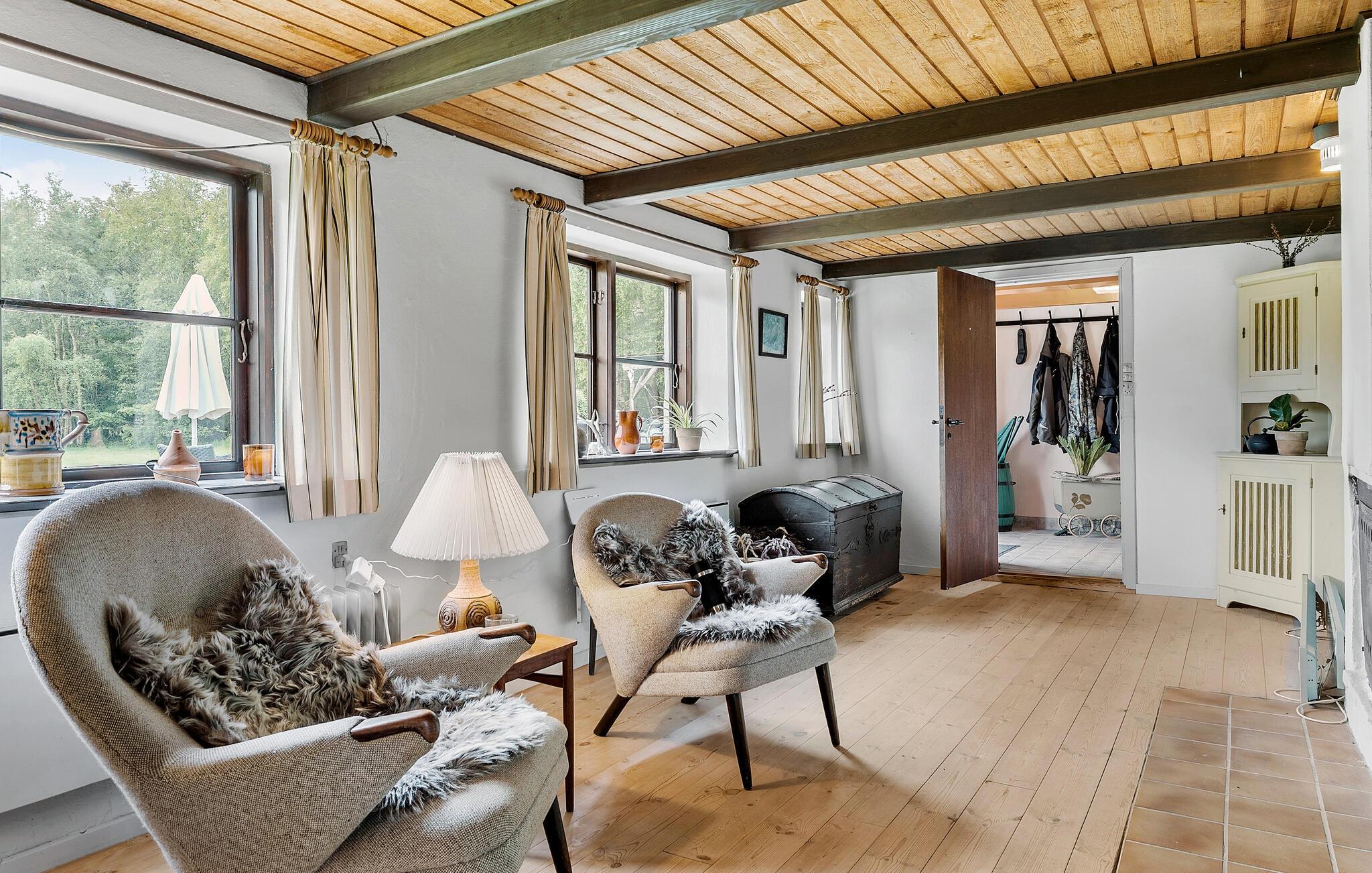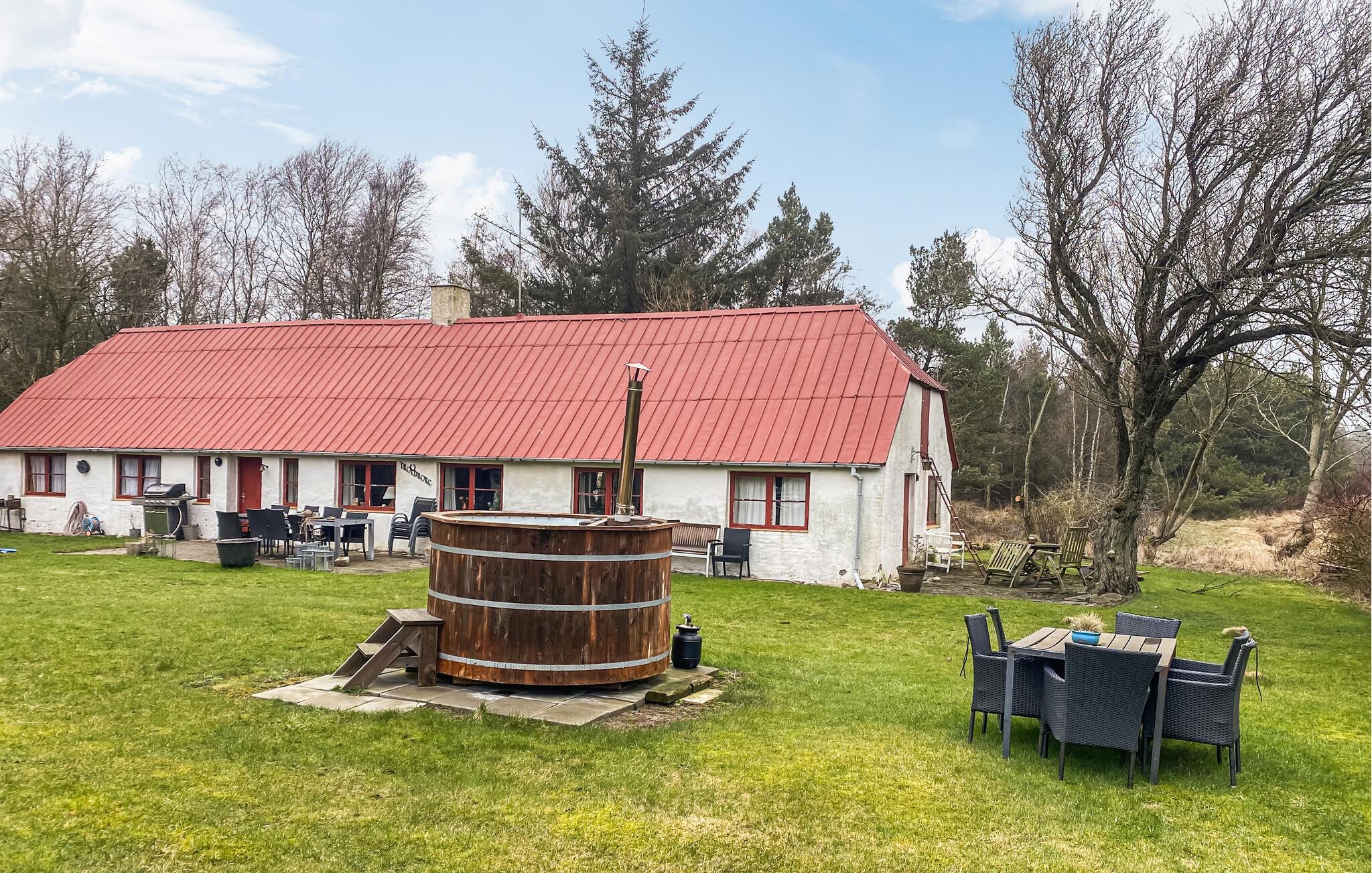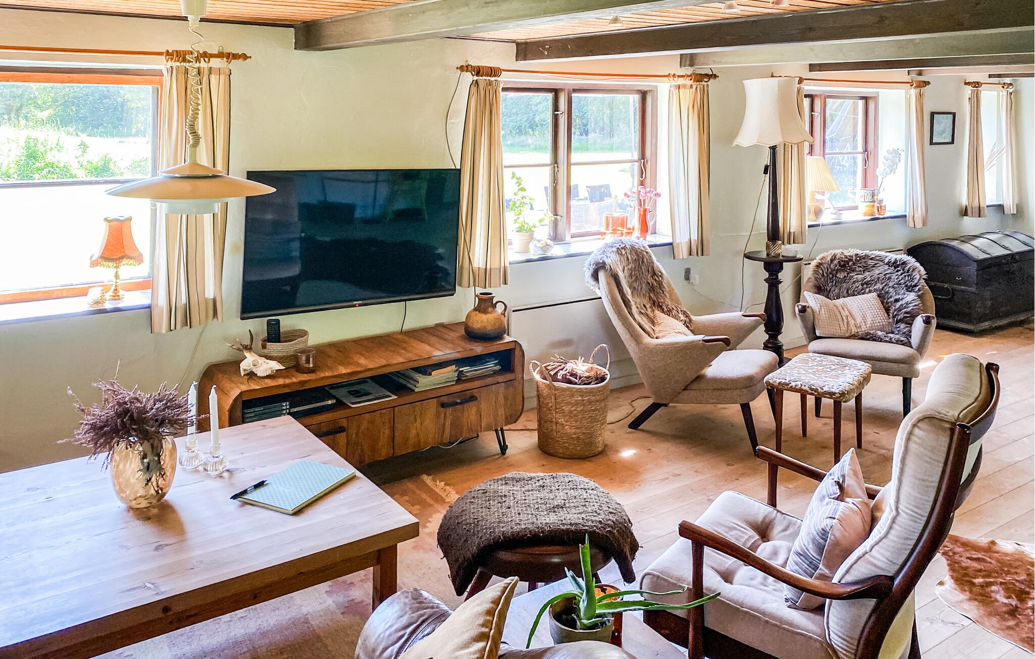 Hvis I er på udkig efter en feriebolig med plads til den store familie eller to vennefamilier, og prioriterer I naturskønne omgivelser over komfort, er I kommet til det helt rette sted. Dette rummelige hus ligger midt i den grønne natur på en vidunderlig stor grund, og her får I både inde som ude rigelig med plads at boltre jer på selv som større flok. Indretningen fremtræder pænt og rustikt med varme trælofter, rå murstensvægge og gode møbler, der gør det nemt at slappe af med det samme, I ankommer. Hvis vinden bider lidt fra sig, kan I tænde op i brændeovnen og nyde dens knitrende varme til madlavningen i funktionelle køkken og måltiderne ved det fine spisebord af træ, inden I runder af med snacks og en god film i sofahjørnet.