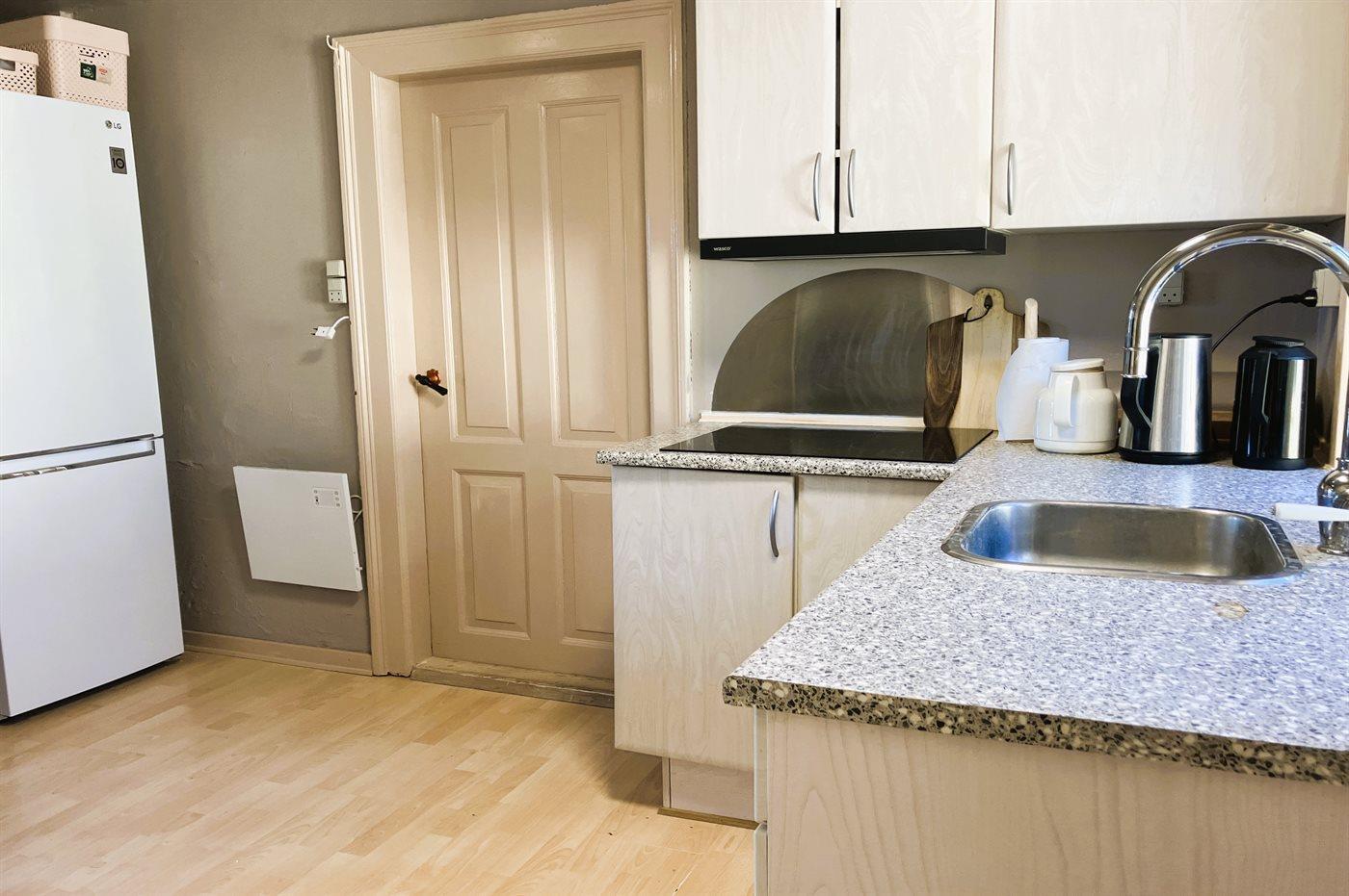 Køkkenet er udstyret med 1 køleskab. Der er 4 keramiske kogeplader, varmluftovn, mikrobølgeovn.