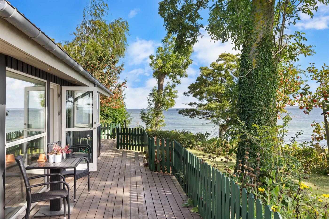 Fra både huset og terrasserne, som ligger højt, er der udsigt helt til Langeland. Fra huset fører en trappe ned til en hyggelig terrasse ved vandet, og videre ad en trappe er der direkte adgang til stranden.