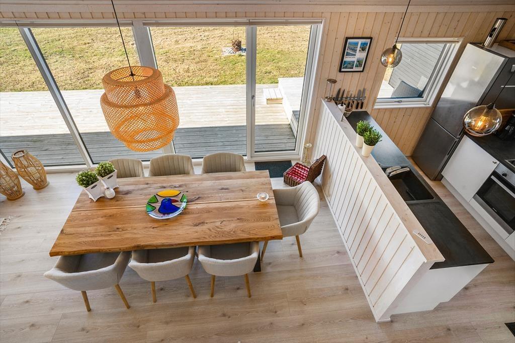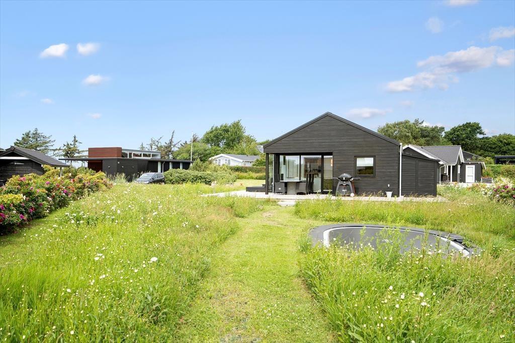 Fra stuen er der direkte udgang til delvis overdækket træterrasse og her kan I nyde de lune dage og aftener. Når mørket sænker sig, kan I trække ind under den overdækkede del af terrassen og nyde stilheden og nattehimlen med et glas vin eller en kop kaffe. I haven er der en nedsænket trampolin til ungerne. Ferien her indbyder til dage på stranden med badning og naturoplevelser.