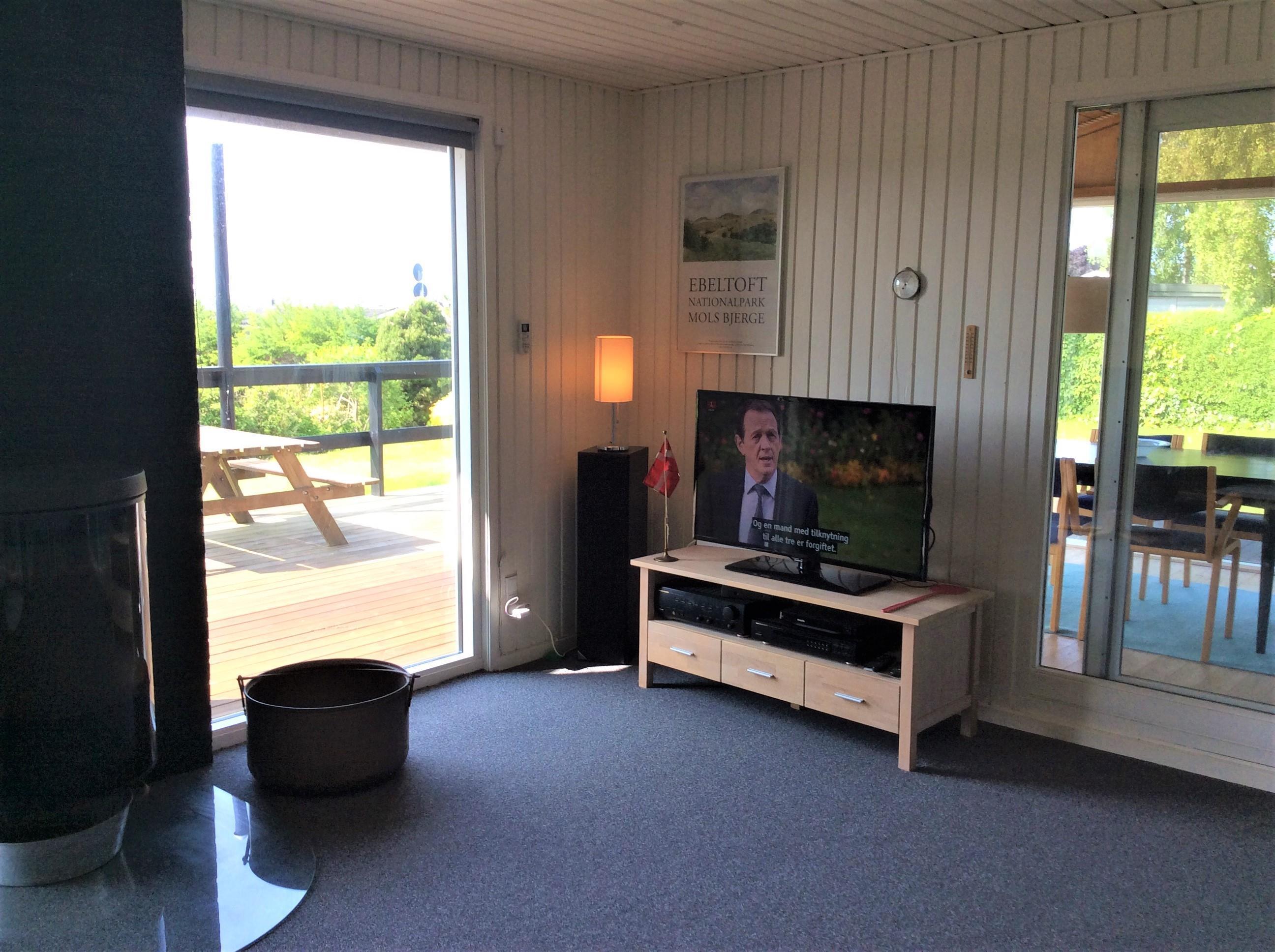 Huset har en skøn havestue med store vinduer, hvor man kan sidde og nyde udsigten, hvis det ikke lige er terrassevejr. Her er også en fin stue med brændeovn i åben forbindelse med køkkenet, der er godt udstyret med bl.a. opvaskemaskine og mikroovn. Køkkenet har en halvdør direkte ud til terrassen. Her er parabol og adgang til tyske TV-kanaler.