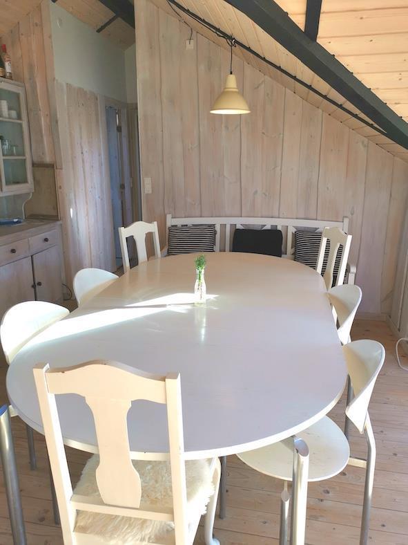 I stuen er der både spise- og opholdsplads og loft til kip, hvilket giver en god rumfornemmelse. Der er også ovenlysvinduer og derfor et helt særligt lysindfald. Huset har brændeovn og varmepumpe. Der er en Chromecast, så man kan se TV via egen udbyder, og der er også fibernet, så det er muligt at spille på en medbragt playstation/PC.