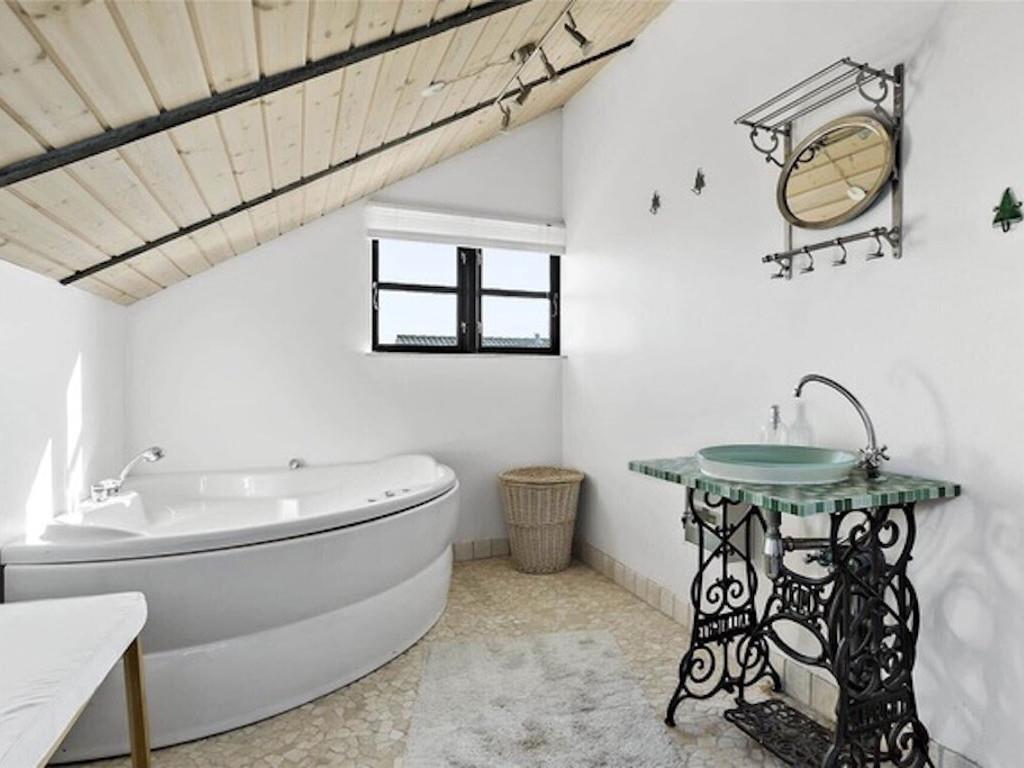 Huset har et charmerende badeværelse med fine detaljer og med hjørnespa, væghængt toilet og et godt brusehjørne.