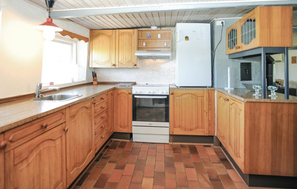 Tilbring tid i det traditionelt indrettede interiør med masser af træ og enkle, hyggelige møbler. Den kombinerede opholds- og spisestue er udstyret med komfortable siddepladser, et tv og et stort spisebord. I det separate køkken med klassiske træskabe finder I alt, hvad I behøver til selvforplejning. Udnyt den rolige atmosfære til at slappe af med en bog eller brætspil.